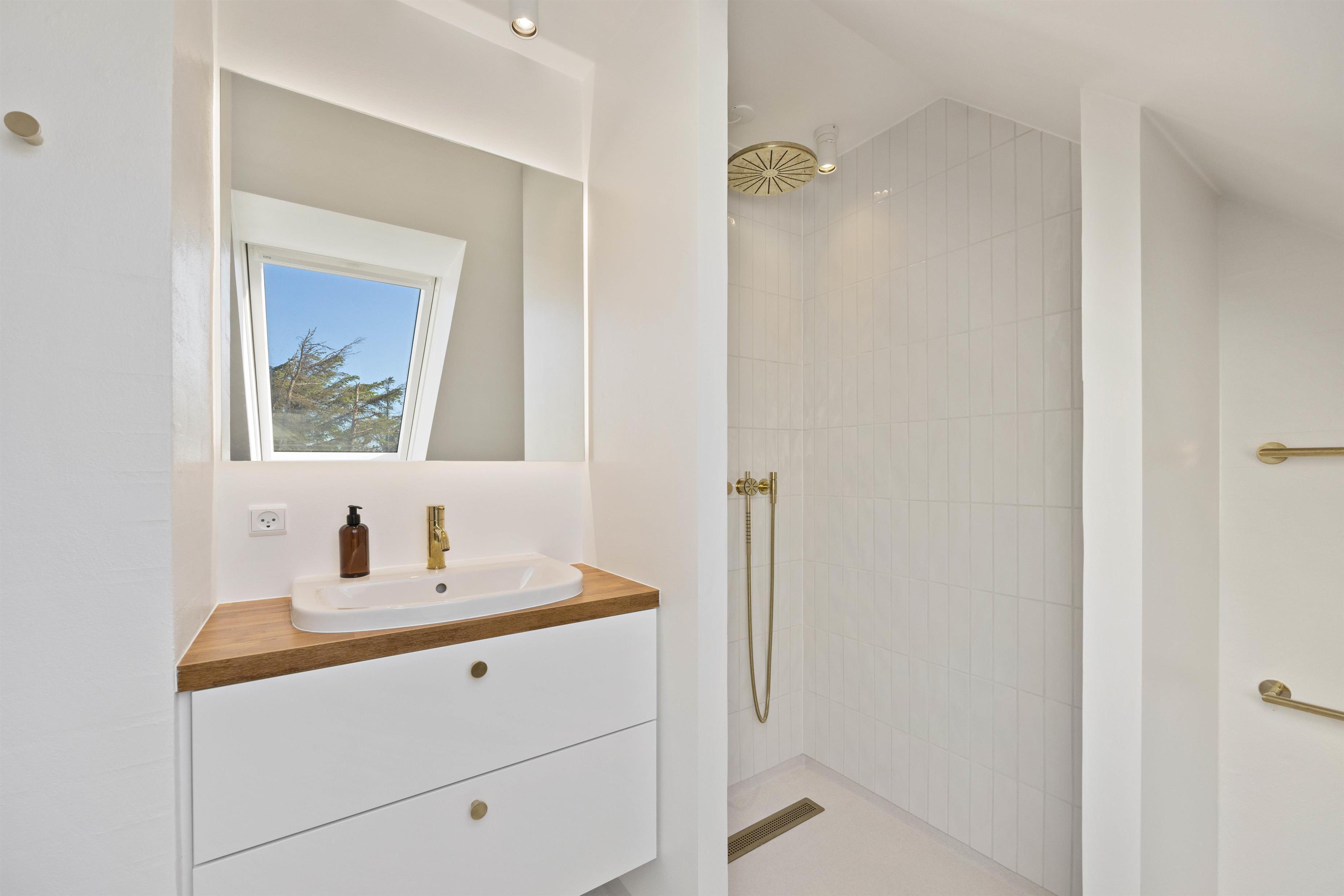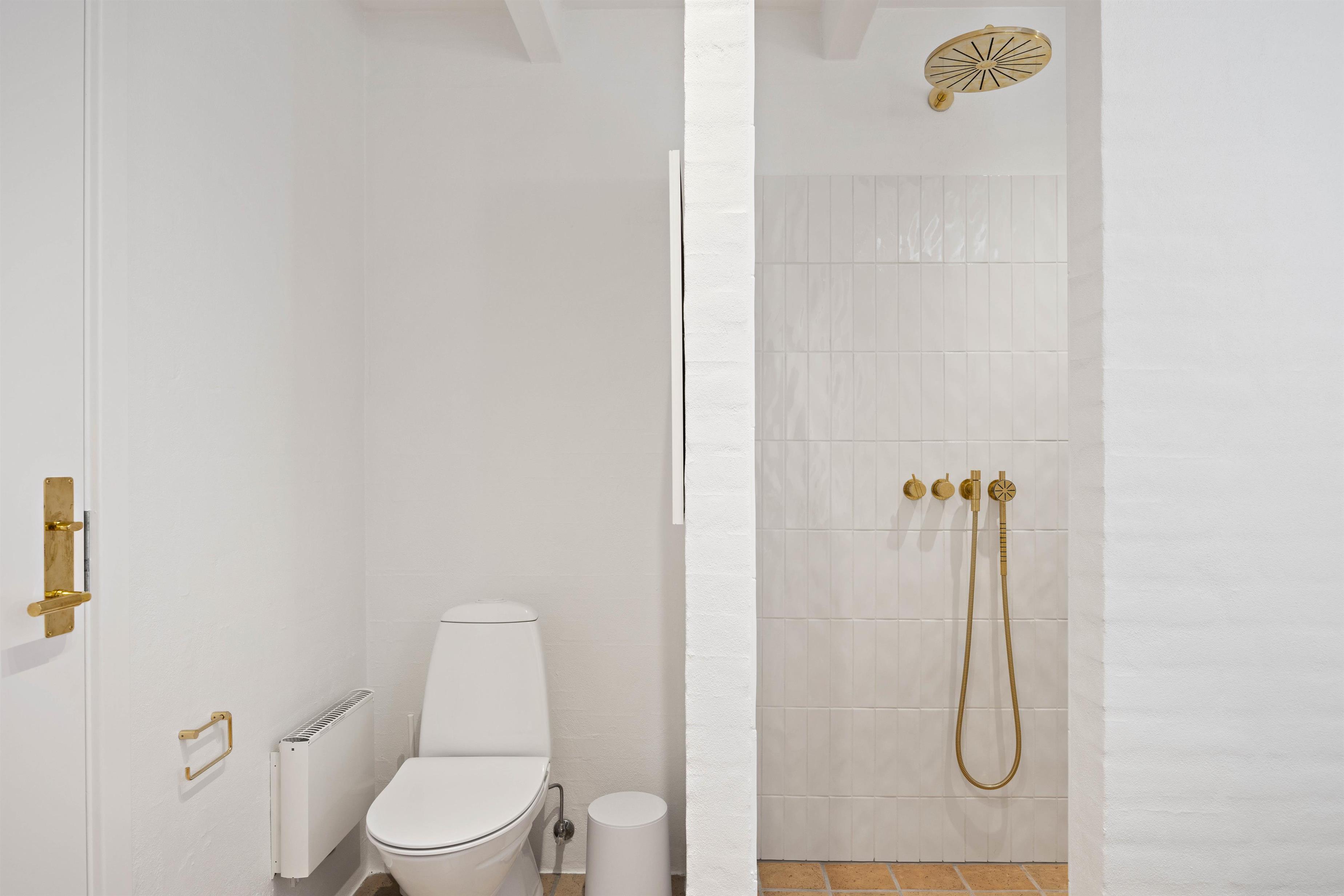 Ligeledes indeholder feriehuset også to badeværelser, et ovenpå og et nedenunder. Begge badeværelser er smukt renoveret, med flotte nye bademøbler, messingdetaljer og lækker rainshower bruser. Med et badeværelse på begge etager, giver dette igen også gode muligheder for at kunne indrette sig helt som man ønsker. Badeværelset nedenunder er også udstyret med gulvvarme.