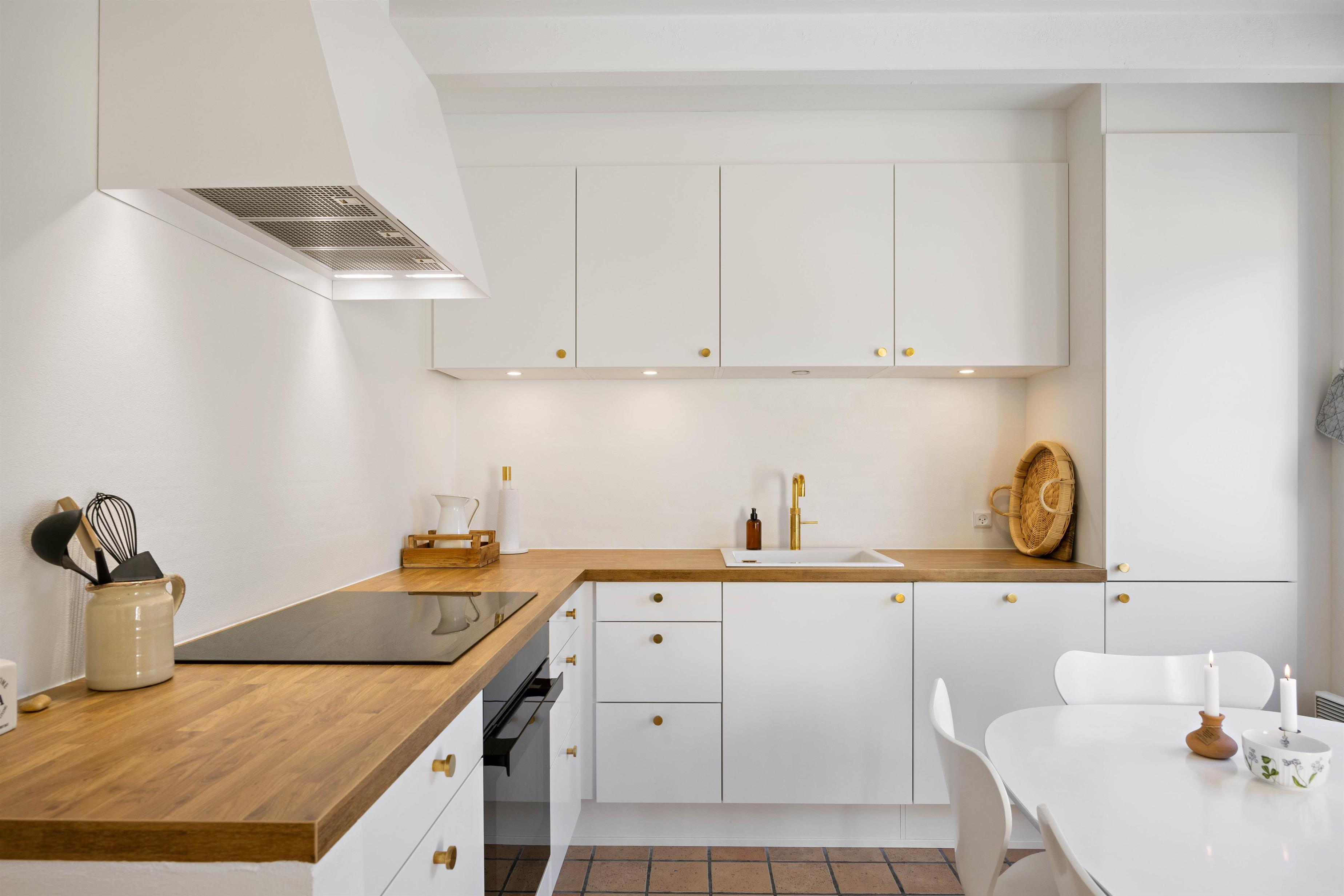 Ferielejligheden rummer et smukt, nyt, hvidt køkken, med alle de moderne faciliteter og har også quooker, så i hurtigt kan skolde sutteflasken, lave en kop the eller kaffe. Ubesværet kan i tilberede masser af nemt, lækkert feriemad, uden at bekymrer jer om opvasken, da opvaskemaskinen selvfølgelig klare dette for jer. Ydermere finder I en kombi vaskemaskine/tørretumbler i feriehuset, så I behøver heller ikke at bekymre jer om tøjvask under jeres ophold.