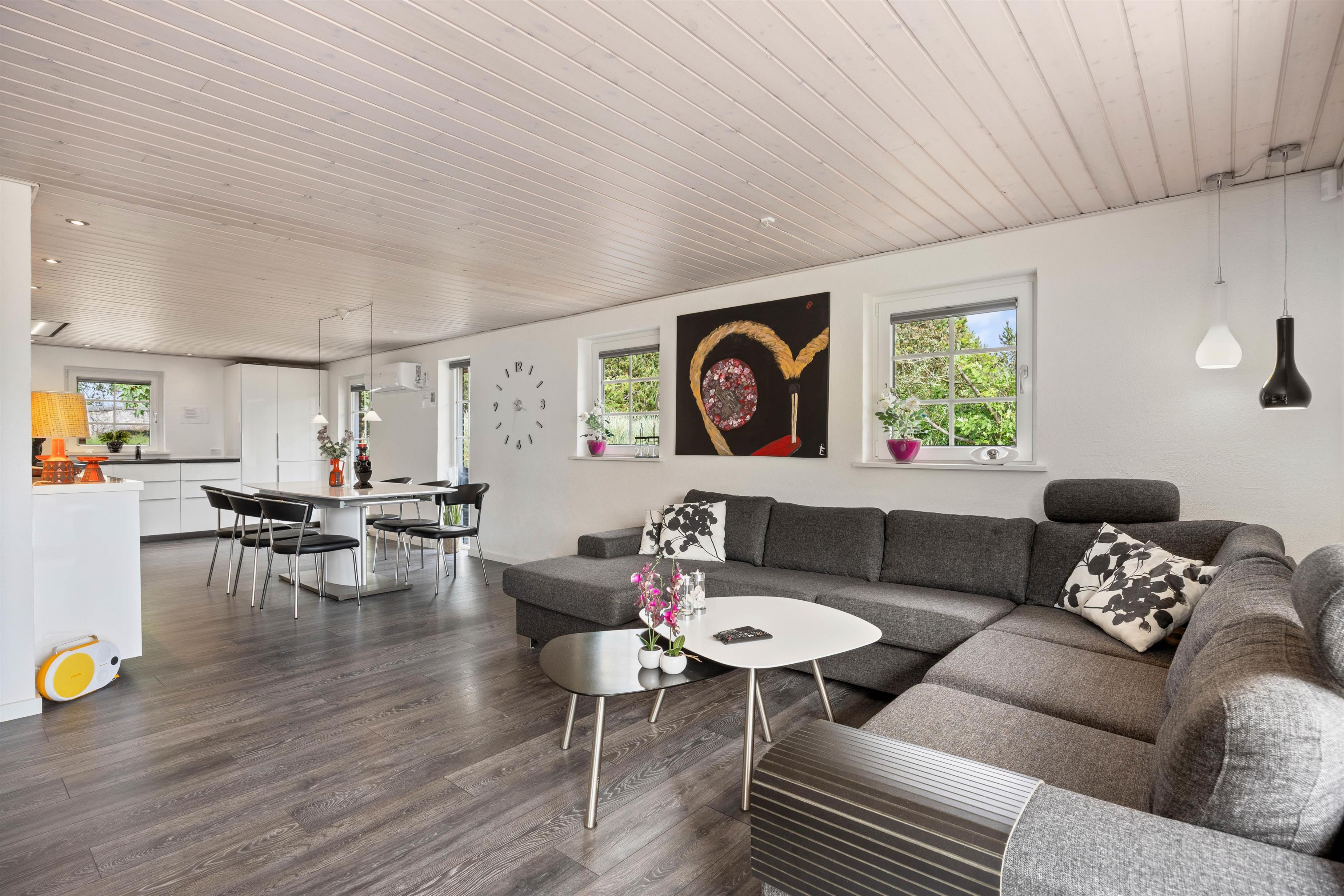 Når I træder ind i sommerhuset, møder I et hyggeligt og rummeligt køkken-alrum. Her er blandt andet en lækker brændeovn, hvor I kan sætte jer godt til rette foran den knitrende ild på kølige aftener og bare slappe af. Ved siden af er der en åben spiseplads med plads til seks personer. Det store vinduesparti i stuen sørger også for et godt lysindfald, hvilket er prikken over i’et i dette dejlige rum.