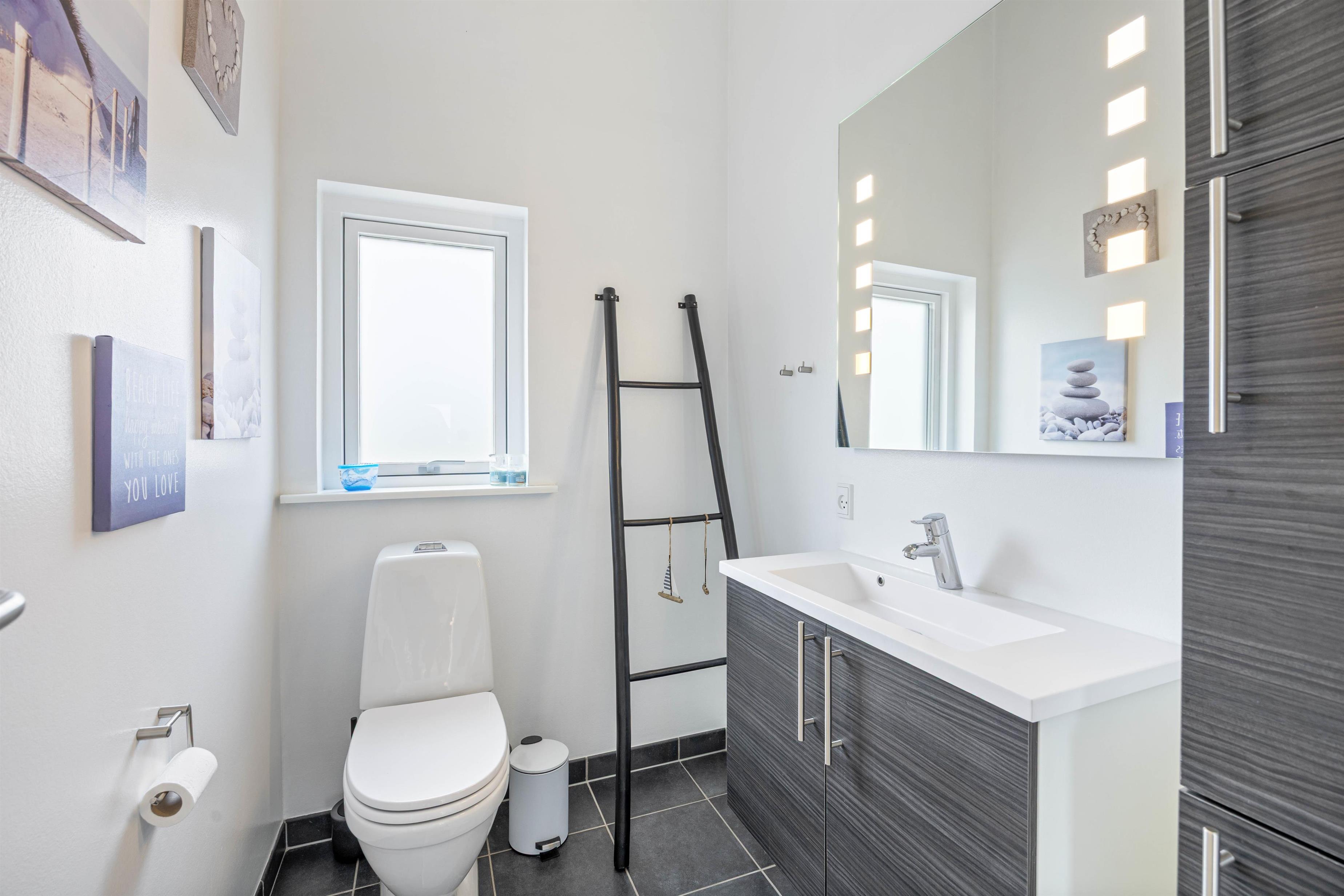 På badeværelset finder I også en dejlig sauna. Her har I mulighed for at trække jer lidt tilbage og få krop og sjæl til at slappe helt af. Det er især dejligt at blive varmet igennem i saunaen efter en lang frisk gåtur på stranden eller i området omkring sommerhuset.