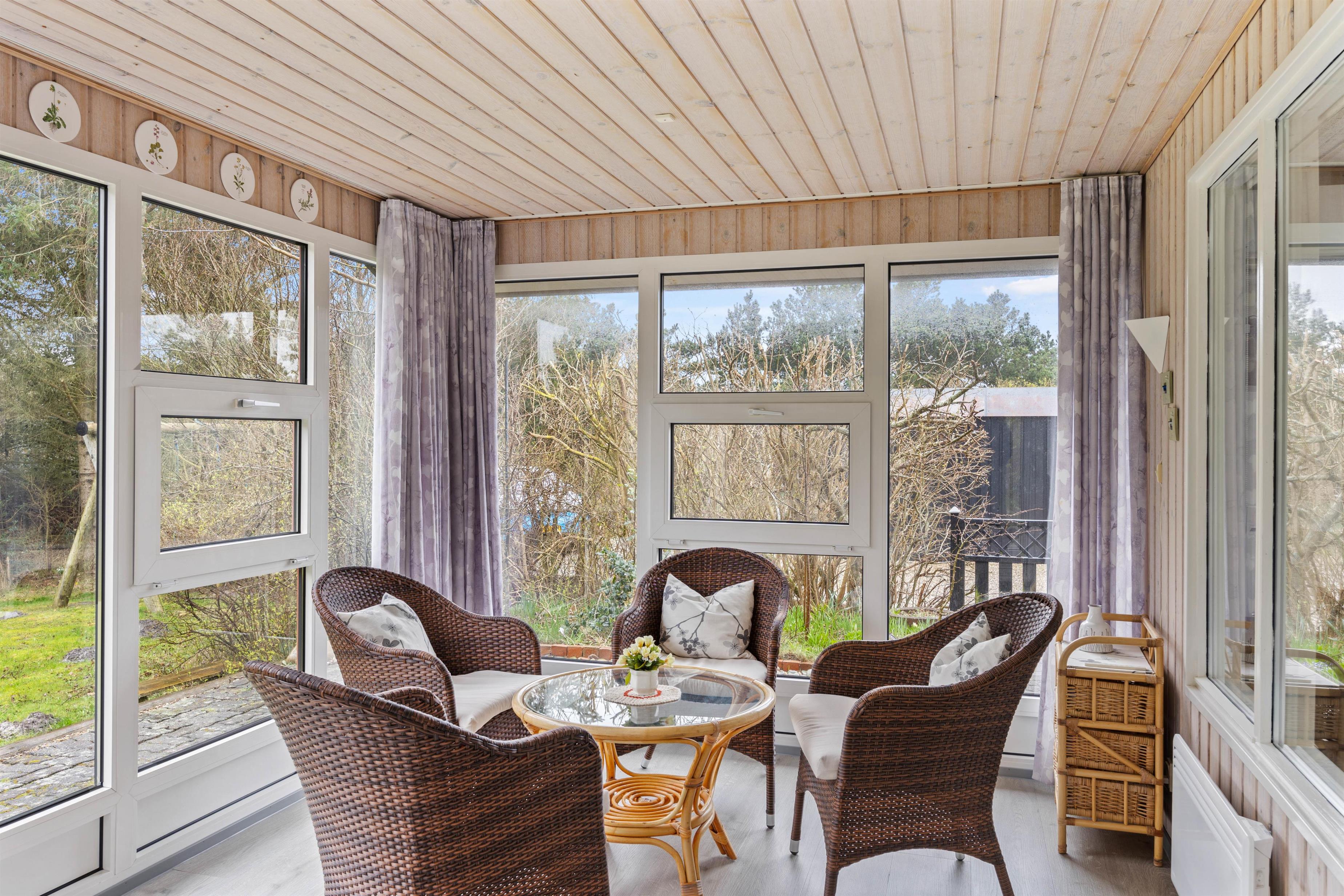 Fra stuen er der direkte udgang til den skønne udestue, som sikrer, at sommermånederne lige strækker sig lidt længere end normalt. Solen varmer rummet godt op, så her er det altid hyggeligt at være – og så gør udsynet til den flotte plænegrund, der er omgivet af høje fyrretræer, det kun endnu hyggeligere.