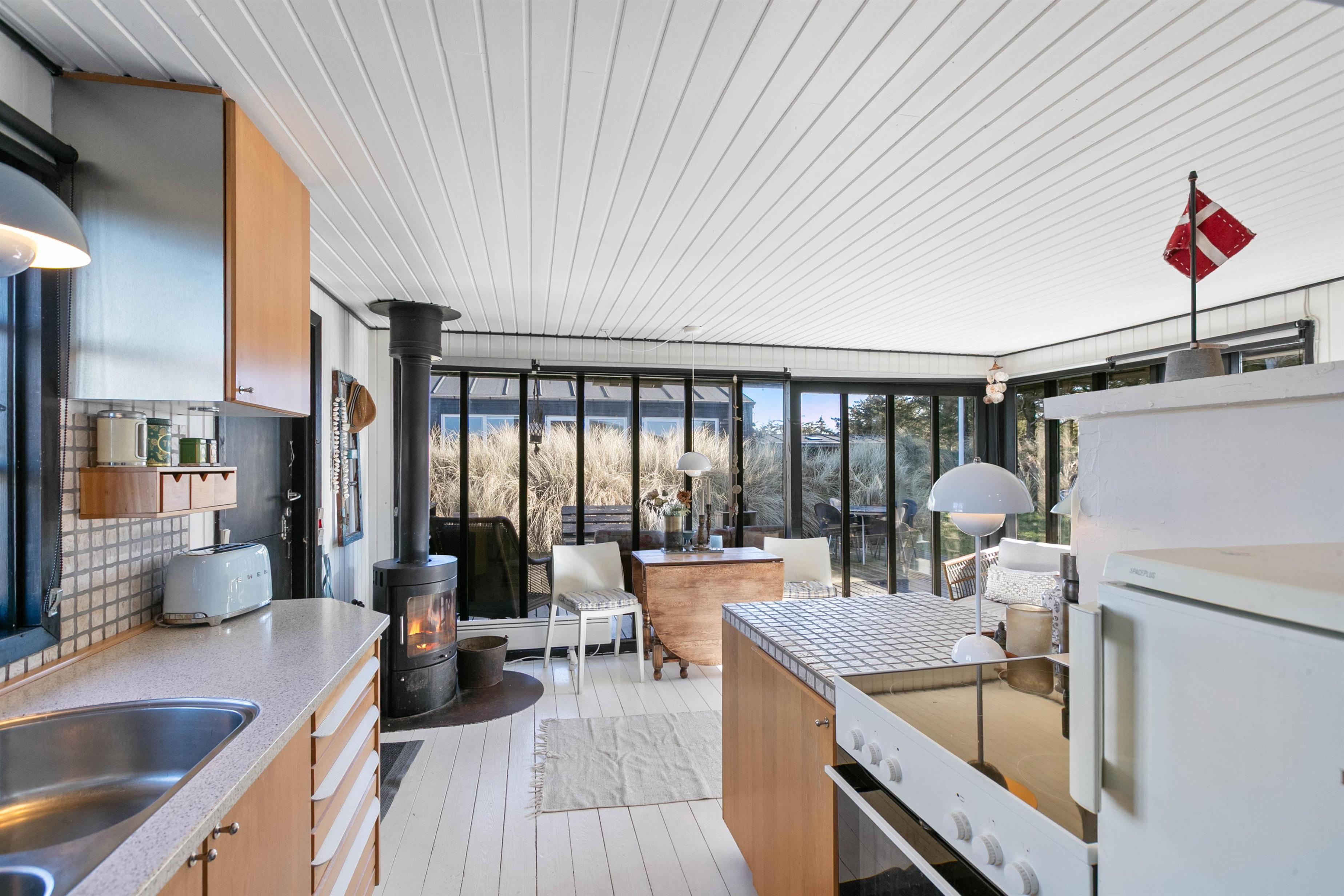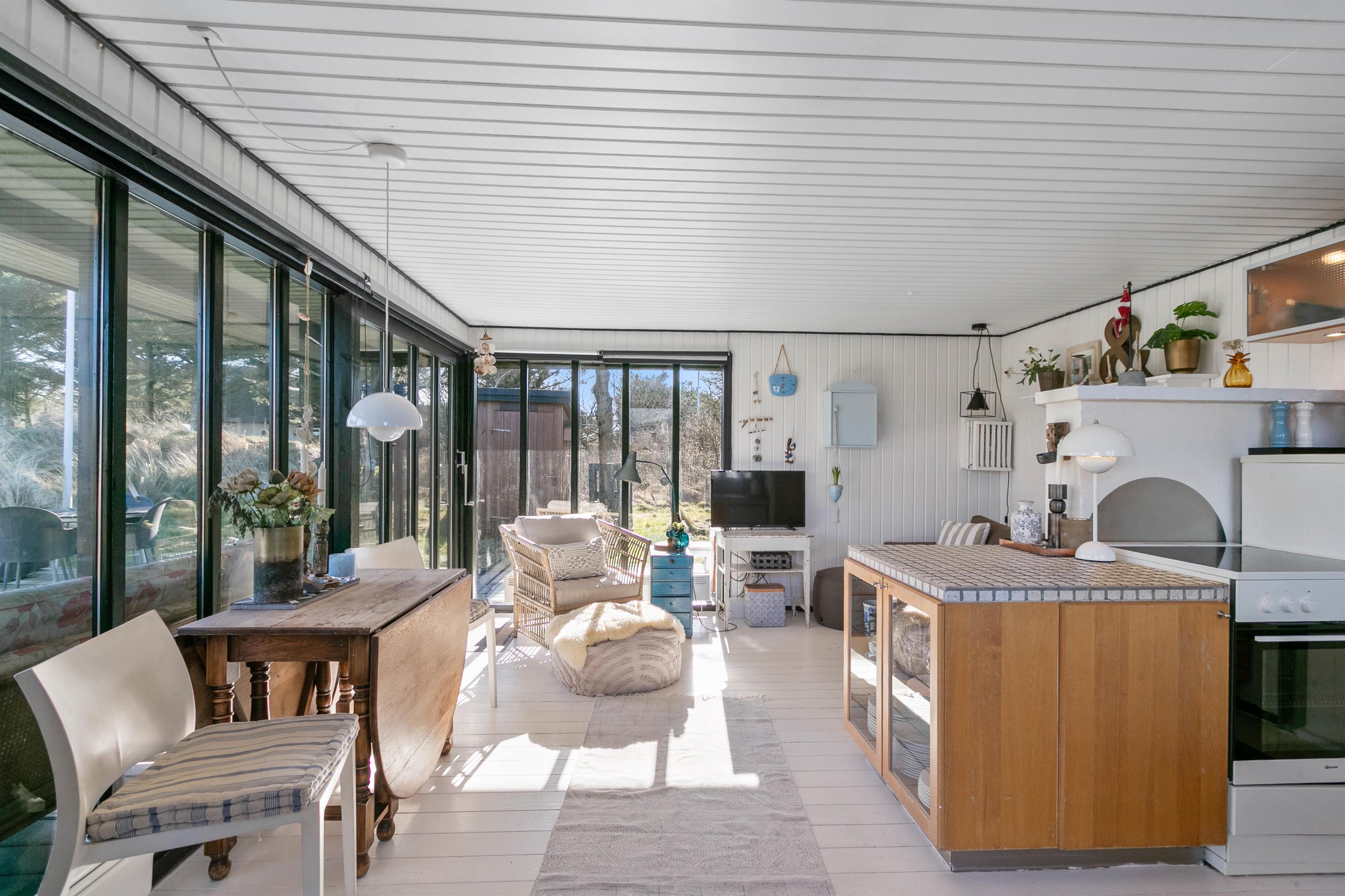 Det lille træsommerhus ligger helt centralt placeret i Søndervig by, men fordi sommerhuset er omkranset af buske og træer, er I afskærmet fra de omkringliggende huse. Sommerhust er indbegrebet af dansk sommerhusferie. Her er der plads til afslapning for to. Selvom sommerhuset kun er 40 m2 stort, vil sommerhuset imødekomme de fleste af jeres ønsker. Køkkenet ligger i åben forbindelse med stuen, og de store vinduespartier, som vender ud mod terrassen sørger for, at der hele tiden kommer masser af lys ind i stuen.