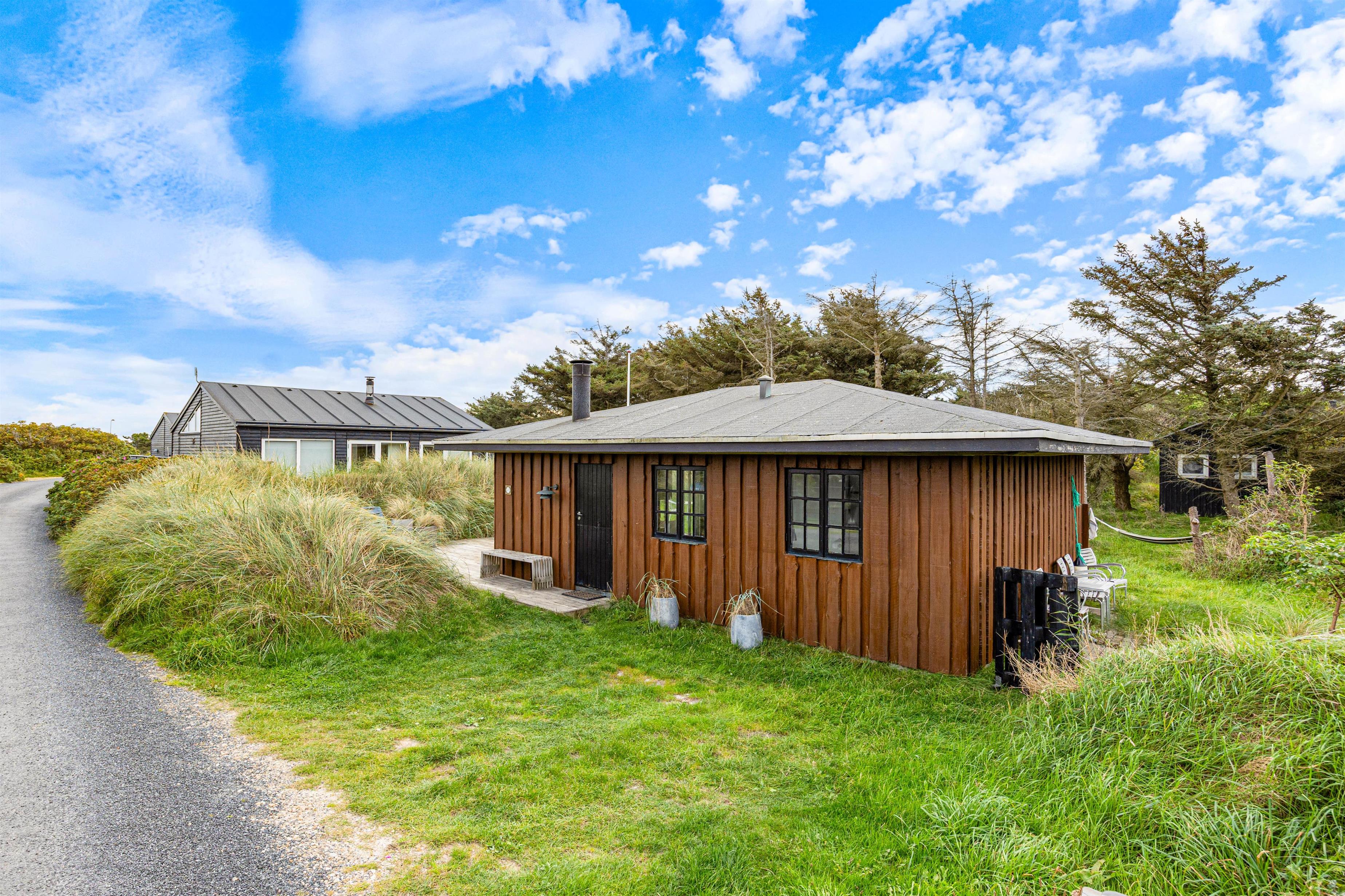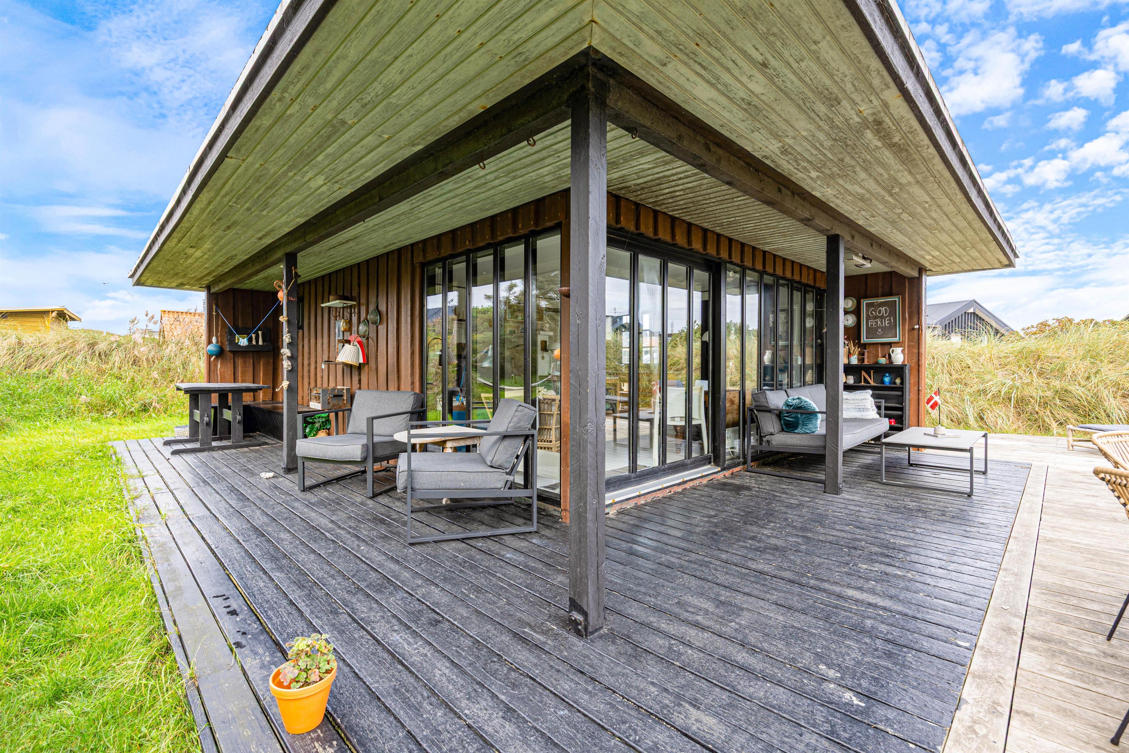 Feriehuset har naturligvis også en terrasse med havemøbler, liggestole og grill. Her kan I nyde en dejlig frokost eller slappe af på langs i skyggen fra halvtaget. Rundt om huset vil I kunne flere hyggelige kroge, der lægger op til at I virkelig kan slappe af. Som tidligere nævnt, så er sommerhuset omkranset af buskadser og træer, hvilket giver en god afskærmning og lægger op til total afslapning. Noget af den overdækkede terrasse er overdækket, hvilket forlænger udetiden og lægger op til endnu mere hygge udendørs hygge og nærvær.
