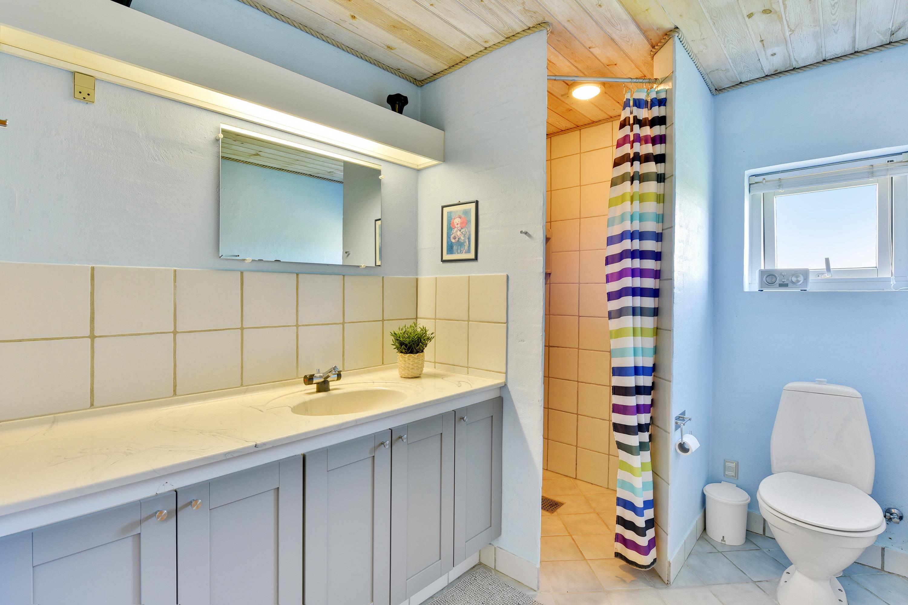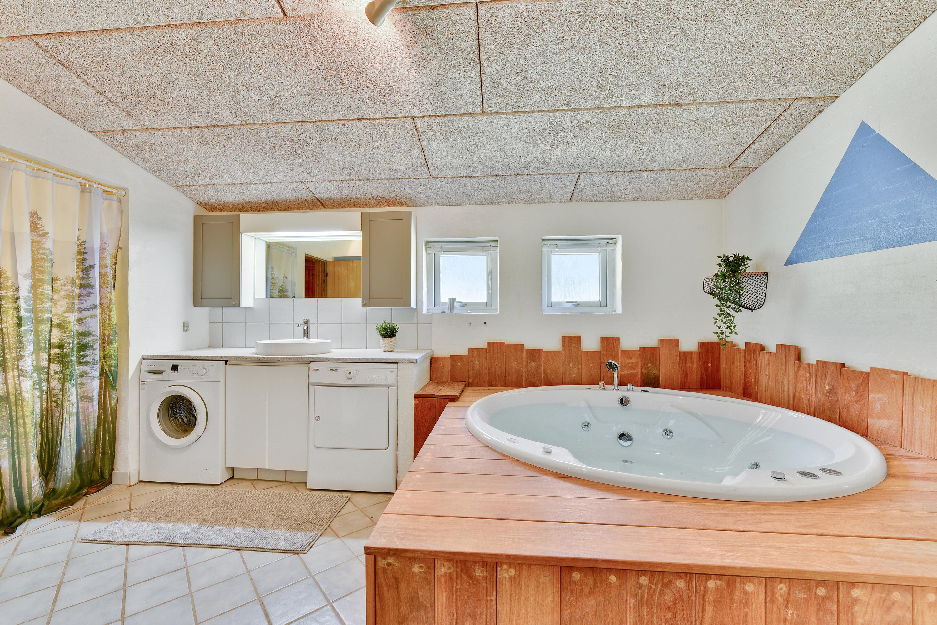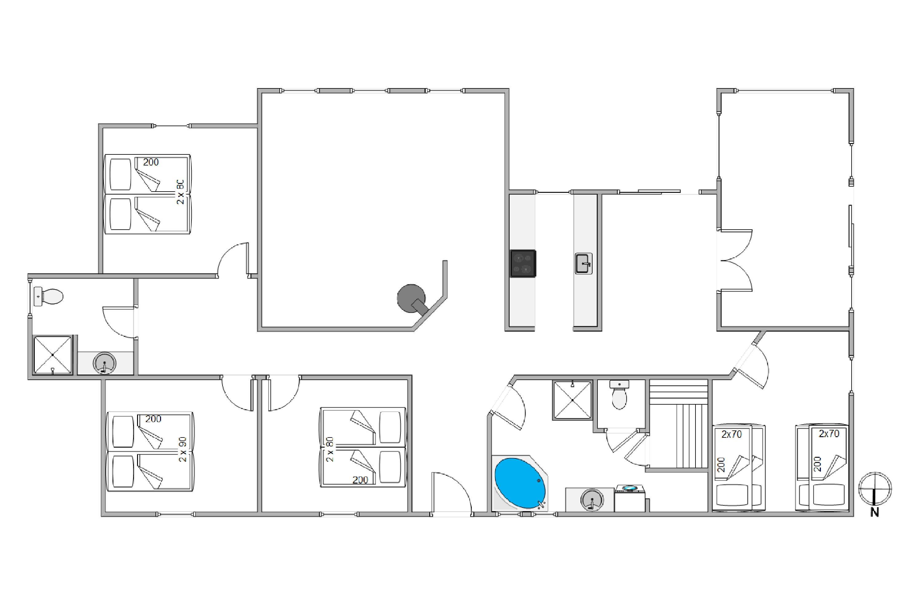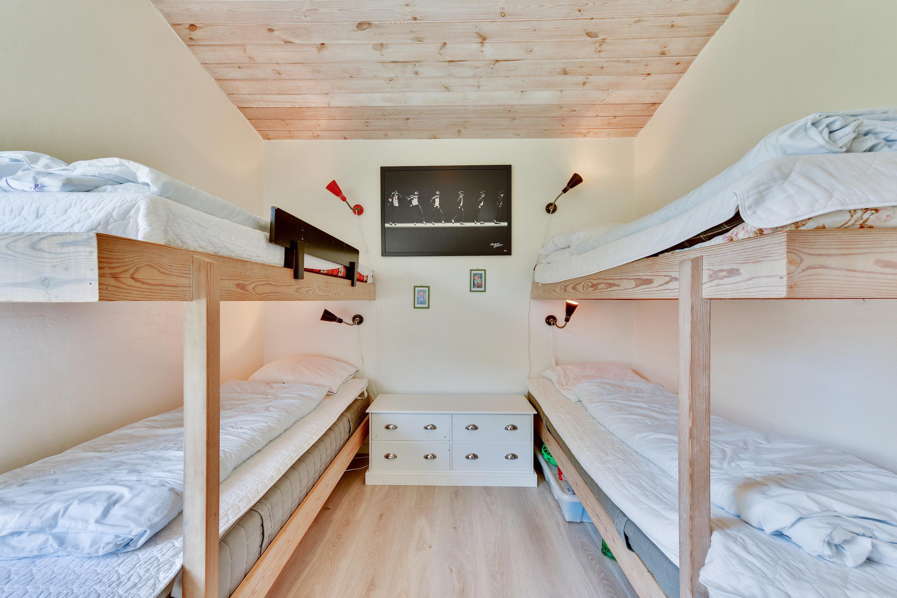 Der er 10 sovepladser i huset fordelt på fire gode og lyse soveværelser. Tre af disse værelser er indrettet med komfortable dobbeltsenge, mens det sidste værelse er udstyret med to køjesenge. Herudover er der et stort badeværelse med spa, sauna, vaskemaskine, tørretumbler og opvarmet flisegulv samt et mindre gæstetoilet med bruseniche.