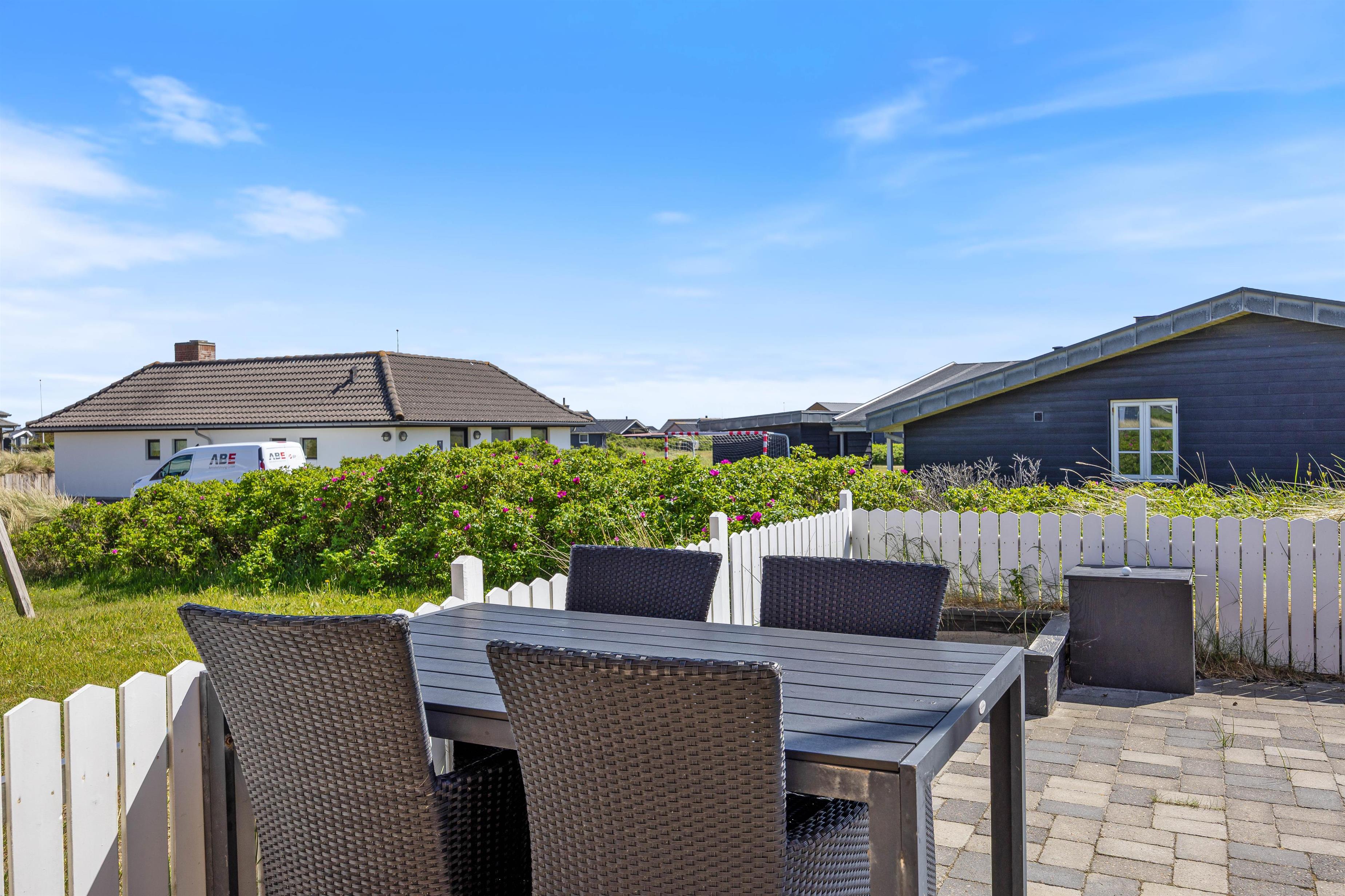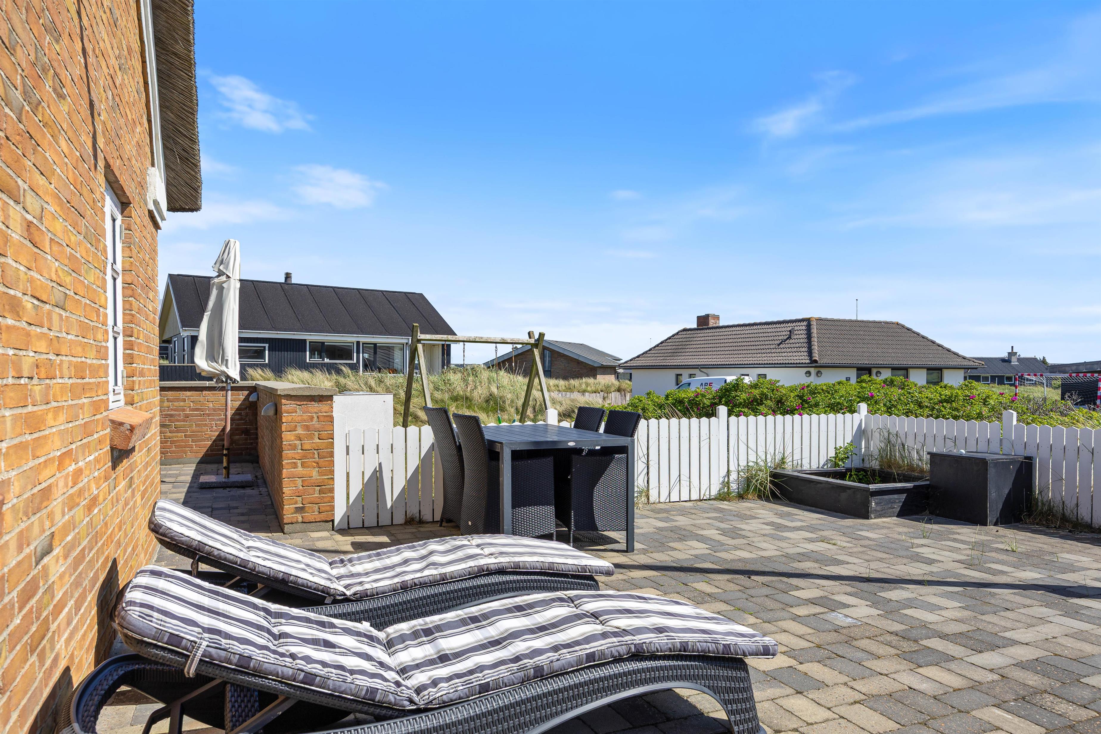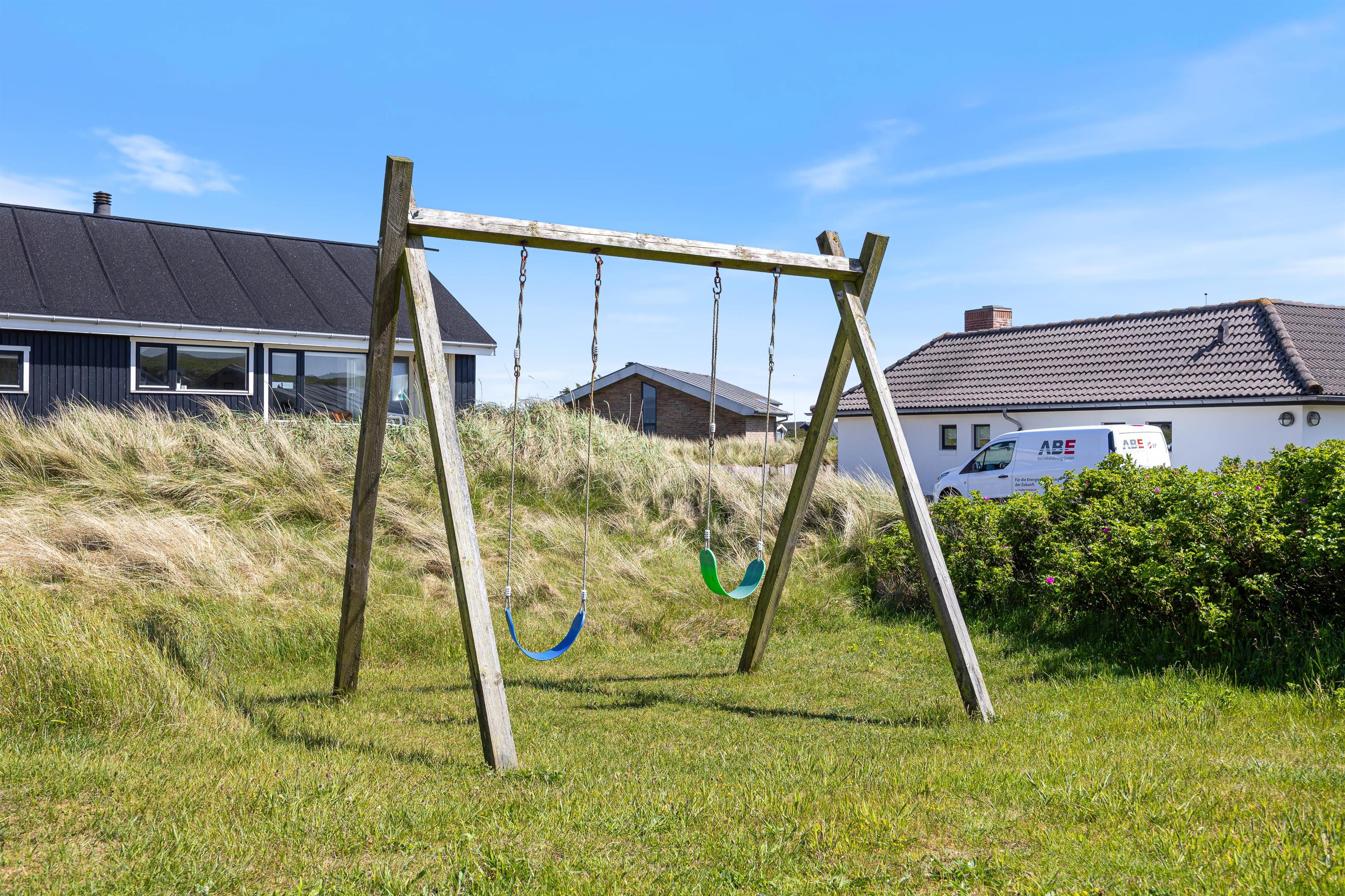 Feriehuset ligger på en godt 1200 m² stor naturgrund og her er god plads til, at børnene kan lege og tumle rundt. Et af feriehusets highlights vil helt sikkert være gyngen og sandkassen, hvor børnene kan tilbringe mange timer. Imens kan de voksne nyde en kølig drink på terrassen. Om aftenen kan I tilberede en lækker aftensmad på gasgrillen, der står til rådighed.