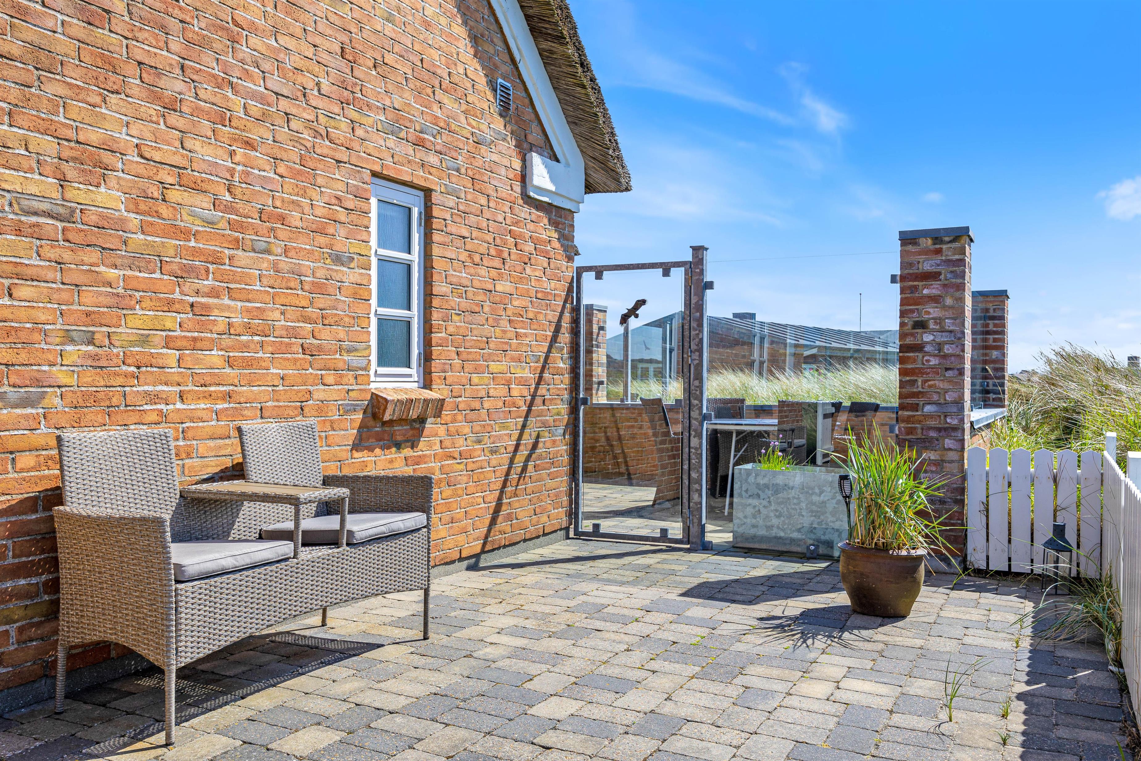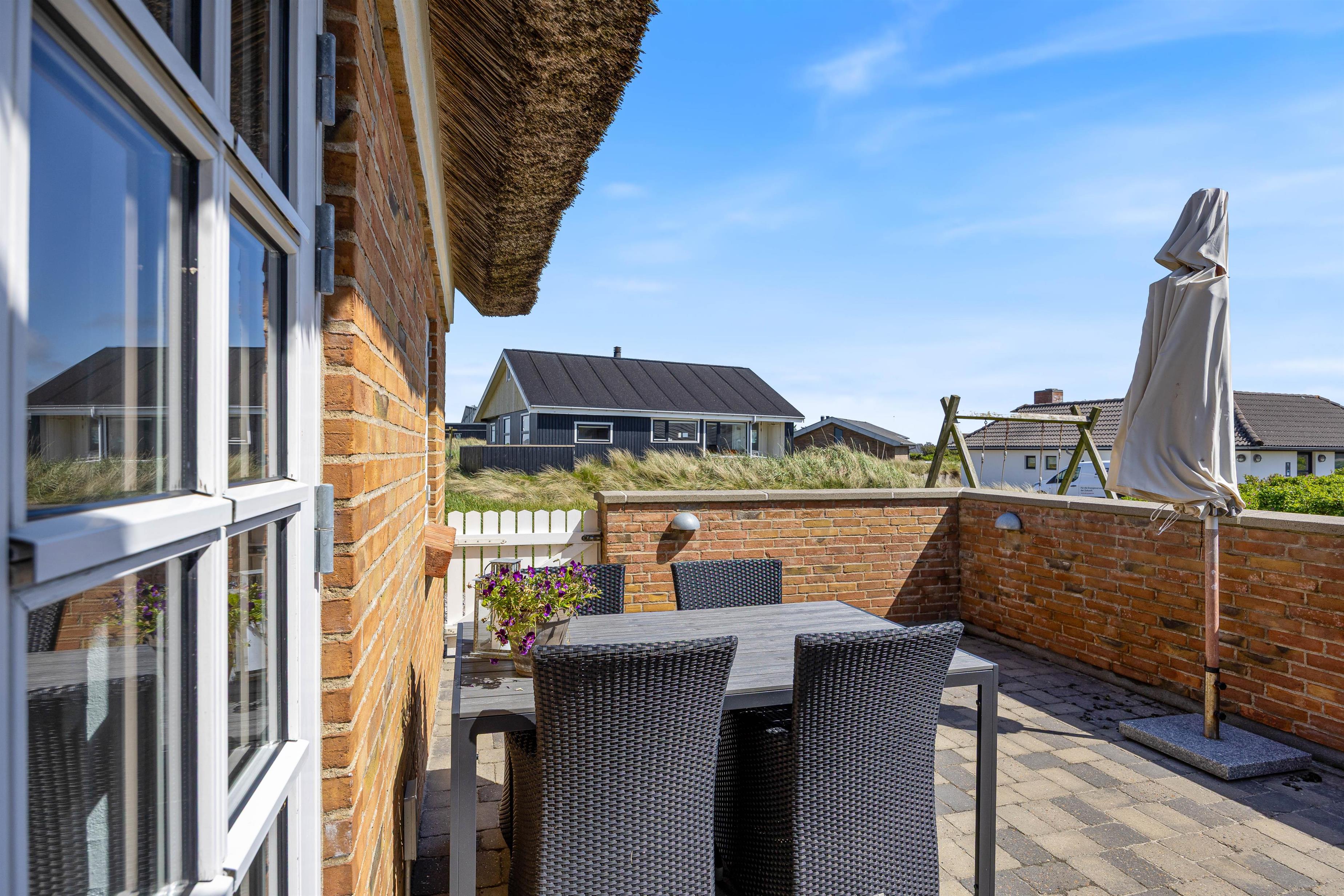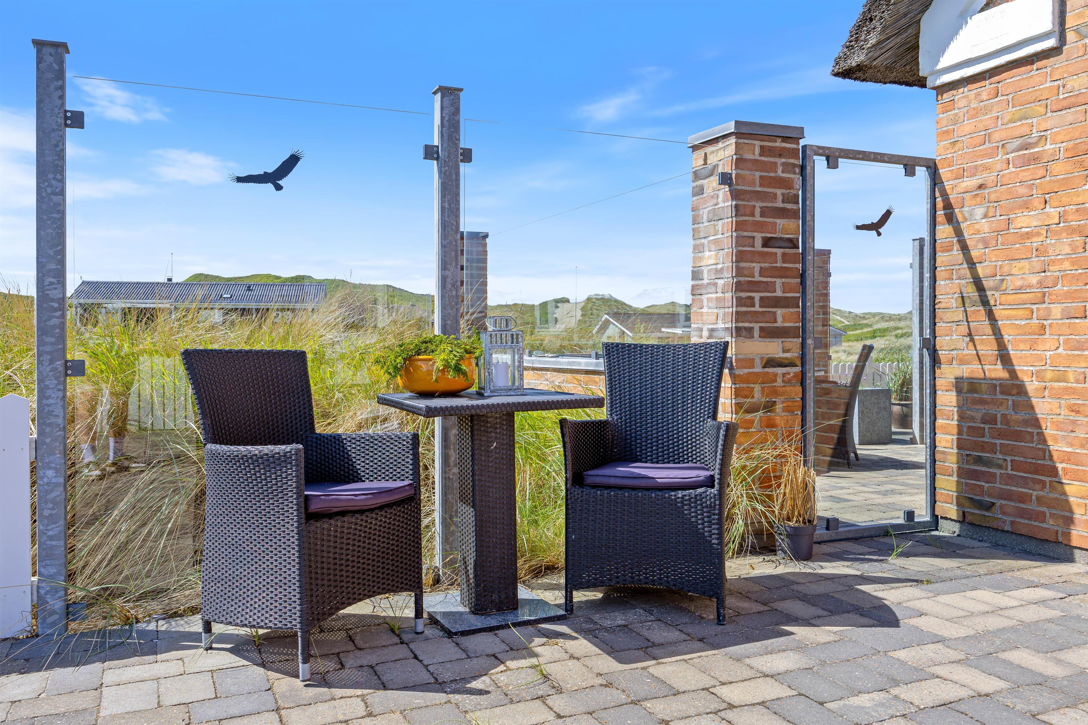 Feriehuset ligger på en godt 1200 m² stor naturgrund og her er god plads til, at børnene kan lege og tumle rundt. Et af feriehusets highlights vil helt sikkert være gyngen og sandkassen, hvor børnene kan tilbringe mange timer. Imens kan de voksne nyde en kølig drink på terrassen. Om aftenen kan I tilberede en lækker aftensmad på gasgrillen, der står til rådighed.