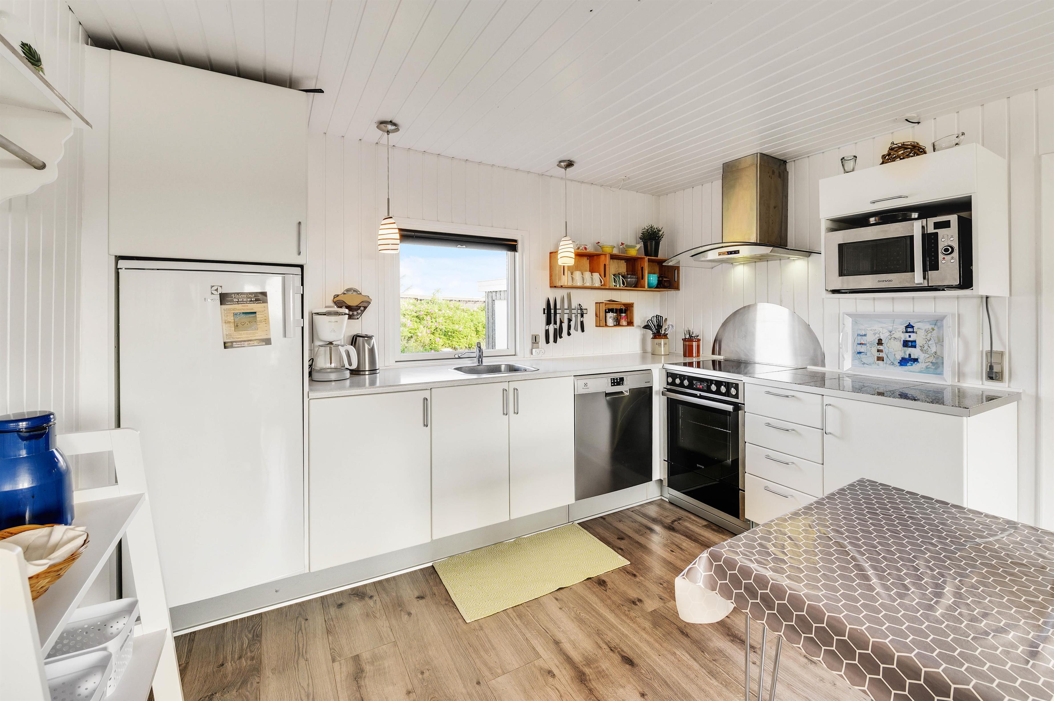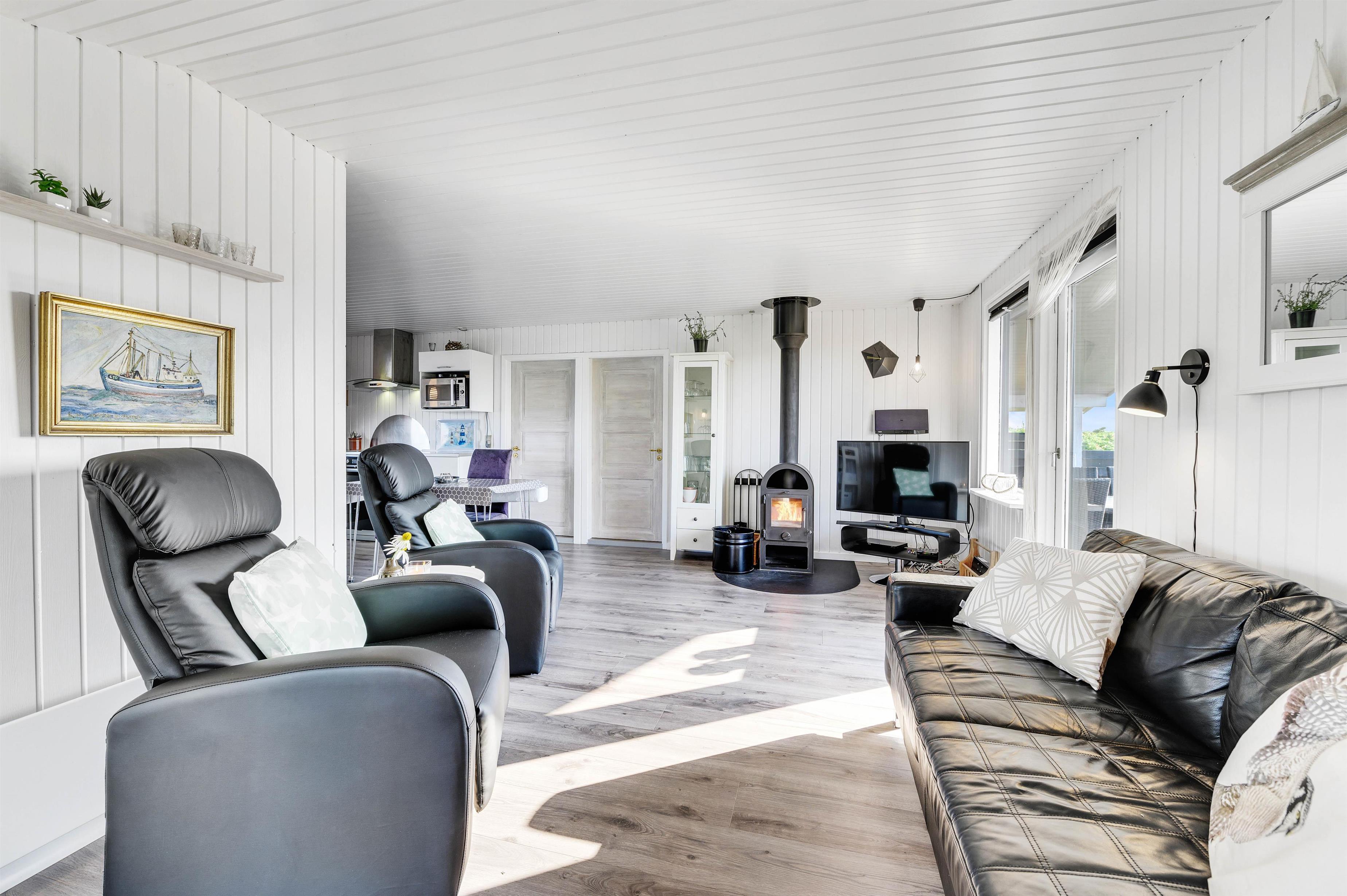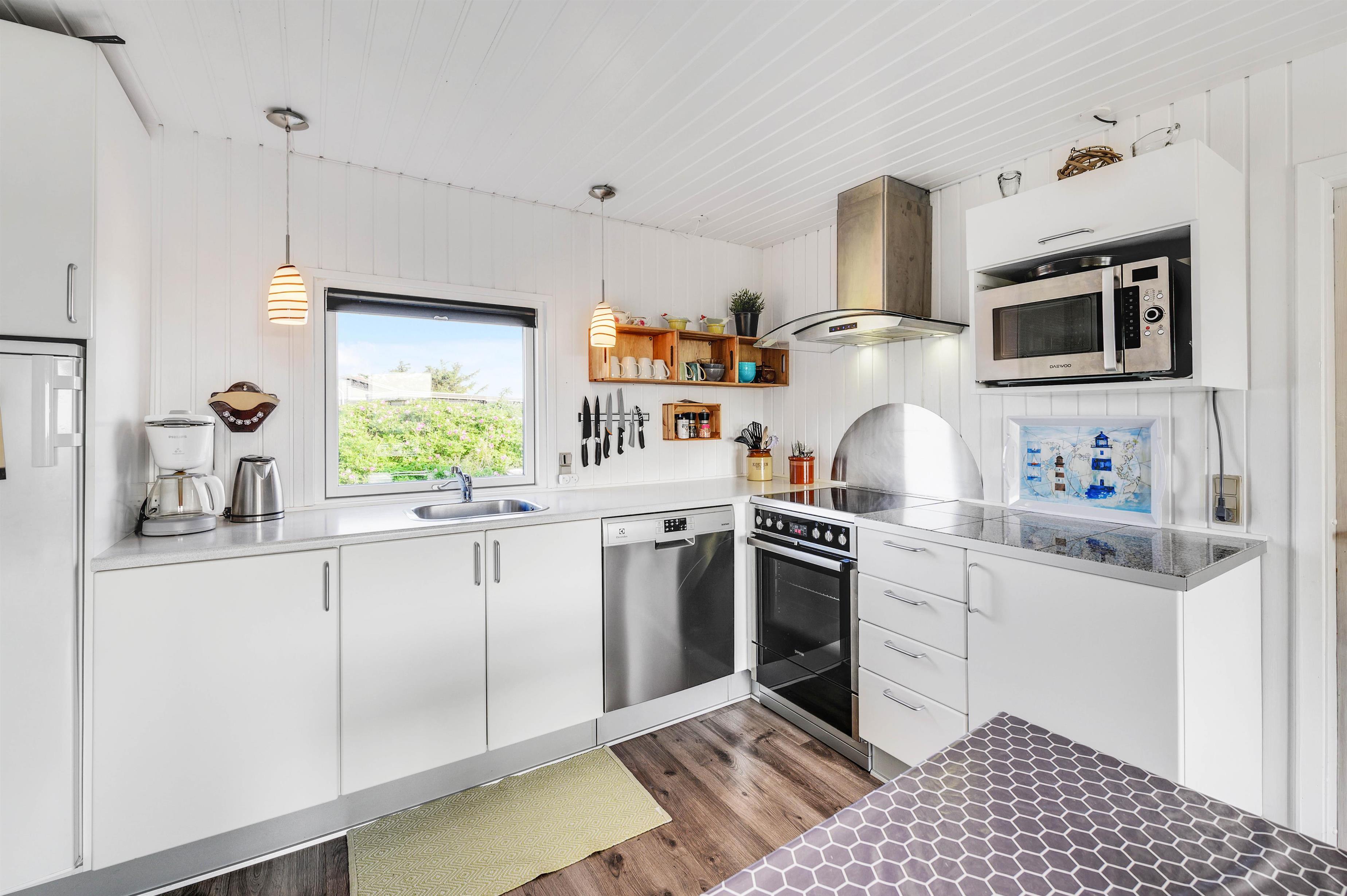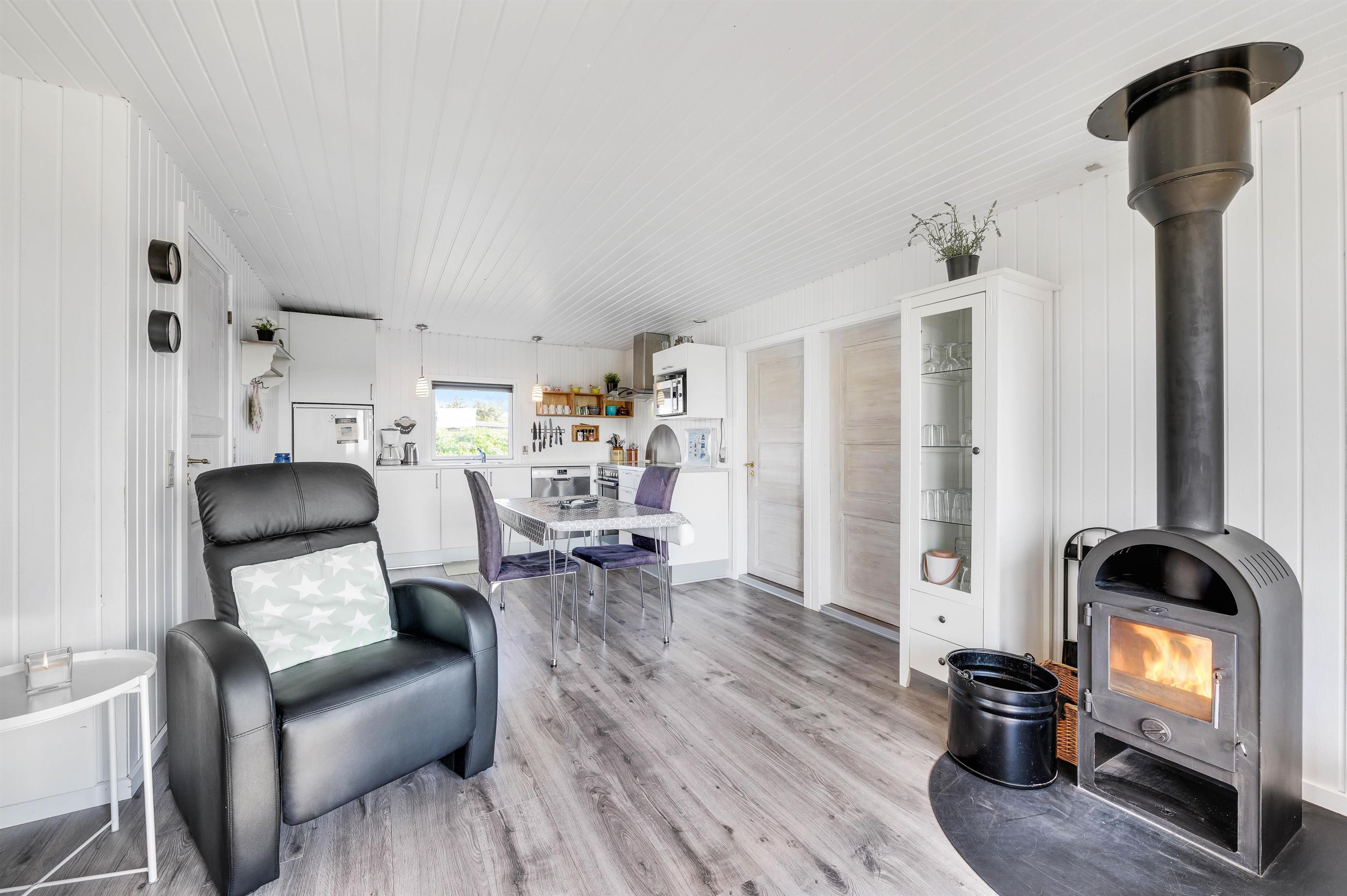 Den hyggelige og charmerende indretning gør, at I vil føle jer godt tilpas i samme øjeblik, I træder indenfor i sommerhuset. Her er virkelig rart at være. De lyse panelvægge og store vinduespartier bidrager til gøre sommerhuset lyst og indbydende, og det er noget nær umuligt ikke at lade blikket vandre ud gennem vinduerne mod omgivelserne udenfor.