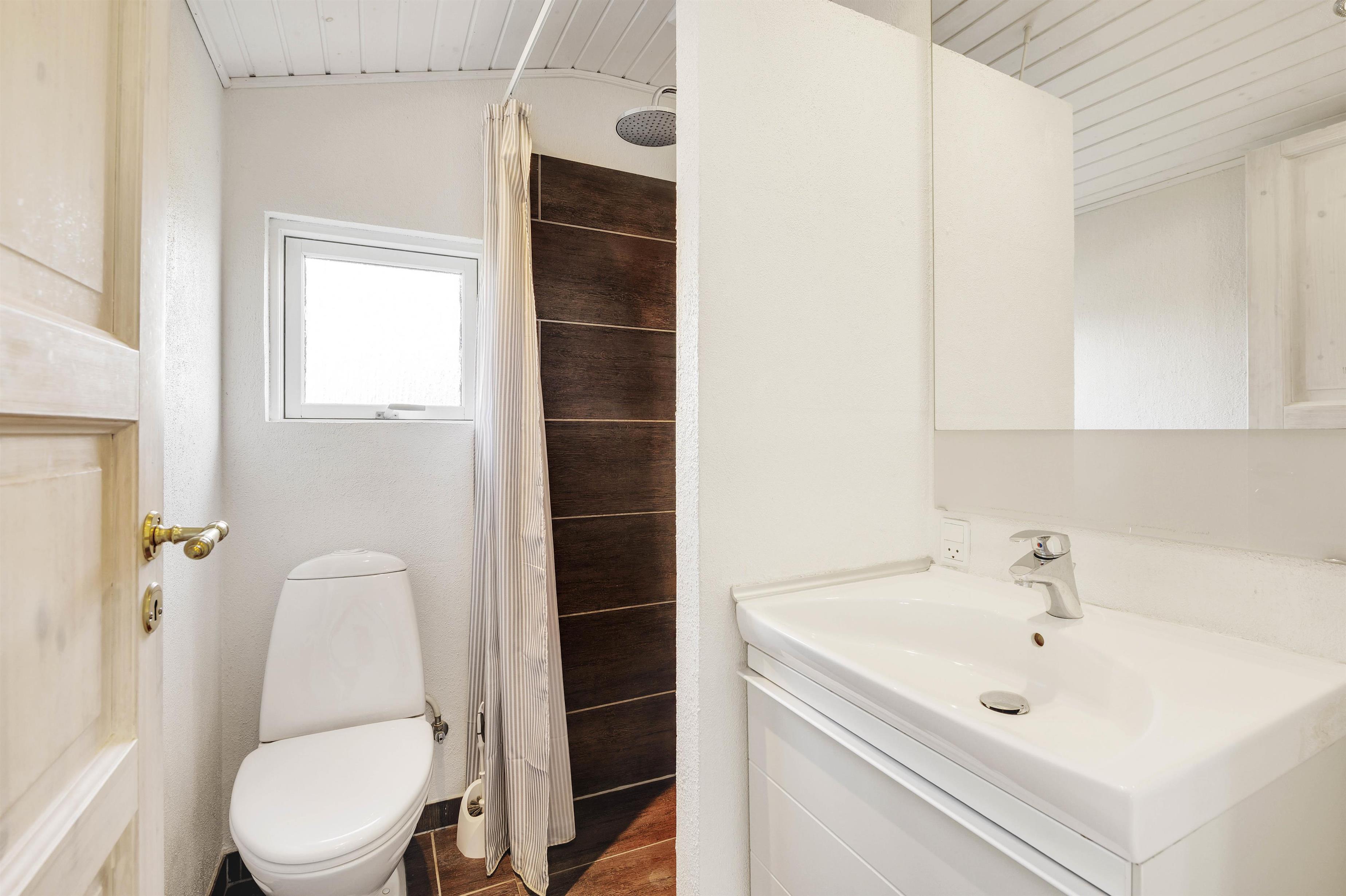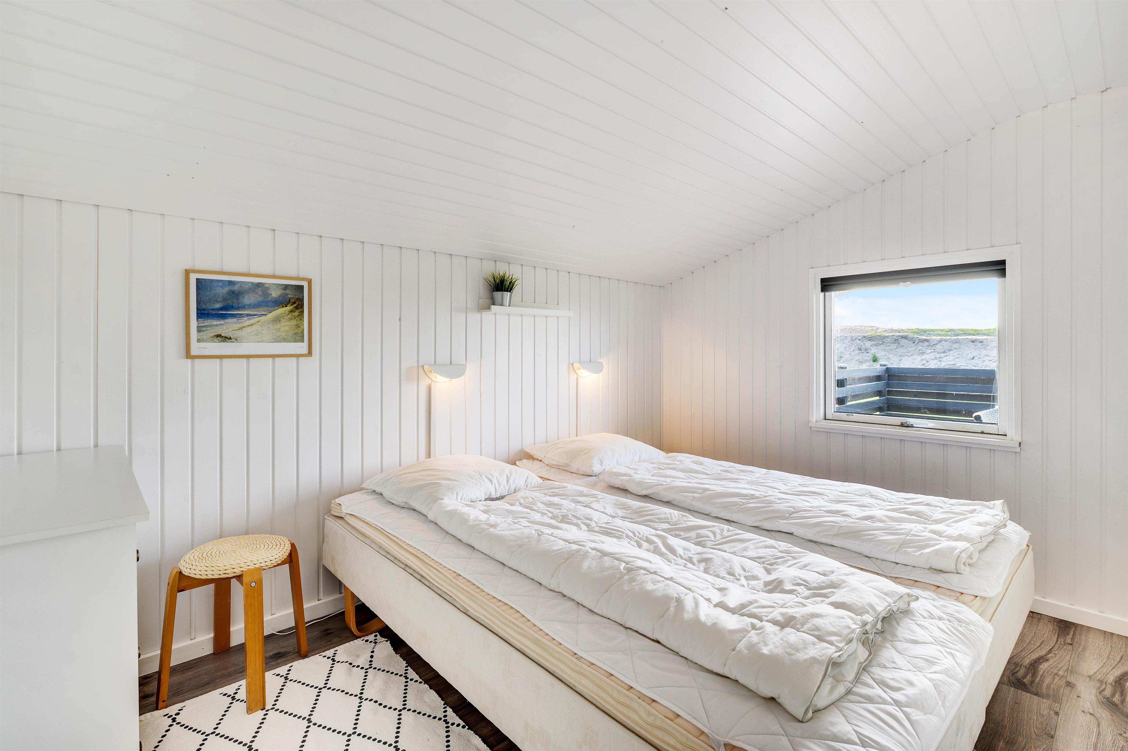 Feriehuset råder over to gode værelser, der er indrettet med henholdsvis dobbeltseng og to enkeltsenge. Derudover er der et pænt og lyst badeværelse med bruseniche, flisegulv og gulvvarme.
