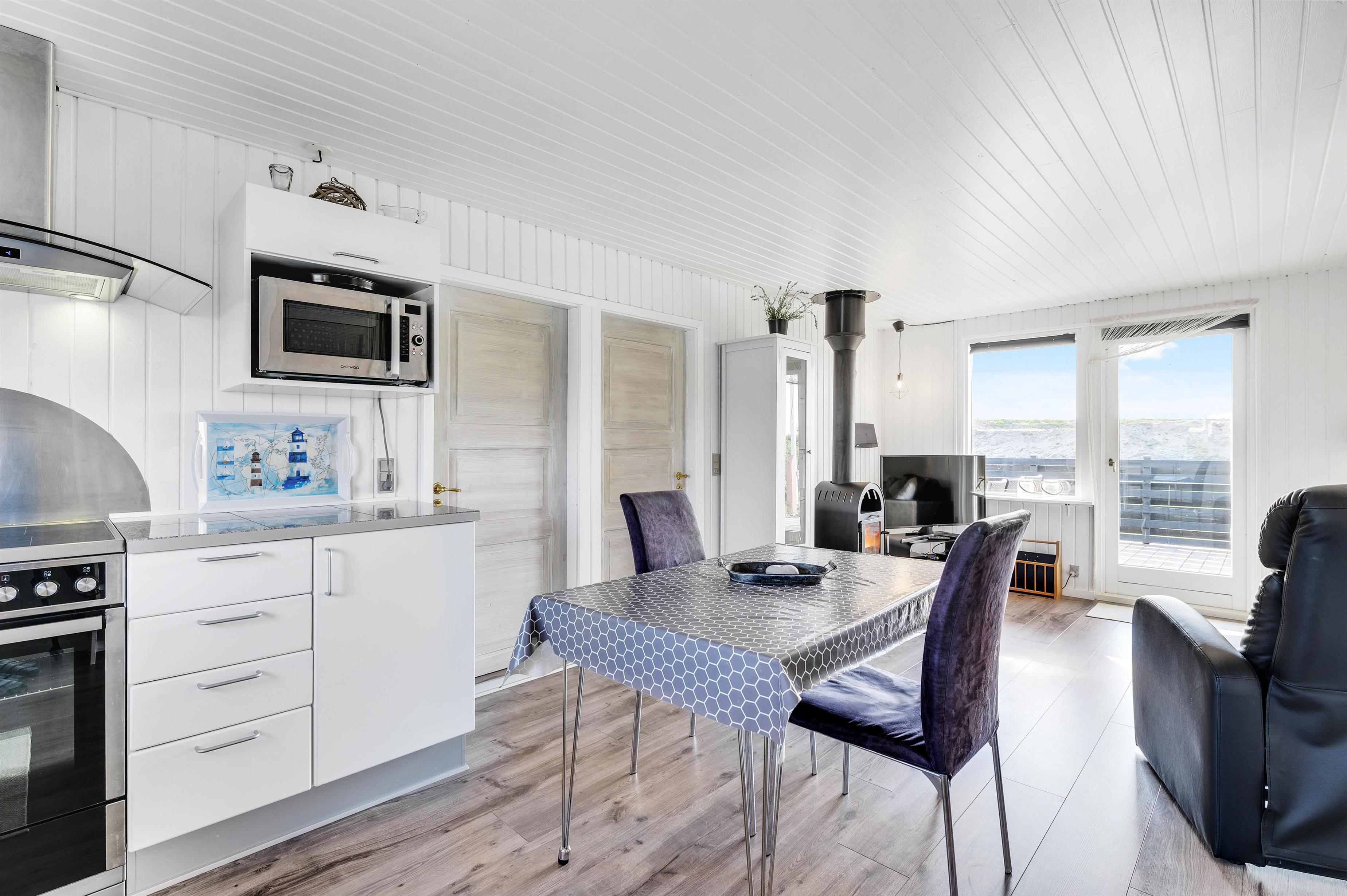 Sommerhusets hjerte er det store opholdsrum, der ligger i åben forbindelse med en nedsænket stue. Her kan feriedagene nydes i sofaen eller til en god middag omkring spisebordet. Køkkenet er pænt og godt udstyret med blandt andet køleskab med 25 liters frysekapacitet, mikroovn og opvaskemaskine, ligesom der er god plads til alle jeres kulinariske udfoldelser.
