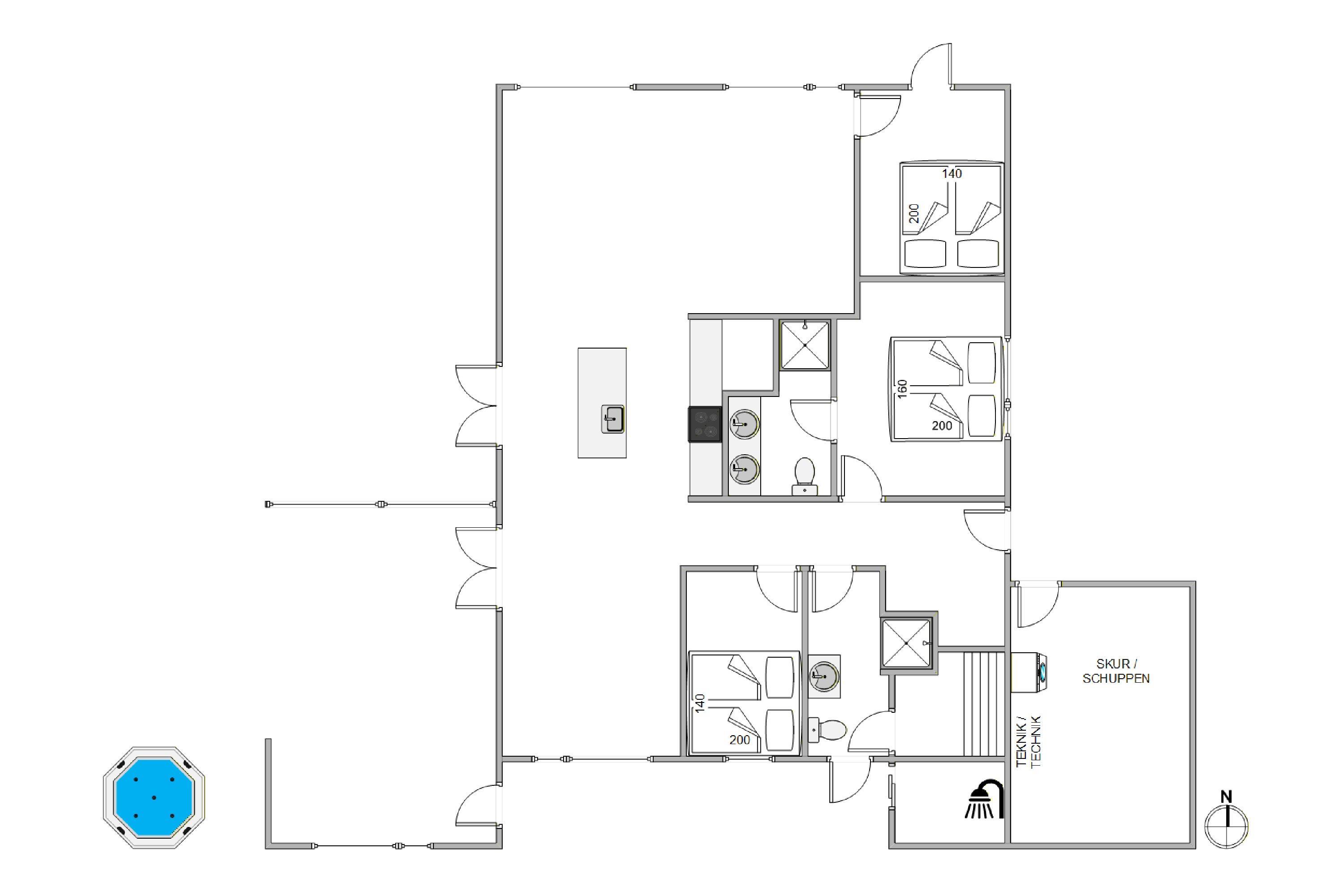 Efter en dag på stranden kan I skylle fødderne ved husets udebruser og afslutte dagen i husets udespa, hvor I kan slappe helt af og nyde ferien.