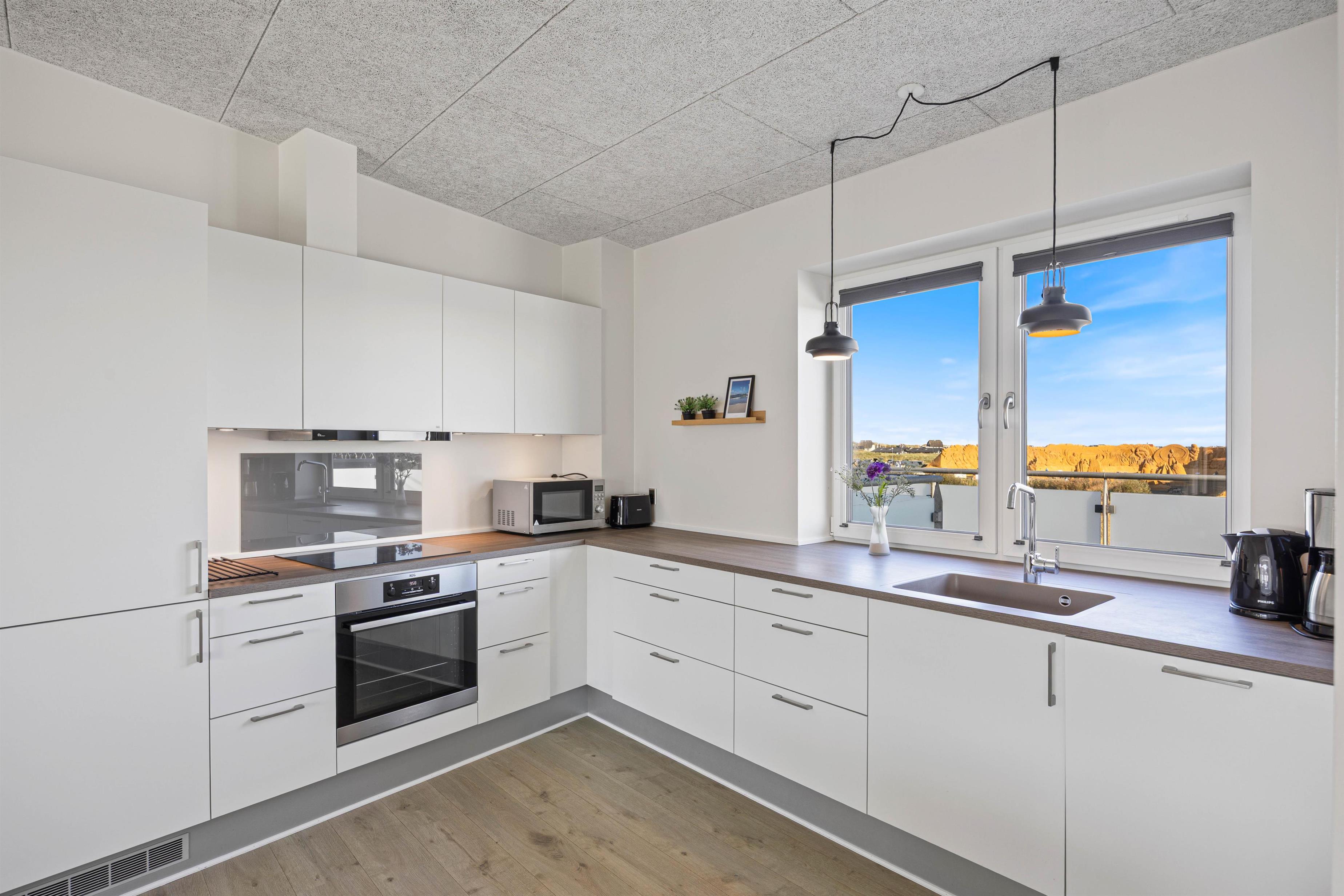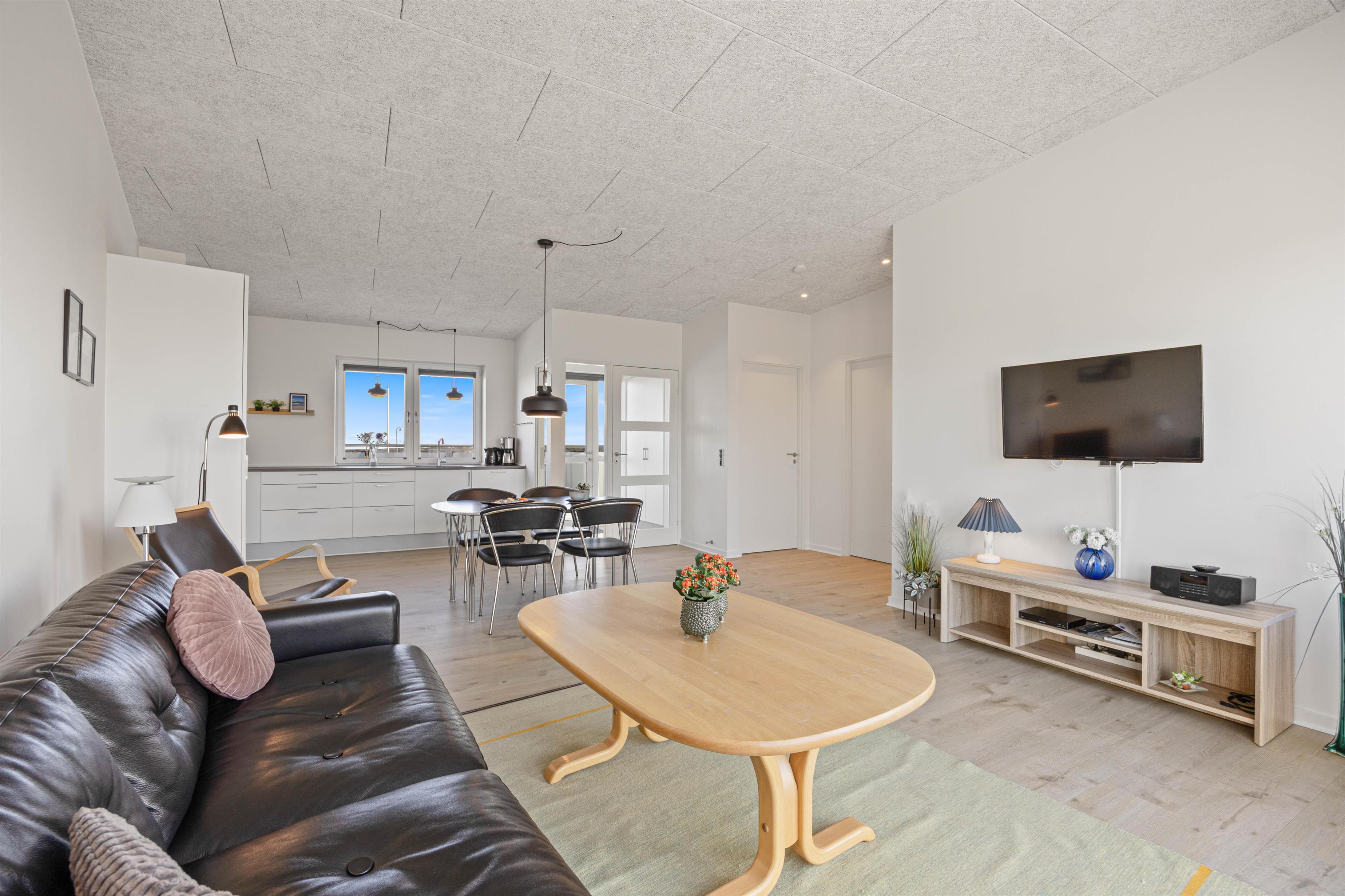 Den moderne ferielejlighed er opført i 2020 og byder på en lys indretning og gulvvarme over det hele. Her får I 2 gode soveværelser med gulvvarme. Der befinder sig henholdsvis en dobbeltseng og to enkeltsenge – velegnet til den lille familie eller en romantisk ferie for to. Her er der plads til fire personer. Lejligheden ligger for enden af hele lejlighedskomplekset, det vil sige, at der ikke er nogen naboer til den ene side.