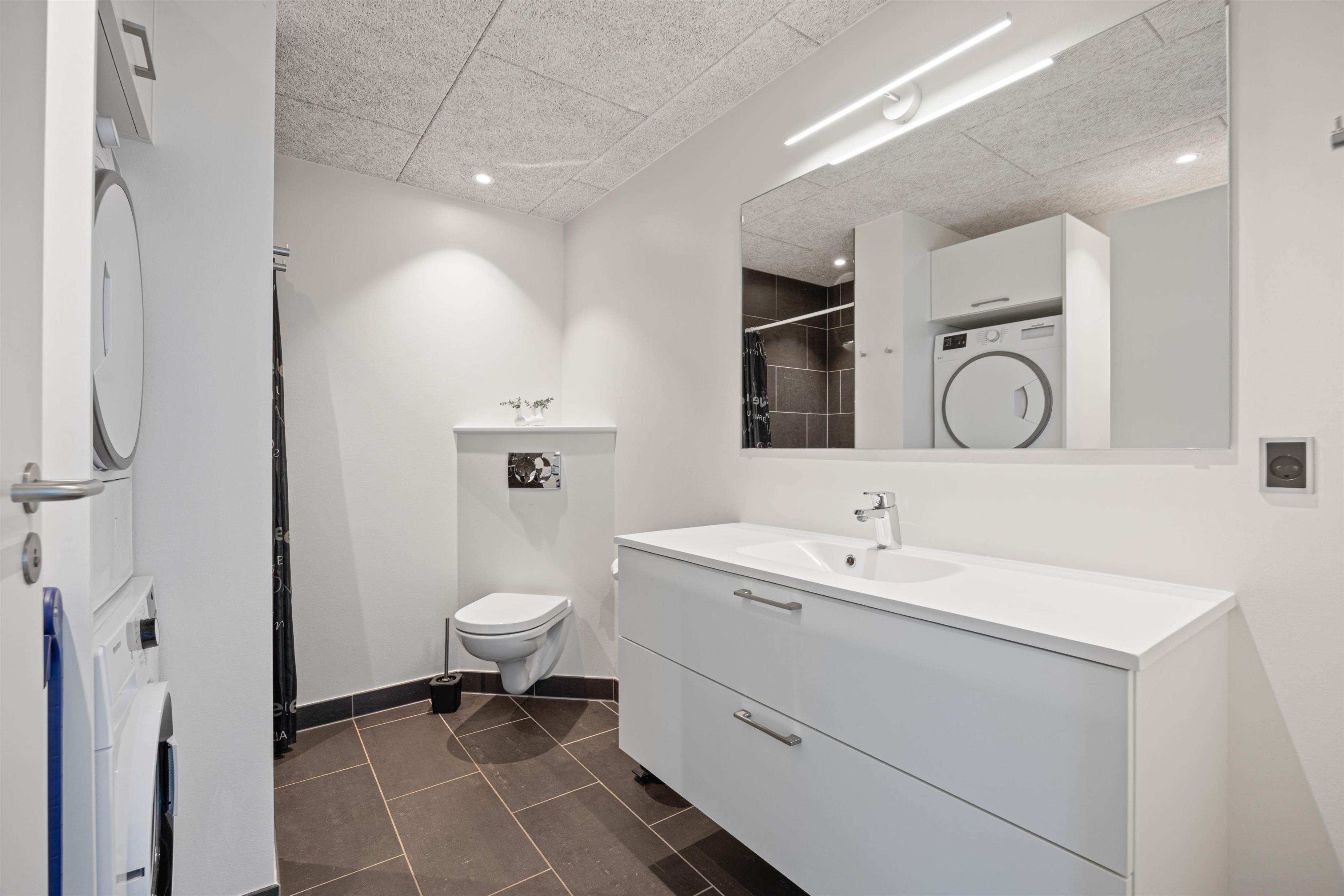 Det funktionelle køkken er udstyret med en opvaskemaskine, som kan klare opvasken for jer. I behøver heller ikke bekymre jer om beskidt tøj, da der både er en vaskemaskine og tørretumbler til rådighed i badeværelset, hvor der samtidig er gulvvarme.