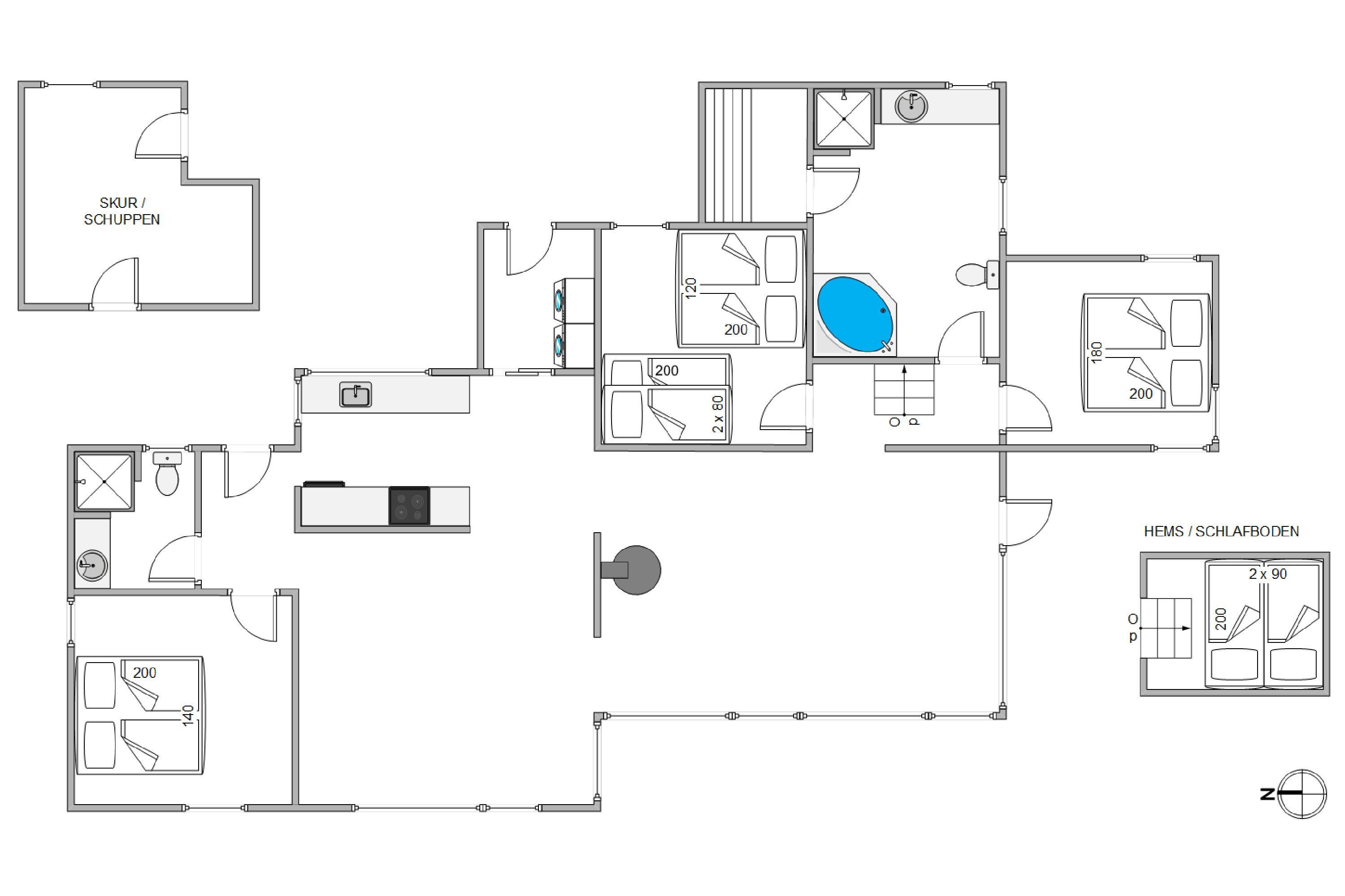 Her er der virkelig tale om et flot hus, hvor der er kræset for detaljerne; både ude og inde. Feriehuset er bygget af førsteklassesmateriale og er flot og smagfuldt indrettet. Her er plads til seks personer i tre store og rummelige soveværelser. De to af værelserne er med dobbeltsenge og det sidste med dobbeltseng og en køjeseng. Her er desuden en hems med to madrasser, og hvis man har børn med, ville de helt sikkert elske at lege uforstyrret oppe på husets hems