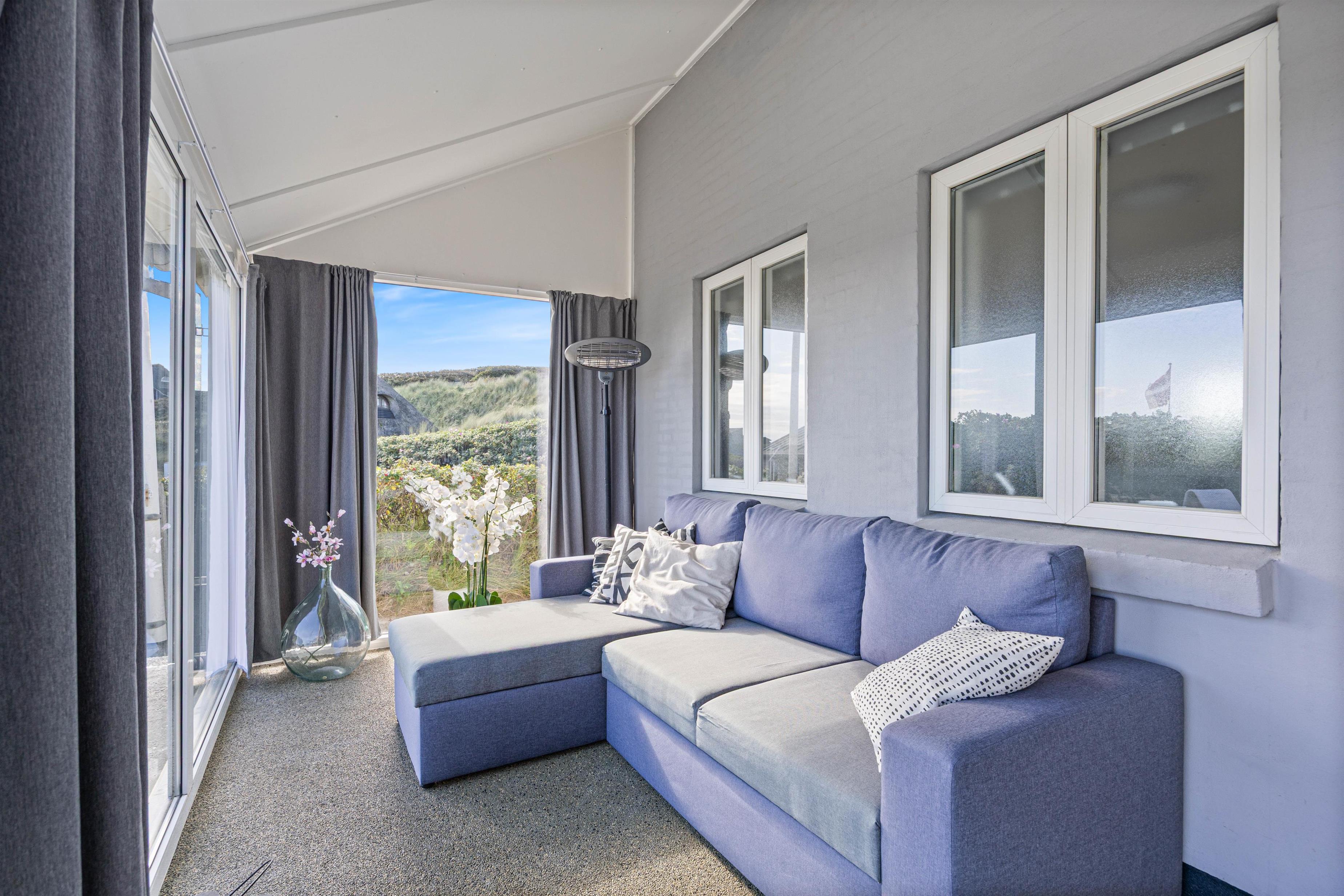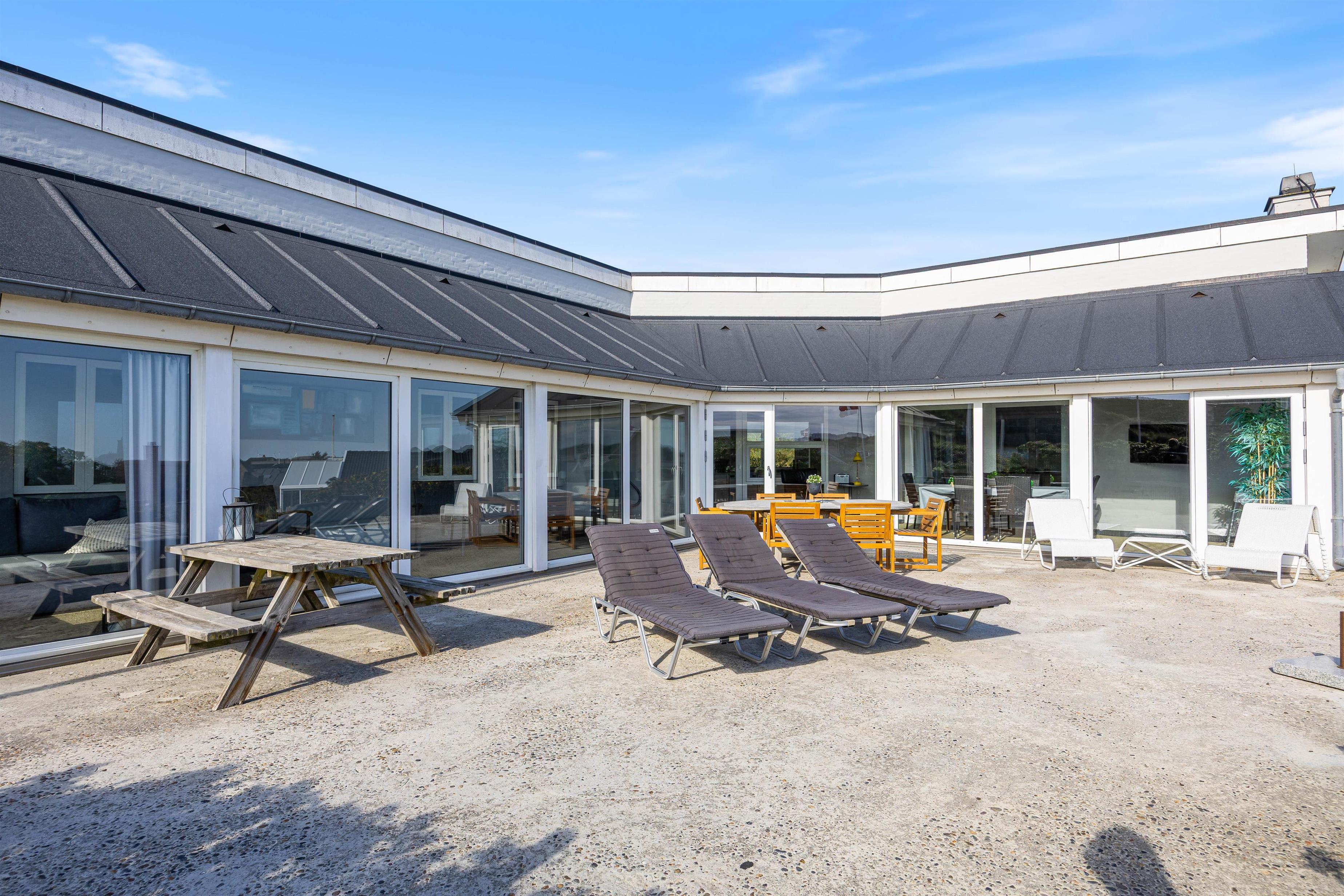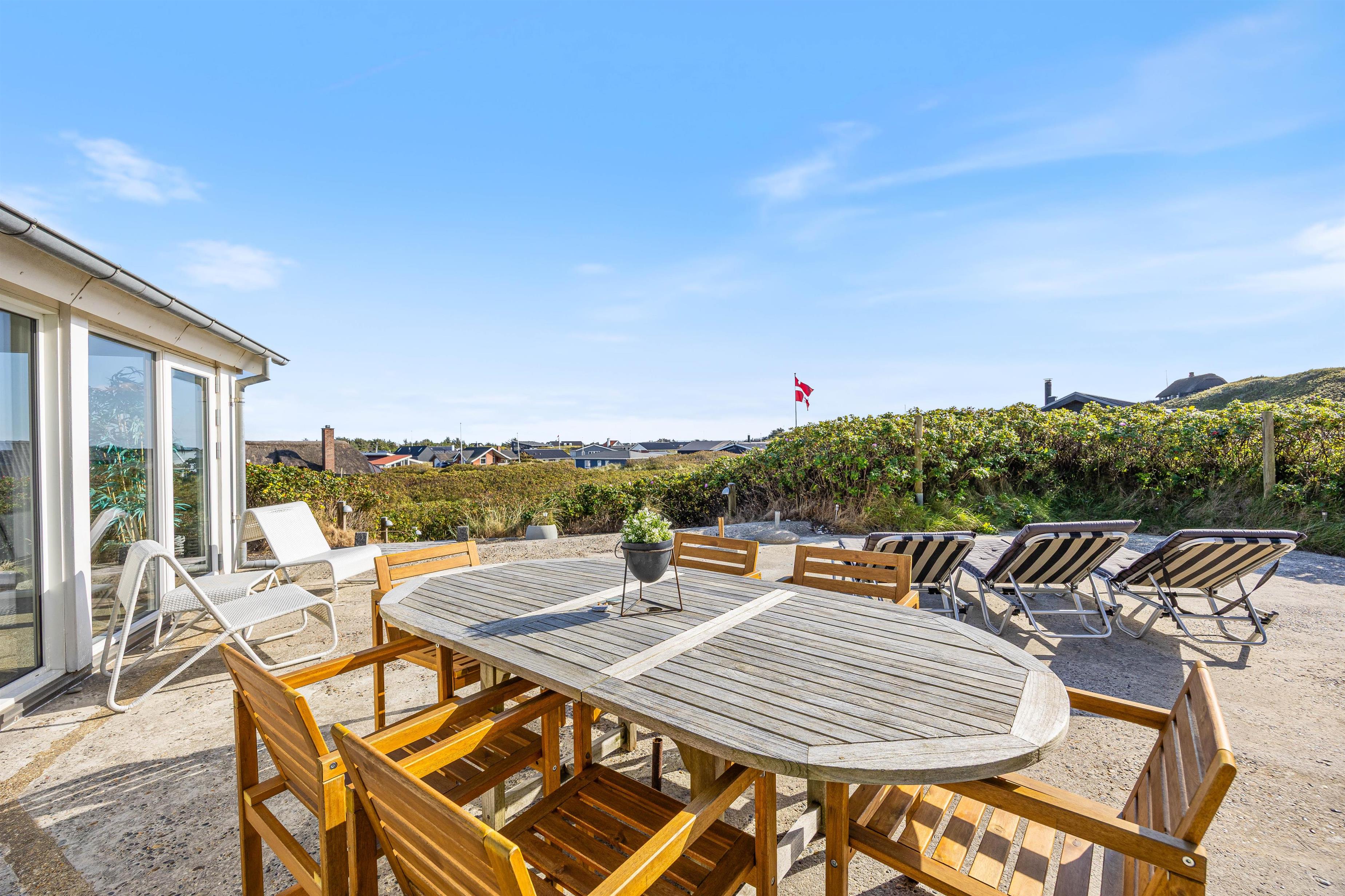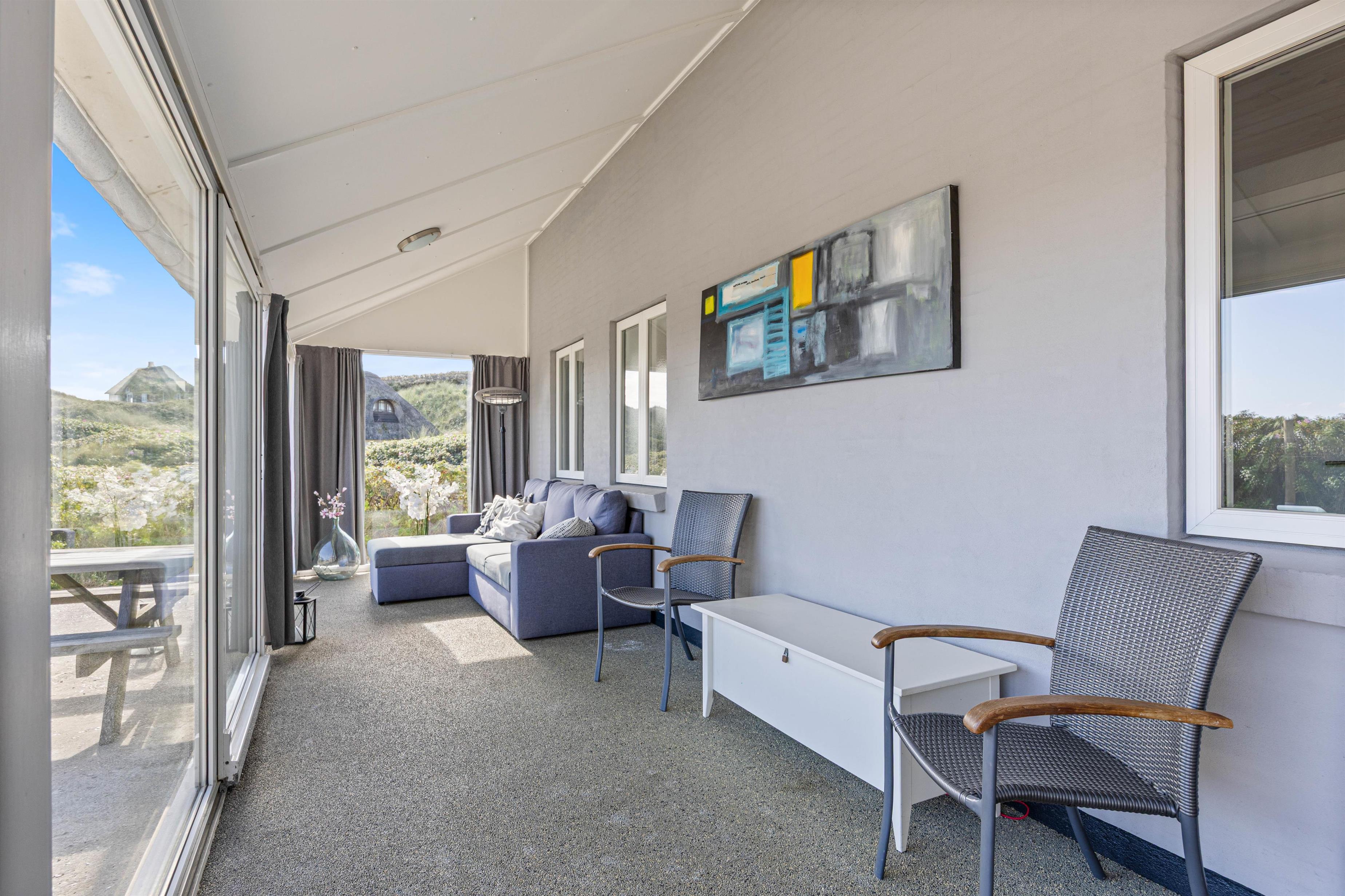 Feriehuset har to dejlige terasser mod nord/øst og syd/vest. Fra terrasserne kan I følge solens gang hele dagen. Ydermere kan I læne jer tilbage i de tilhørende havemøbler og liggestole til sommerhuset samtidig med, at andre står for tilberedning af et lækkert måltid på grillen. Sommerhuset ligger blot et stenkast fra det storslåede Vesterhav og populære badestrand.