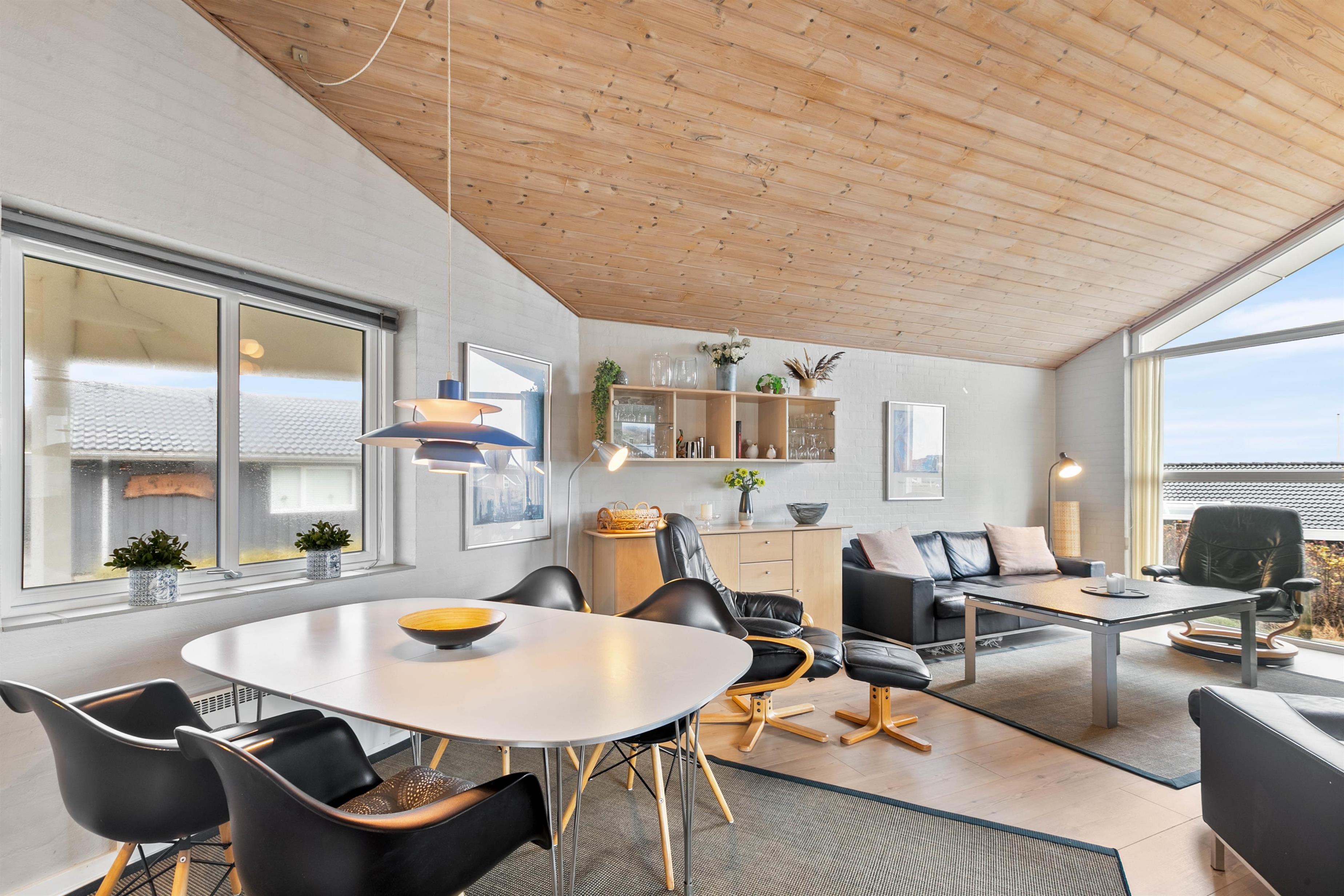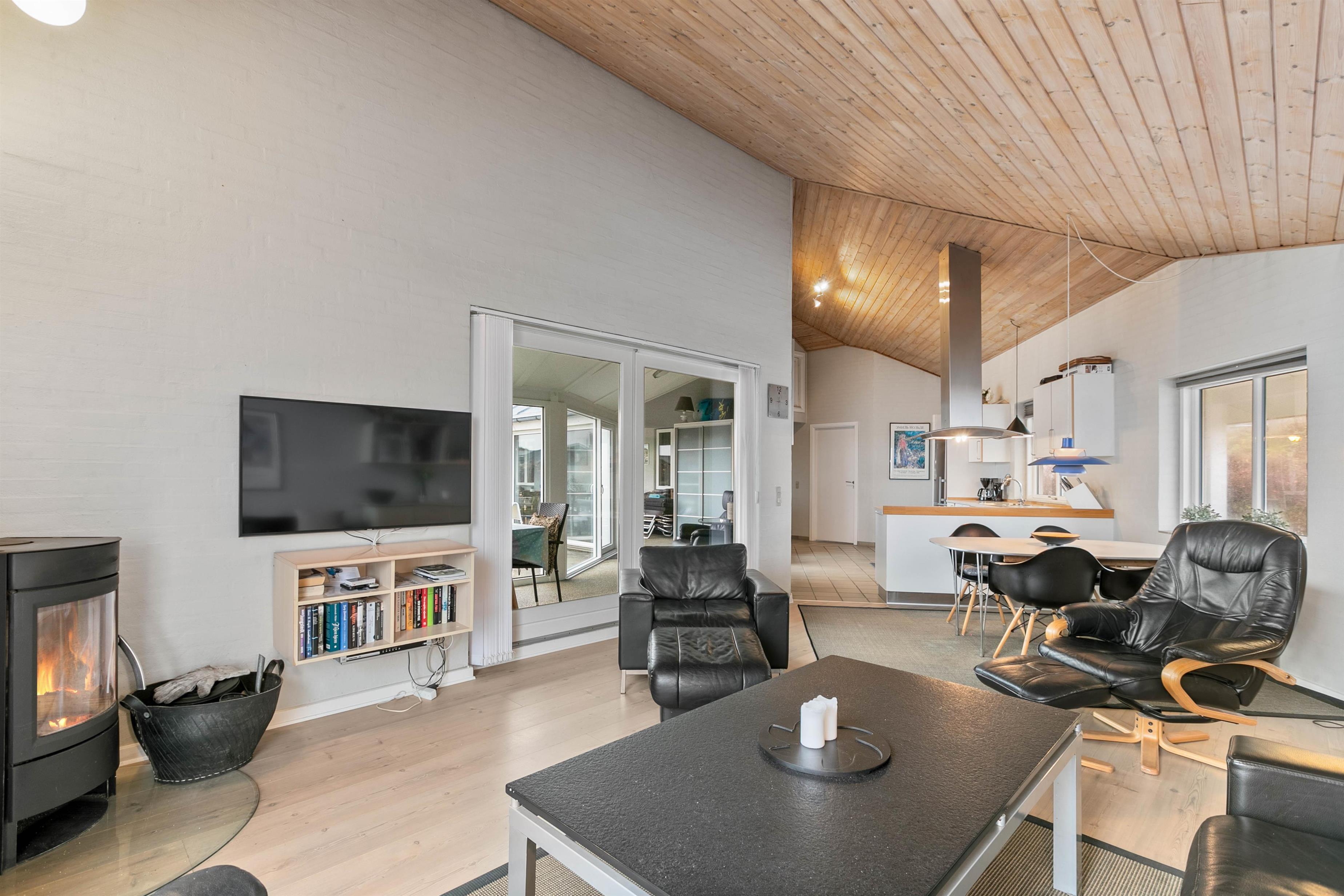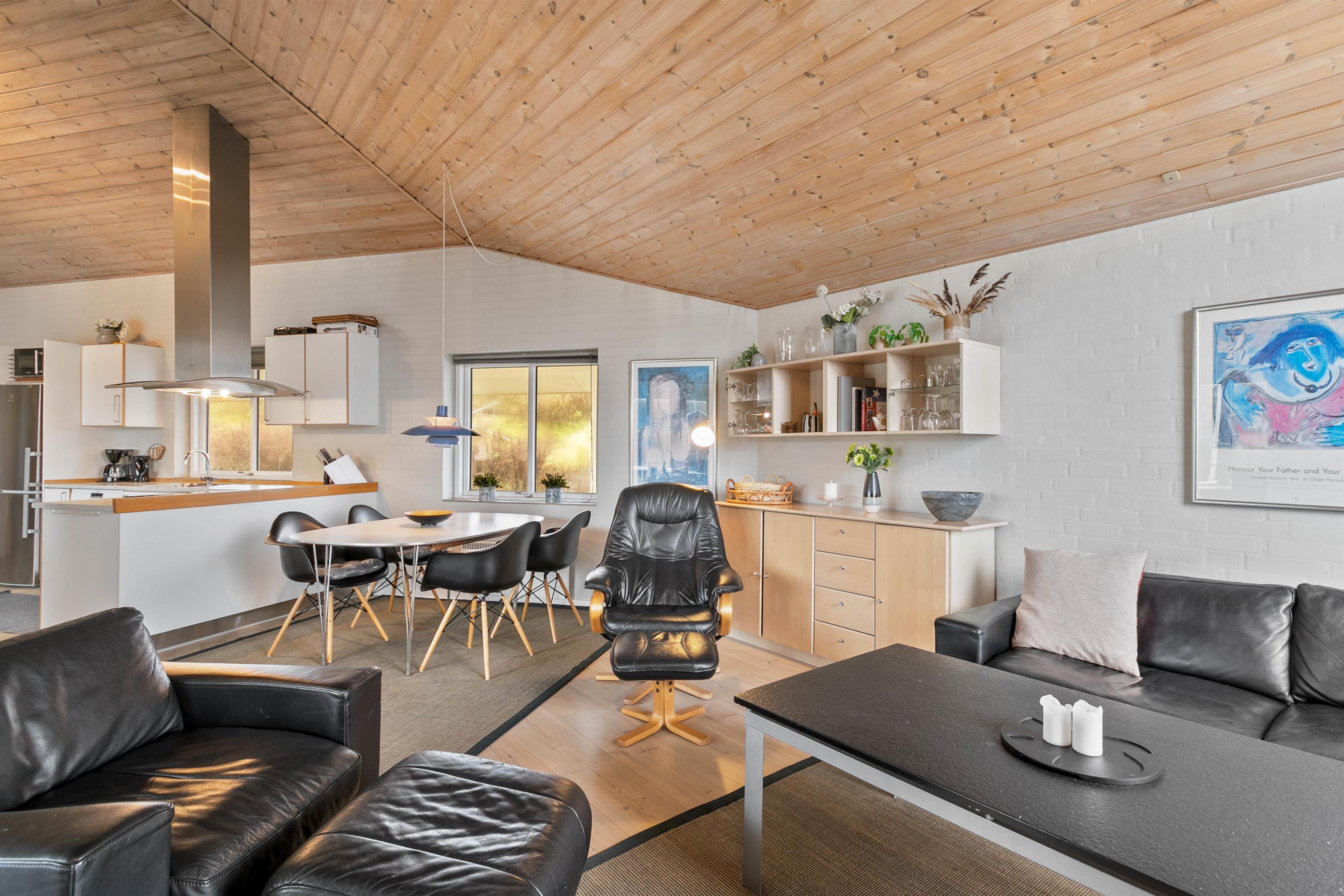 Feriehusets åbne køkken ligger i forlængelse med stuen, så I her har mulighed for enten at samles om madlavningen eller planlægge ugens oplevelser og aktiviteter. I har desuden også mulighed for at smide jer i sofaen med en god bog, en god film eller spille et spil sammen, imens I nyder varmen fra feriehusets brændeovn.