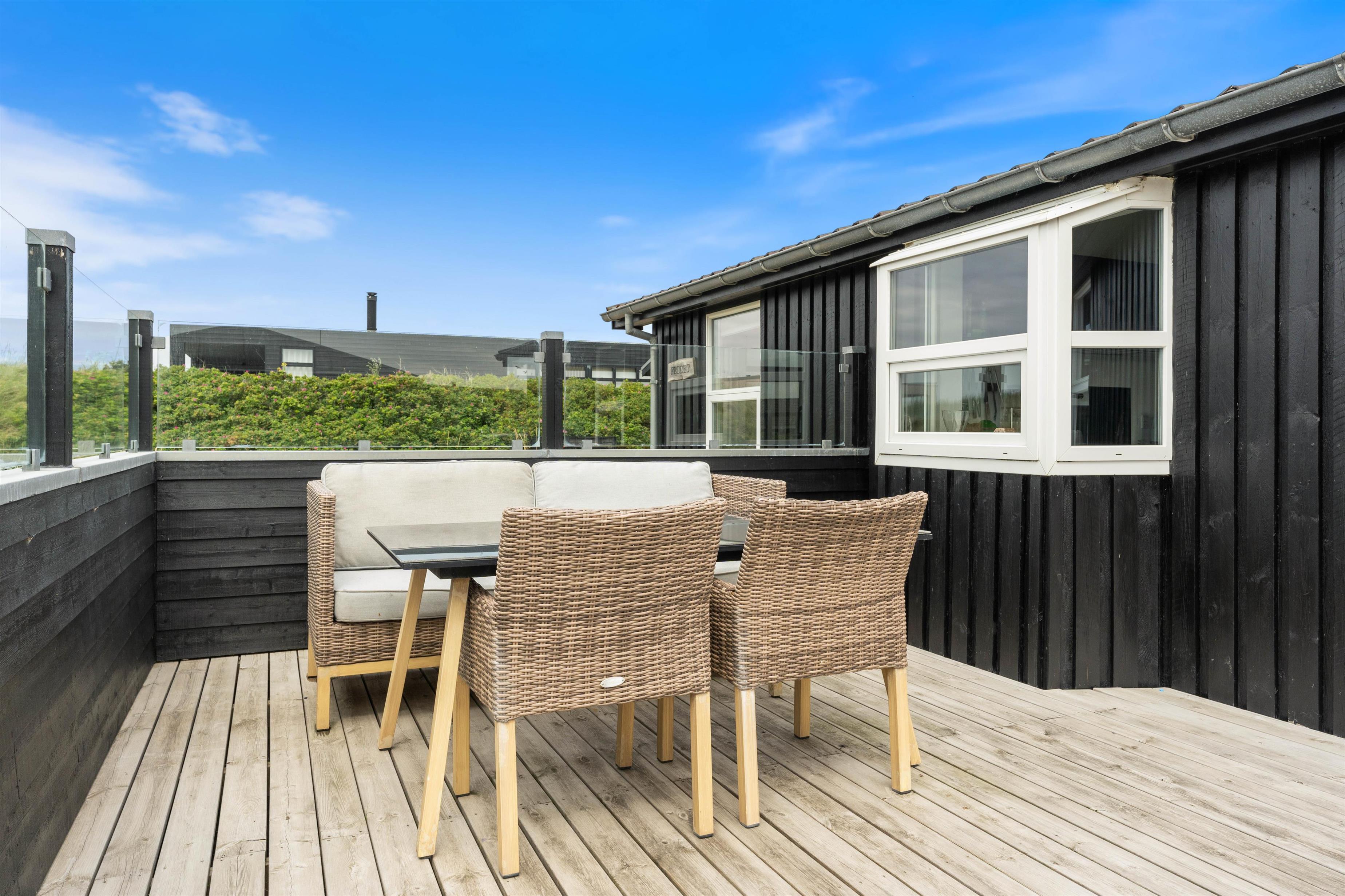 Terrassen er dejligt stor og byder på mange muligheder. I kan nyde solen på liggestolene eller læse en god bog. Eller hvad med at nyde en hyggelig grill-middag på en lun sommeraften? Og har I hund eller småbørn med på ferien er den lukkede terrasse perfekt til leg, uden de voksne behøver have et øje på hver finger.