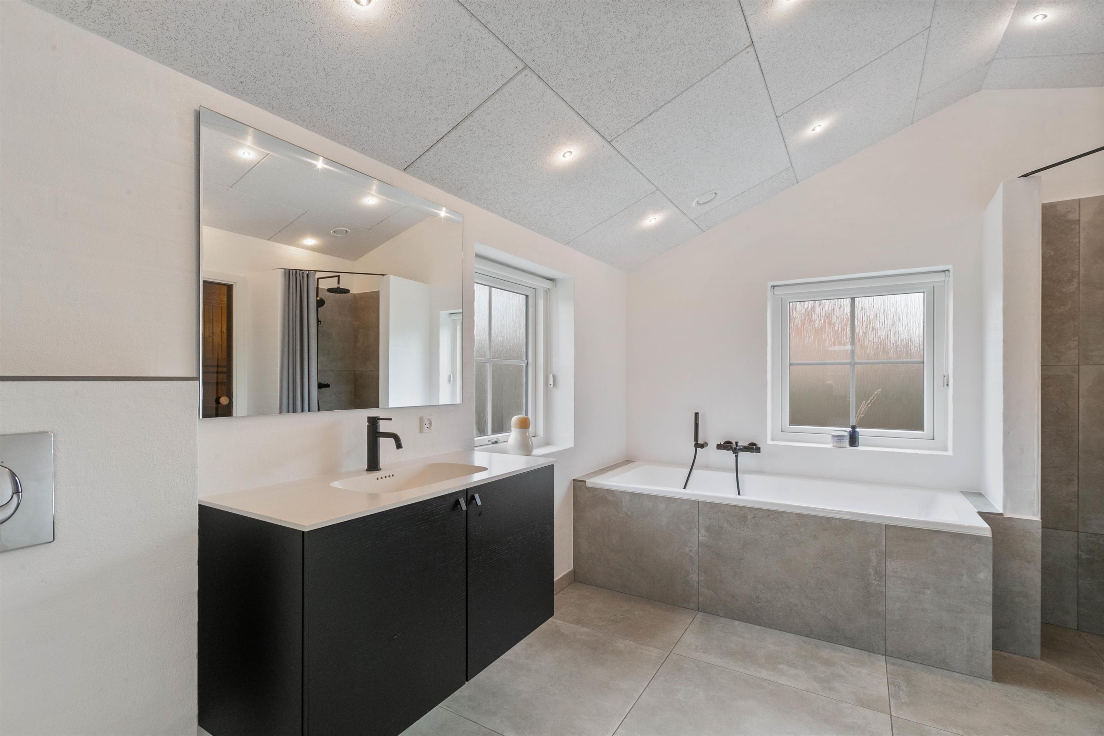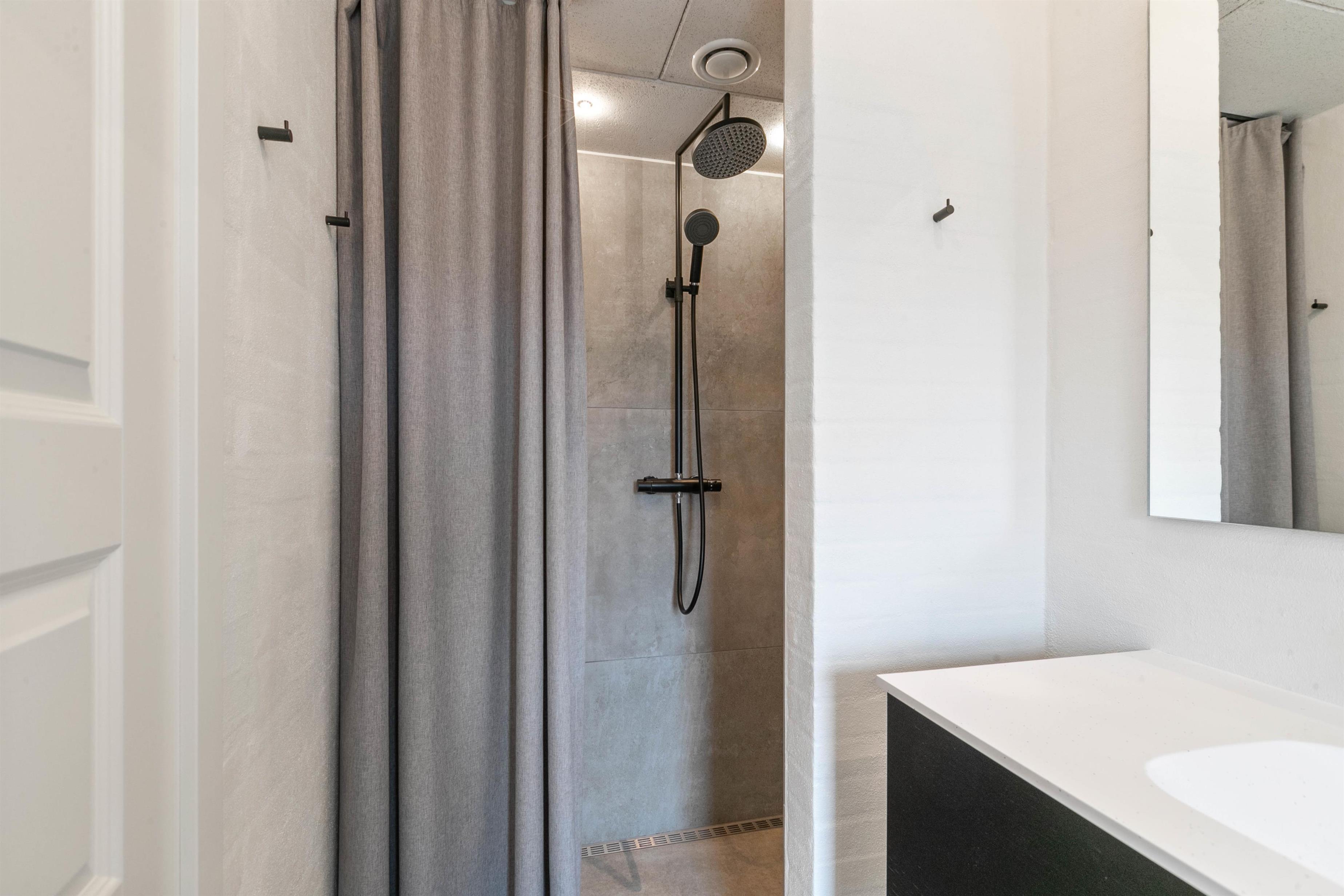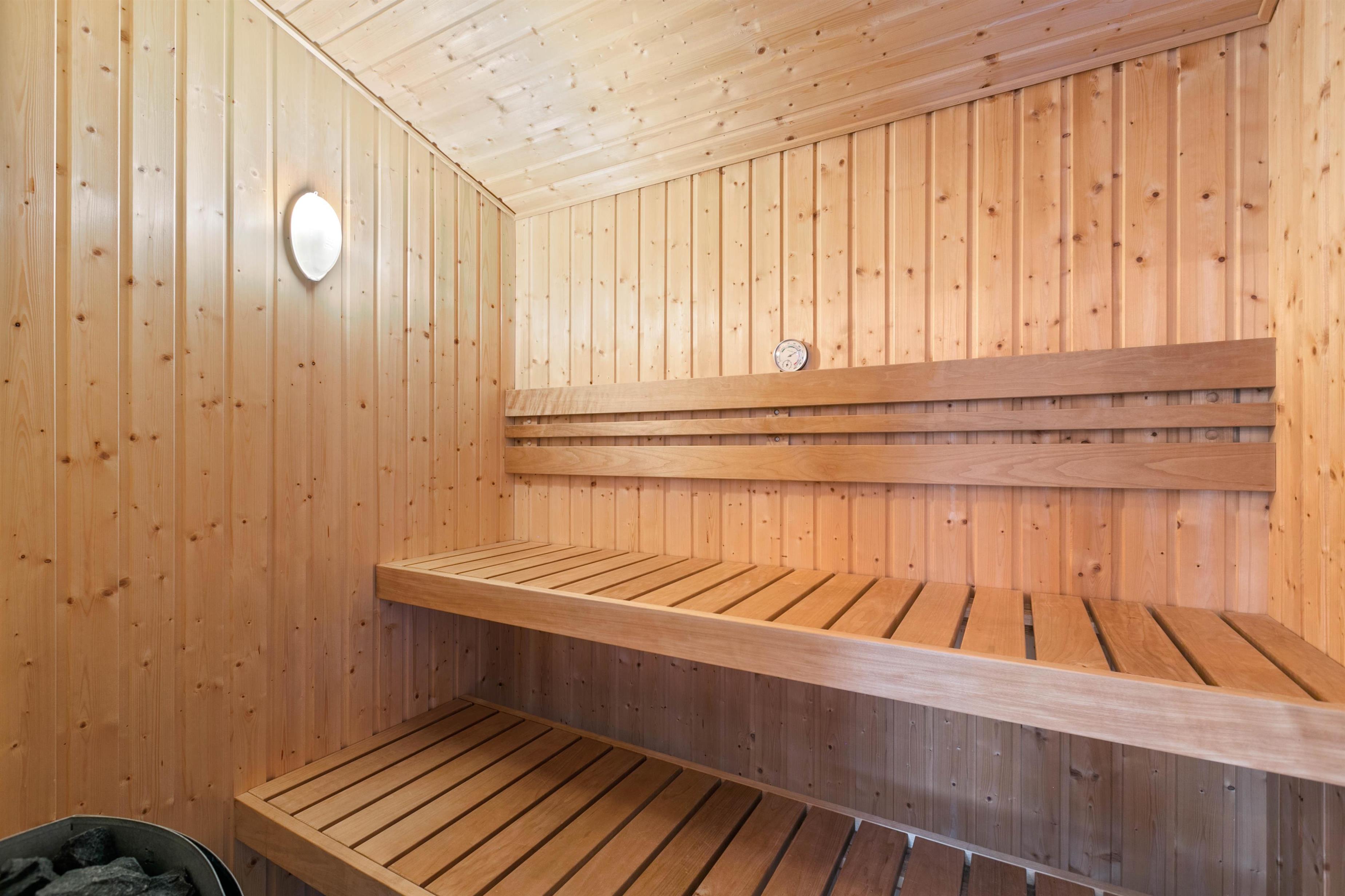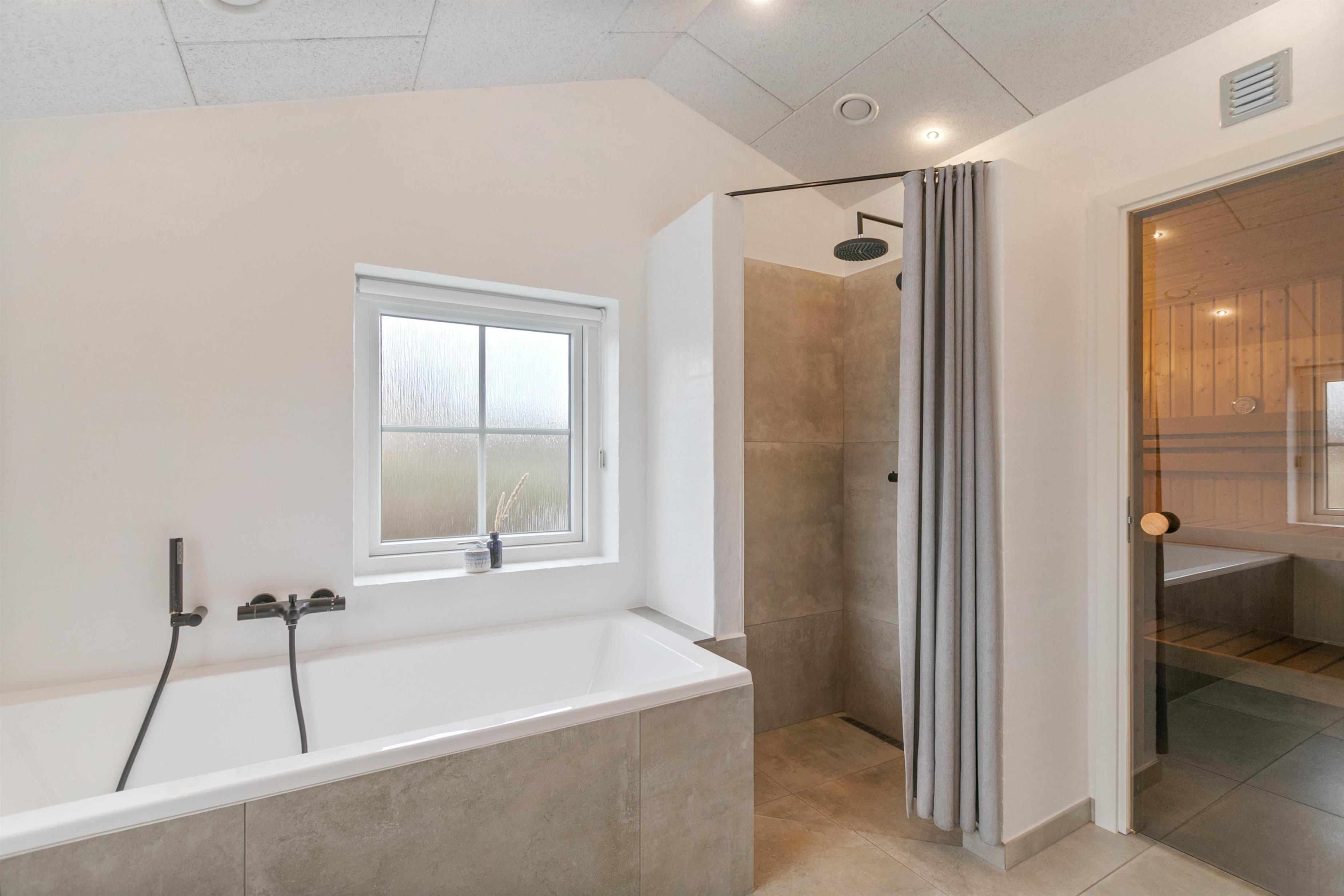 Fra et af de gode soveværelser er der adgang til eget badeværelse, mens det største badeværelse er med tilgang fra gangen - her finder I den dejlige sauna, som står klar til at varme jer op med feriestemning.