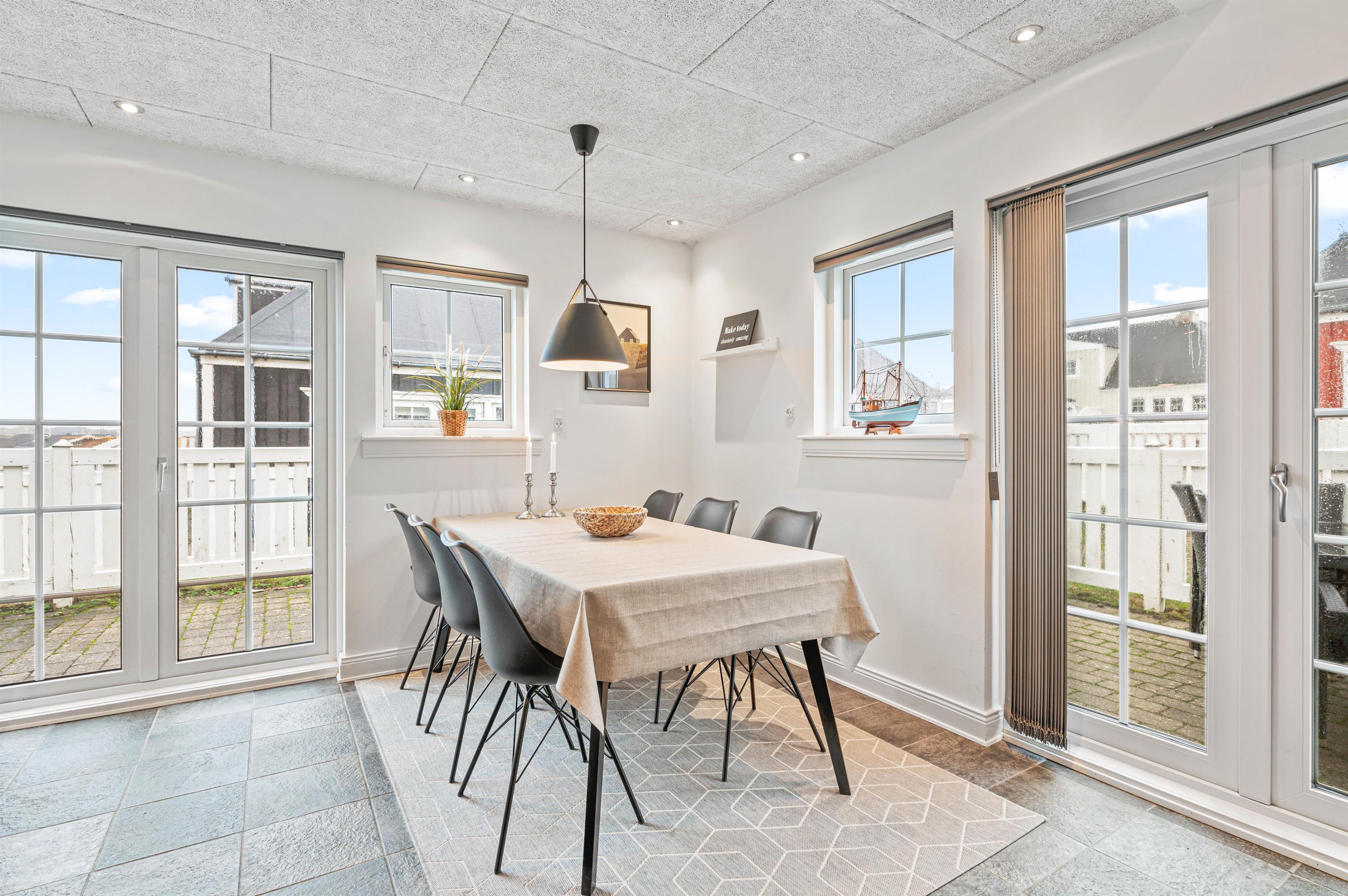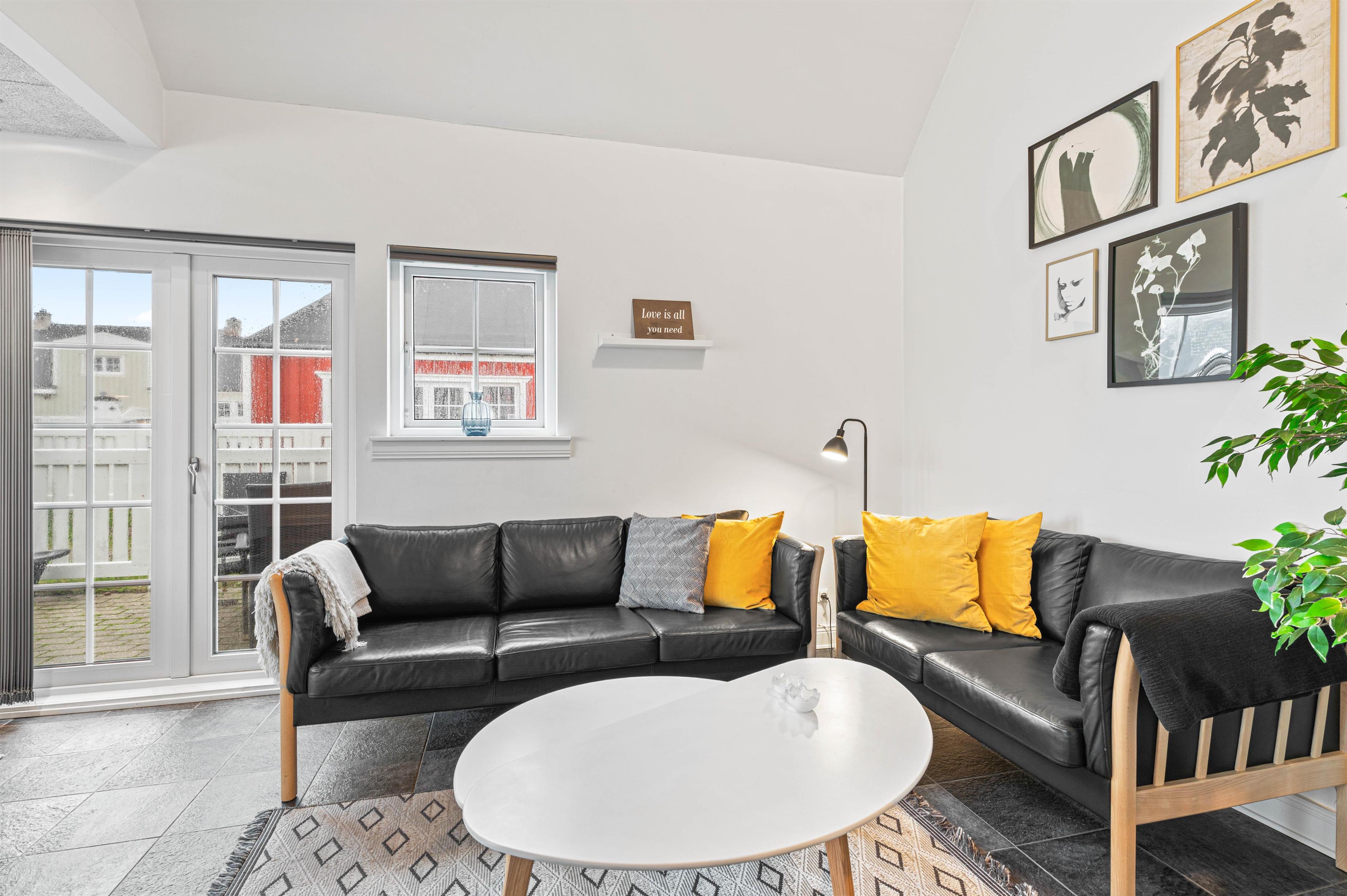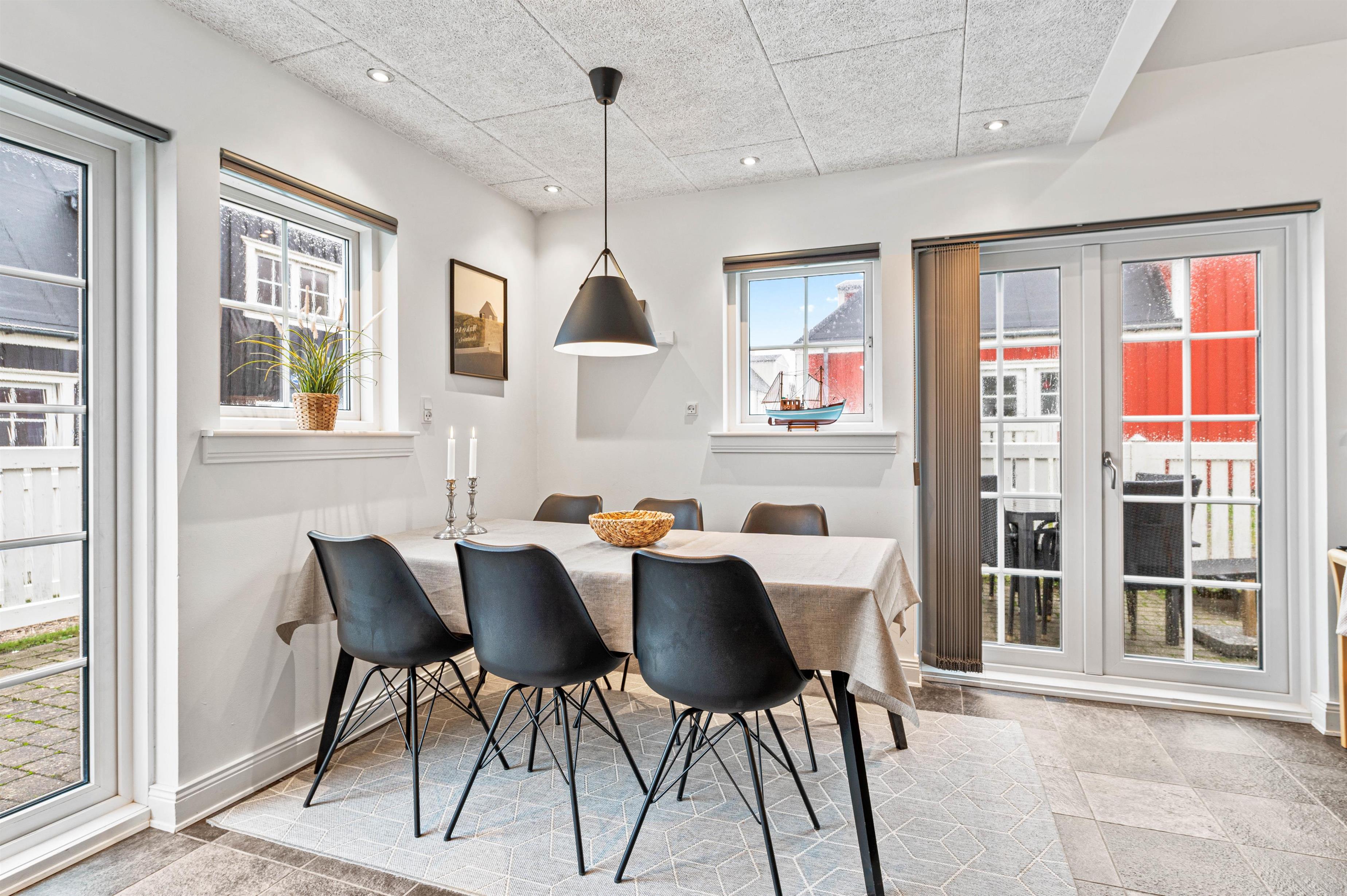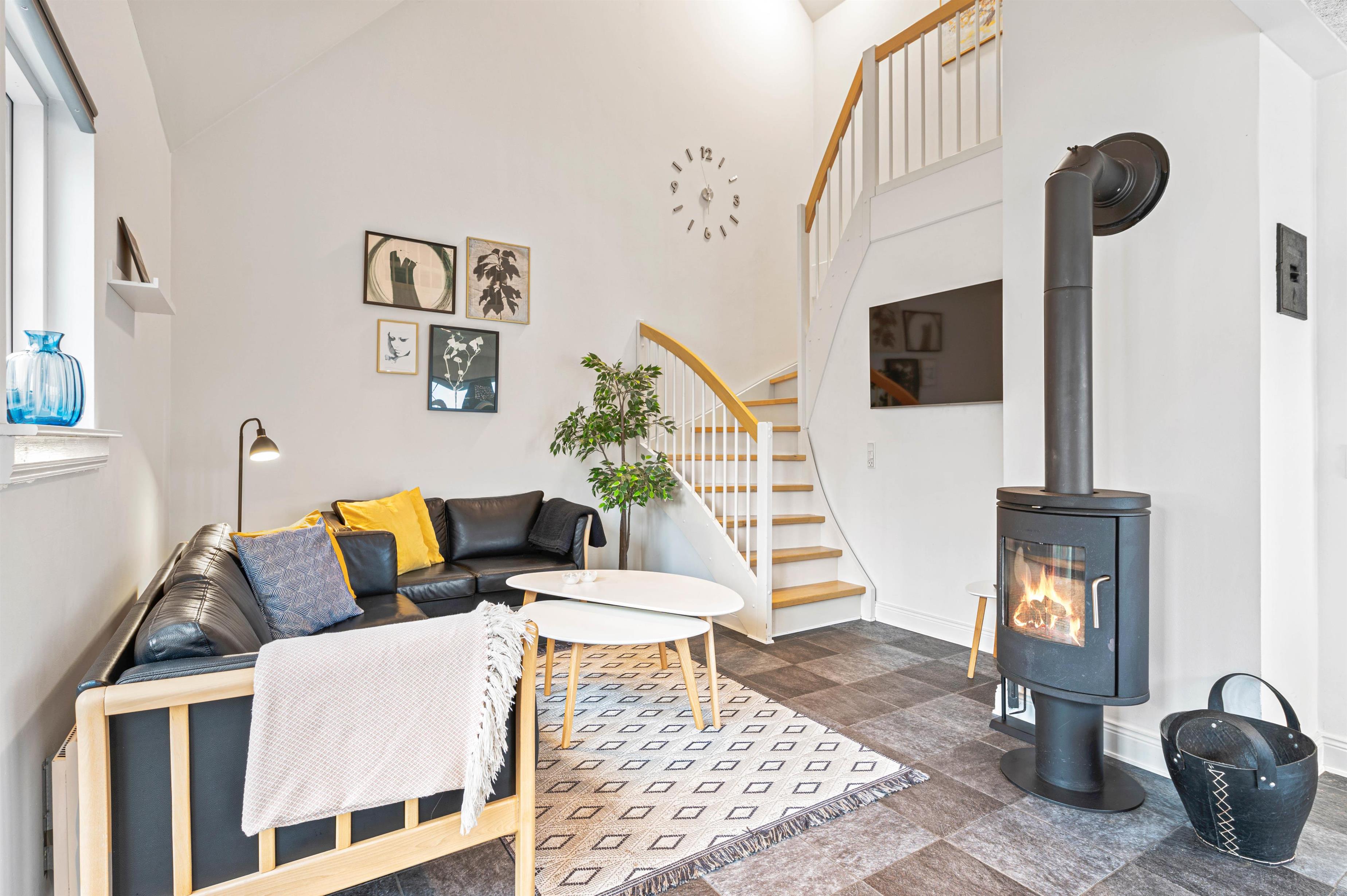 Ferielejlighedens køkken, spiseplads og stue ligger i forlængelse af hinanden, så I på denne måde har mulighed for at nyde hinandens selskab - Imens nogen står for aftensmaden, kan andre tage et spil eller slappe af i sofaen med en varm kop te eller kaffe samtidig med, at gløderne og varmen fra brændeovnen er med at skabe en hyggelig ramme og atmosfære for den perfekte ferie. Køkken, spiseplads og stue ligger i ferielejlighedens stueetage, der fungerer som lejlighedens samlingspunktet på ferien.