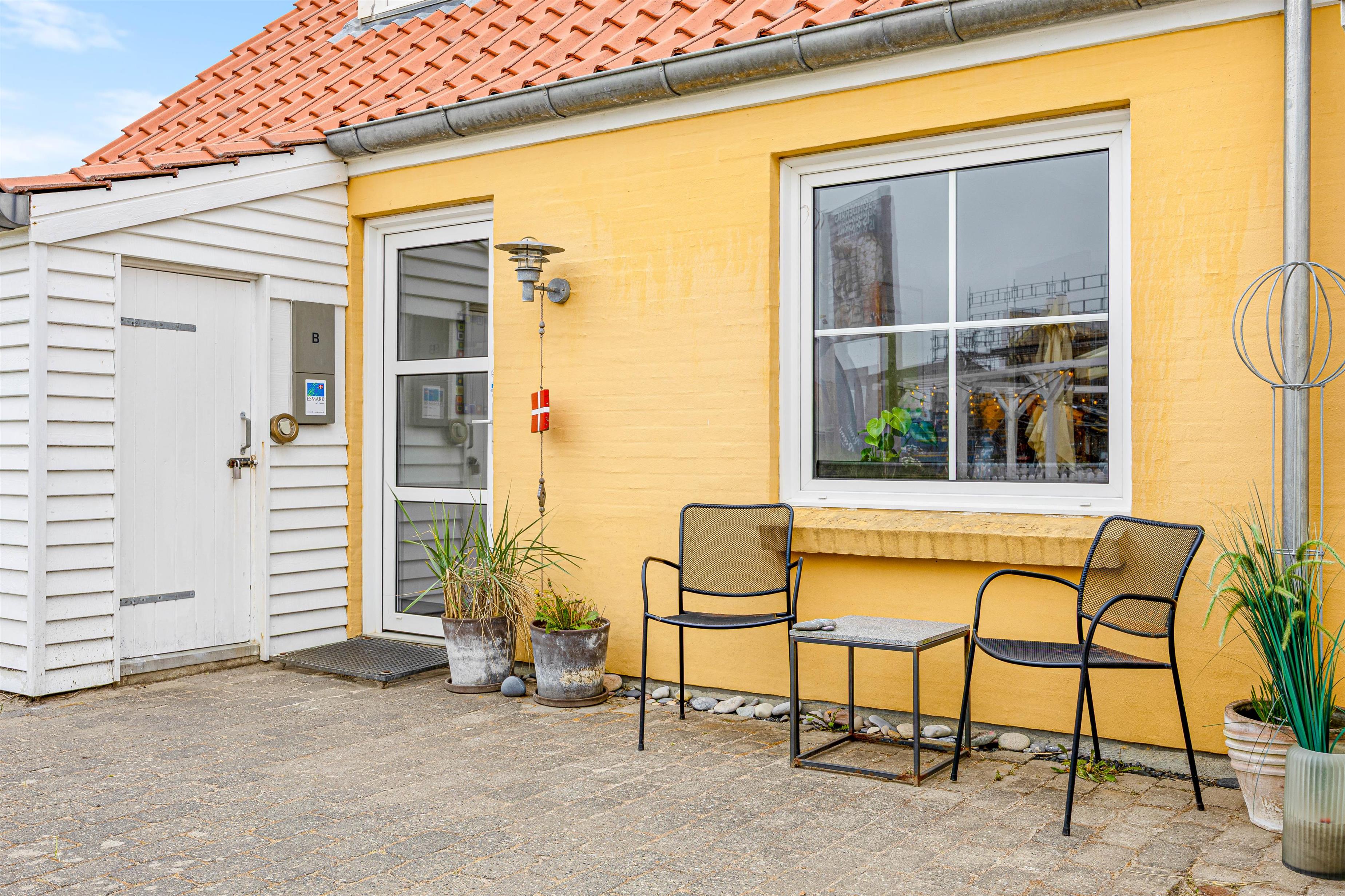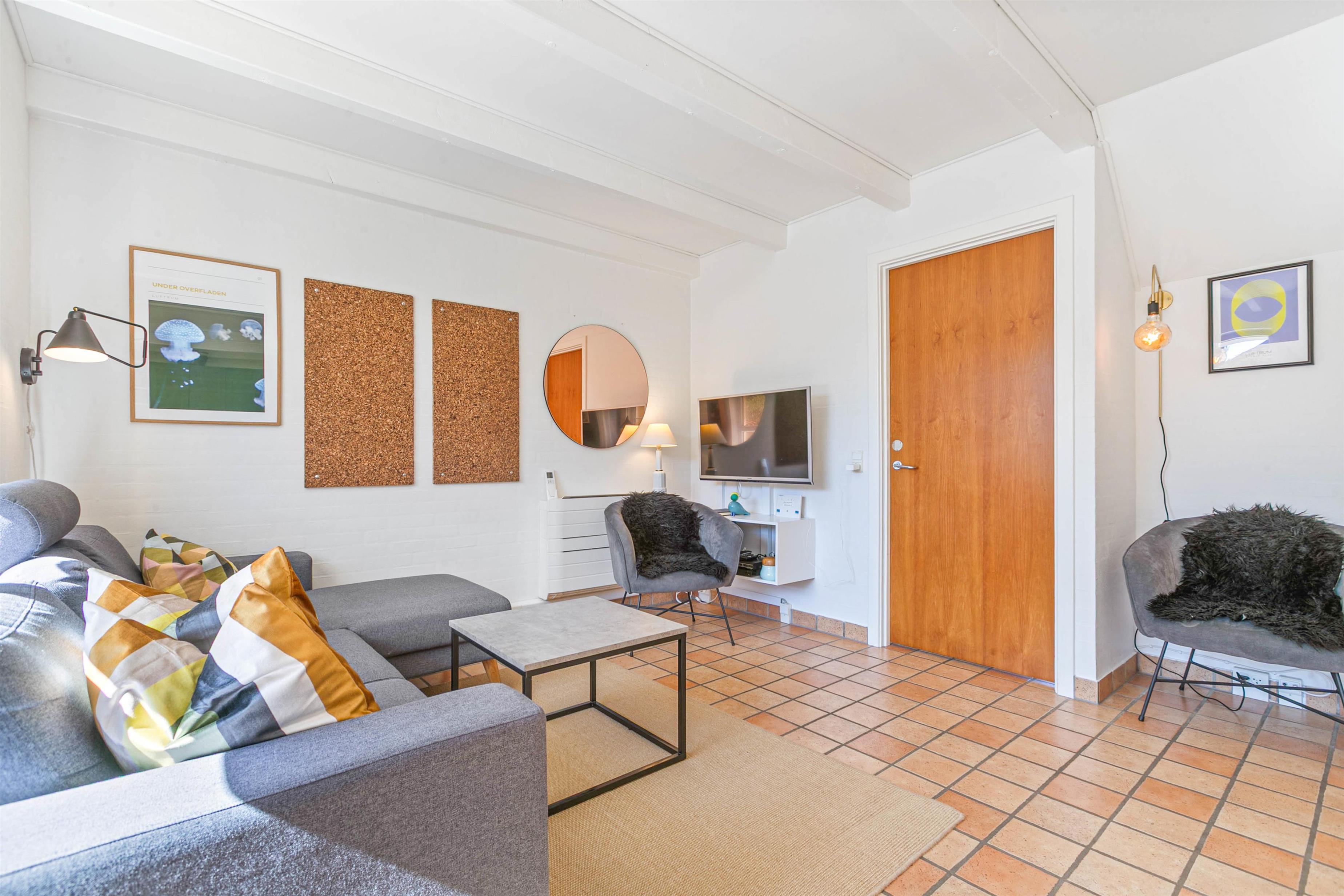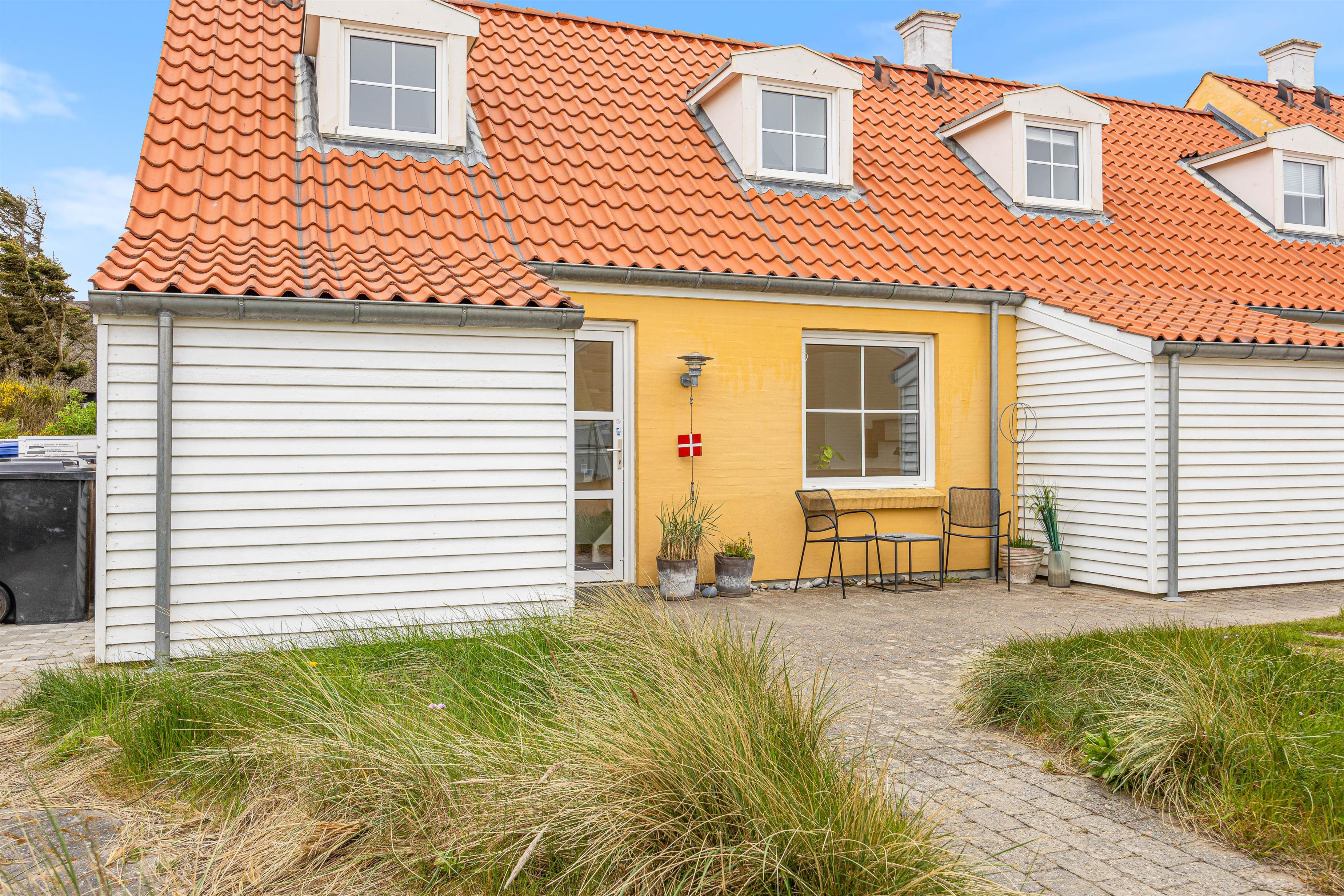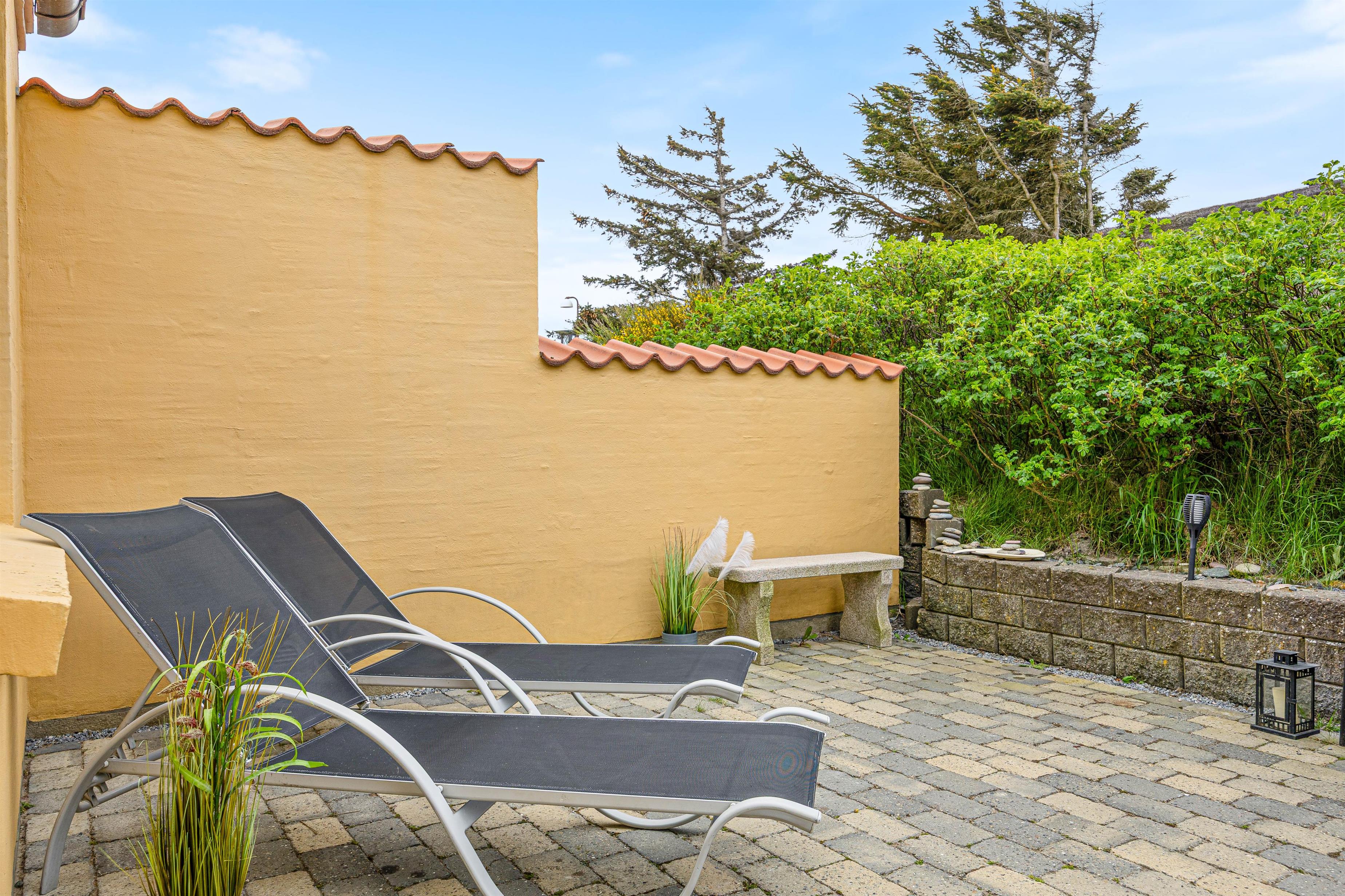 Fra midten af feriehuset har I tilmed adgang til den fine, sydvendte og lukkede terrasse med parasol og 2 liggestole. Den lukkede terrasse er ideel, hvis I har børn eller hund med, og trods den helt centrale placering, midt i Søndervig, kan du stadig sidde helt ugeneret på terrassen.