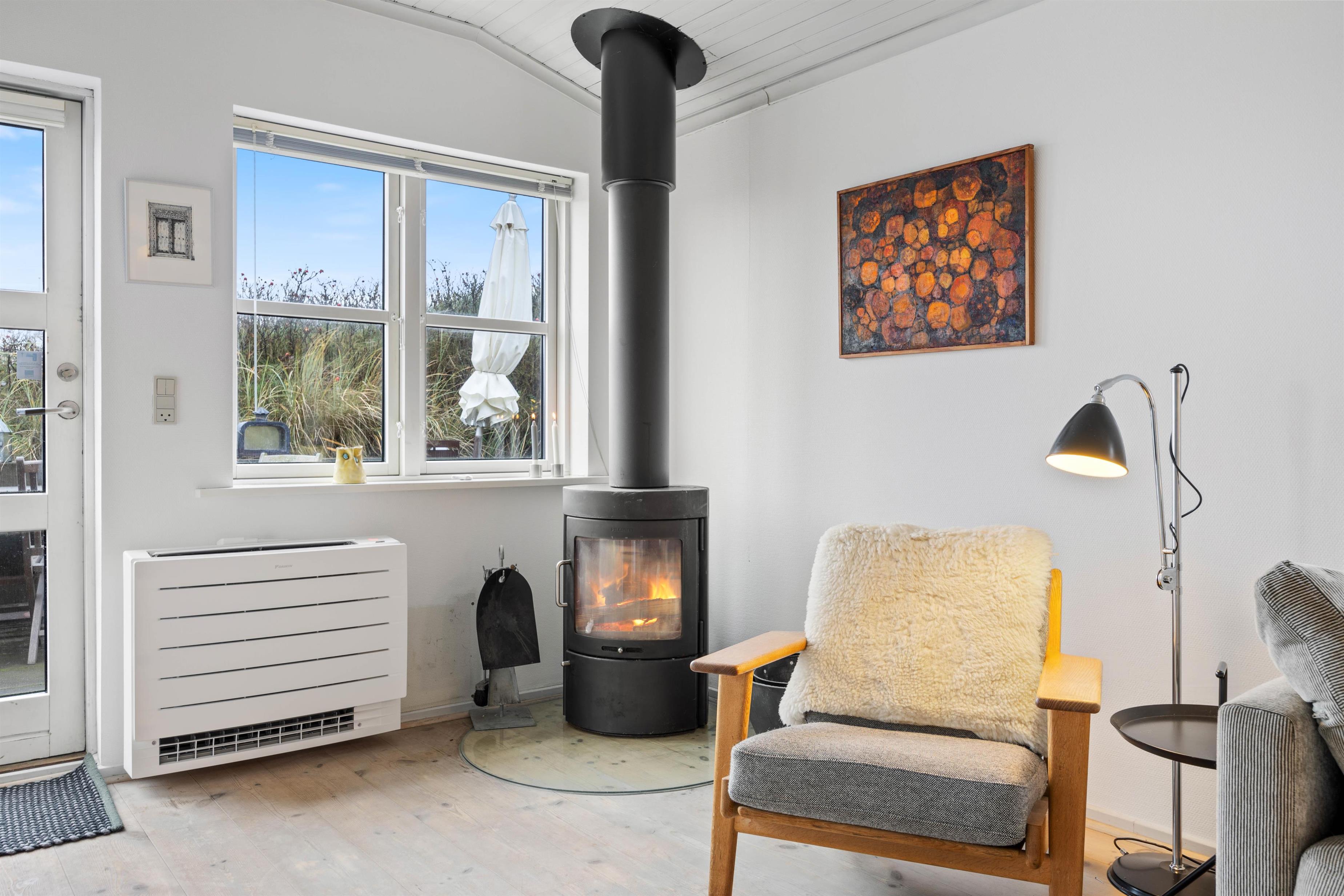 Når I træder ind i sommerhuset, mødes I af en lys opholdsstue med integreret køkken og spiseplads. Opholdsstuen er sommerhusets hjerte, hvor I kan være sammen og planlægge feriens aktiviteter. Køkkenet i sommerhuset er udstyret med et gaskomfur og en opvaskemaskine, så I ikke behøver at bekymre jer om opvasken. Brændeovnen i feriehuset sørger for hyggelig varme og en hyggelig feriehusstemning. Med en god bog og knitrende ild kan I virkelig gøre det behageligt for jer selv.