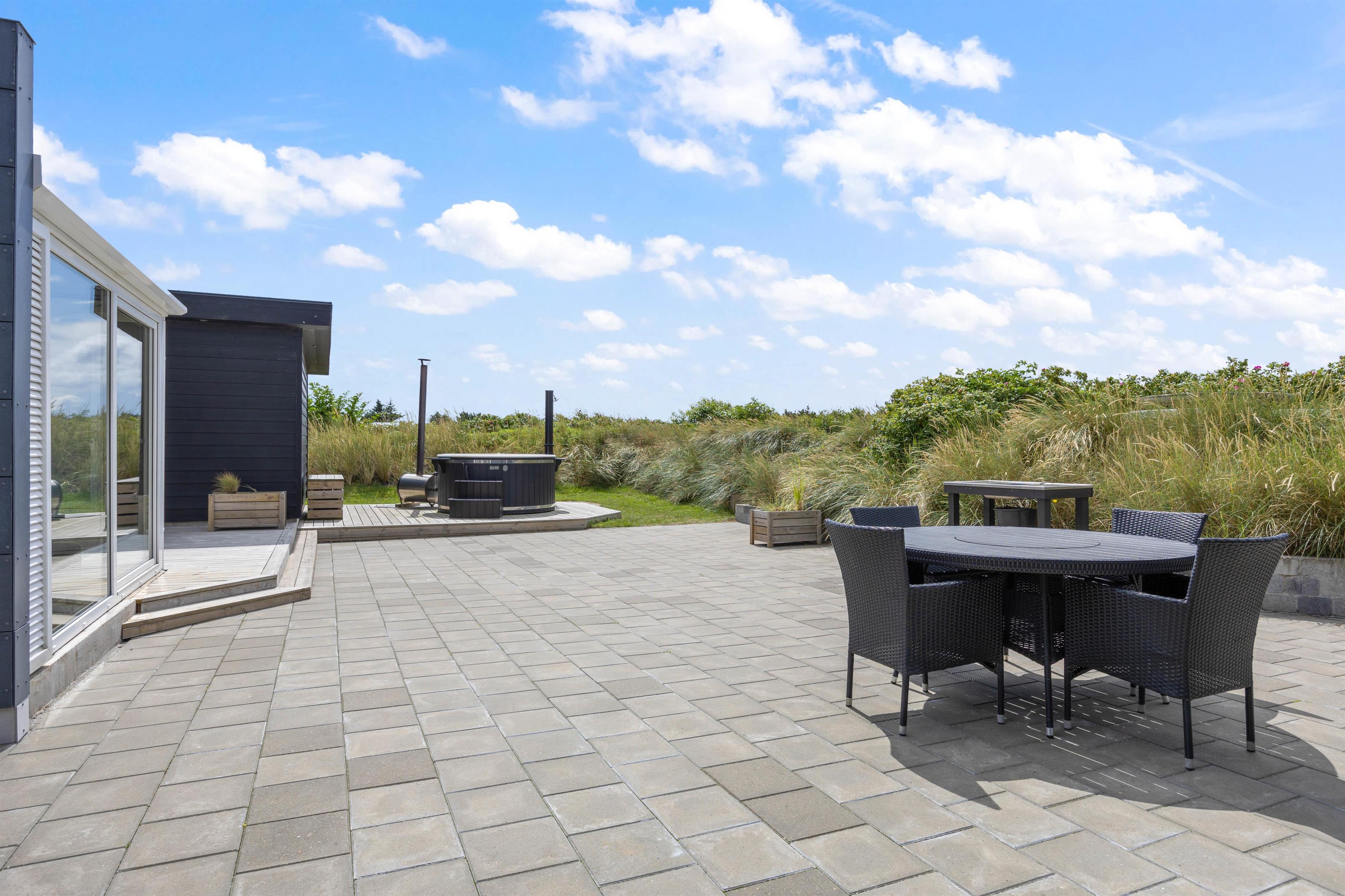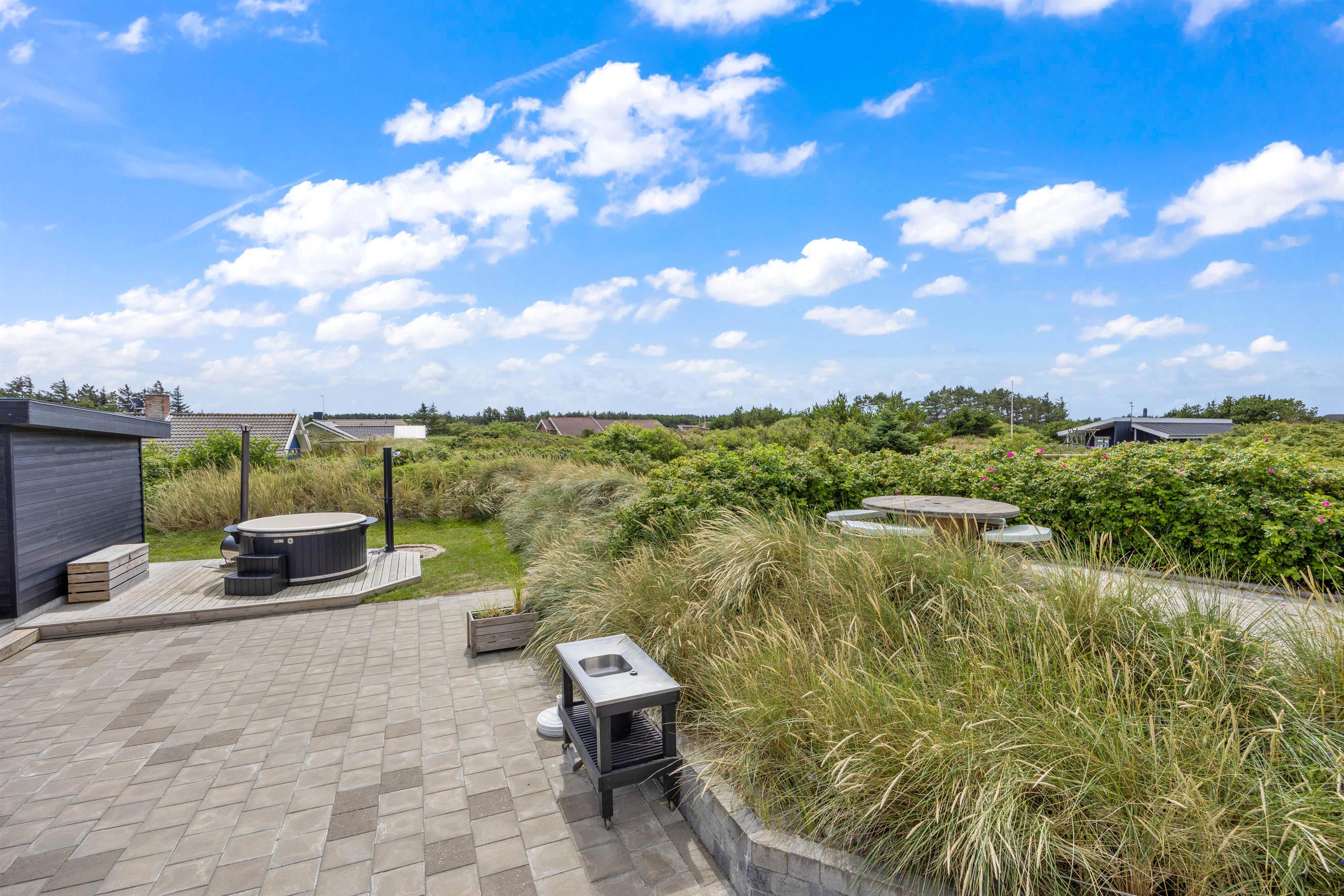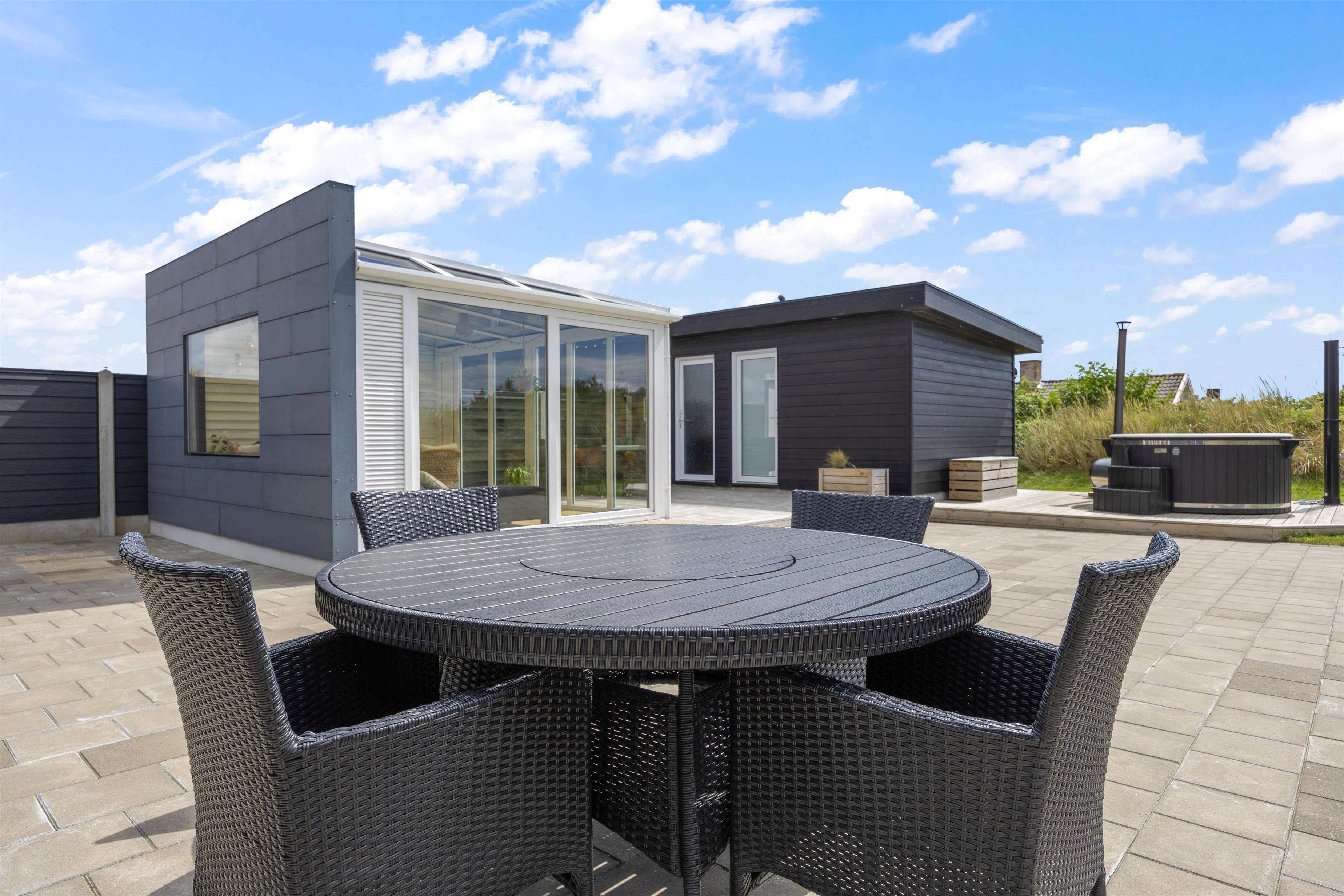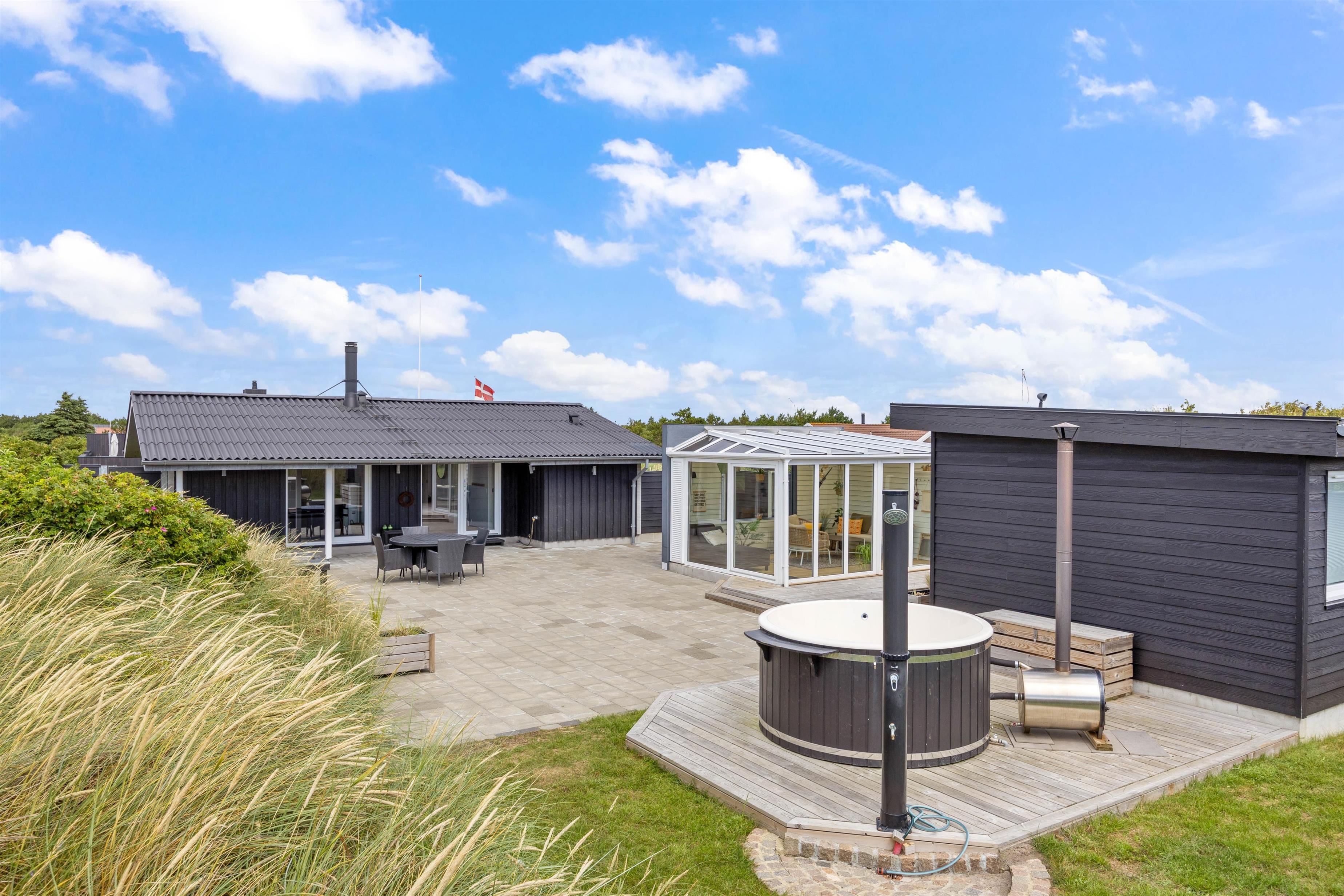 Sommerhusets højdepunkt er den lækre, afskærmede terrasse. Her er der ikke kun sørget for gode havemøbler, liggestole og grill. Der står også et stort vildmarksbad klar til at berige jeres ferie med de skønneste wellnessoplevelser under åben himmel. Efter en afslappende stund i vildmarksbadet kan I få en skyller under udendørsbruseren, som også er rigtig praktisk, når I kommer hjem fra en strandtur med fødderne sandet til. Udebruseren vil kunne tages i brug i perioden april til november.