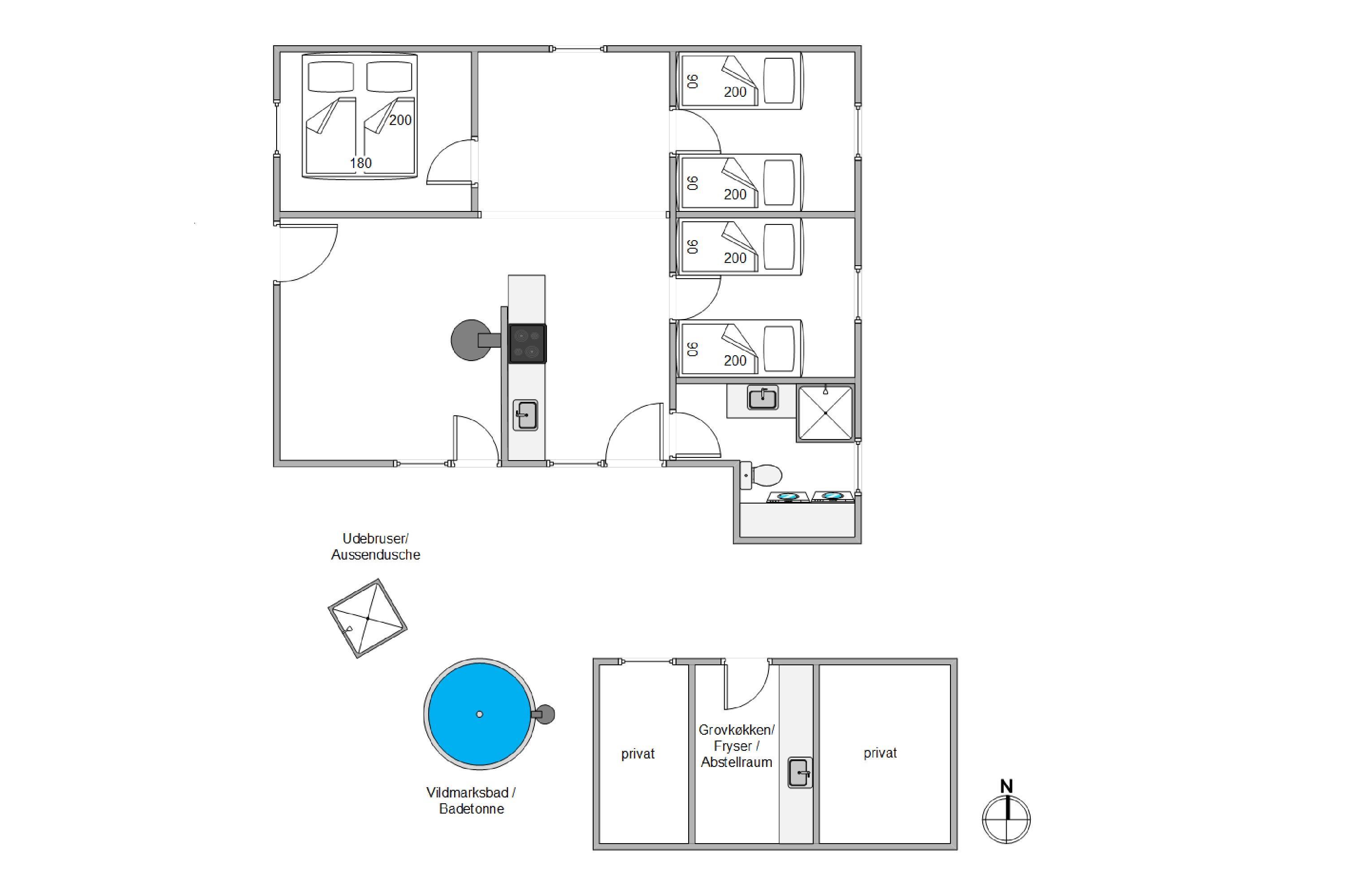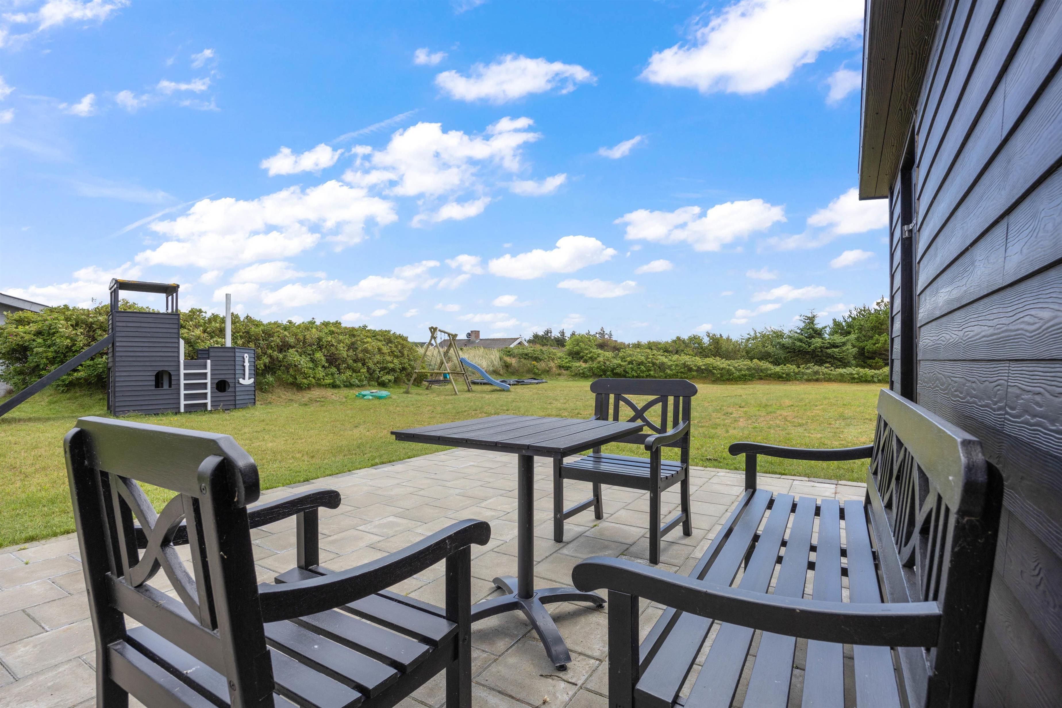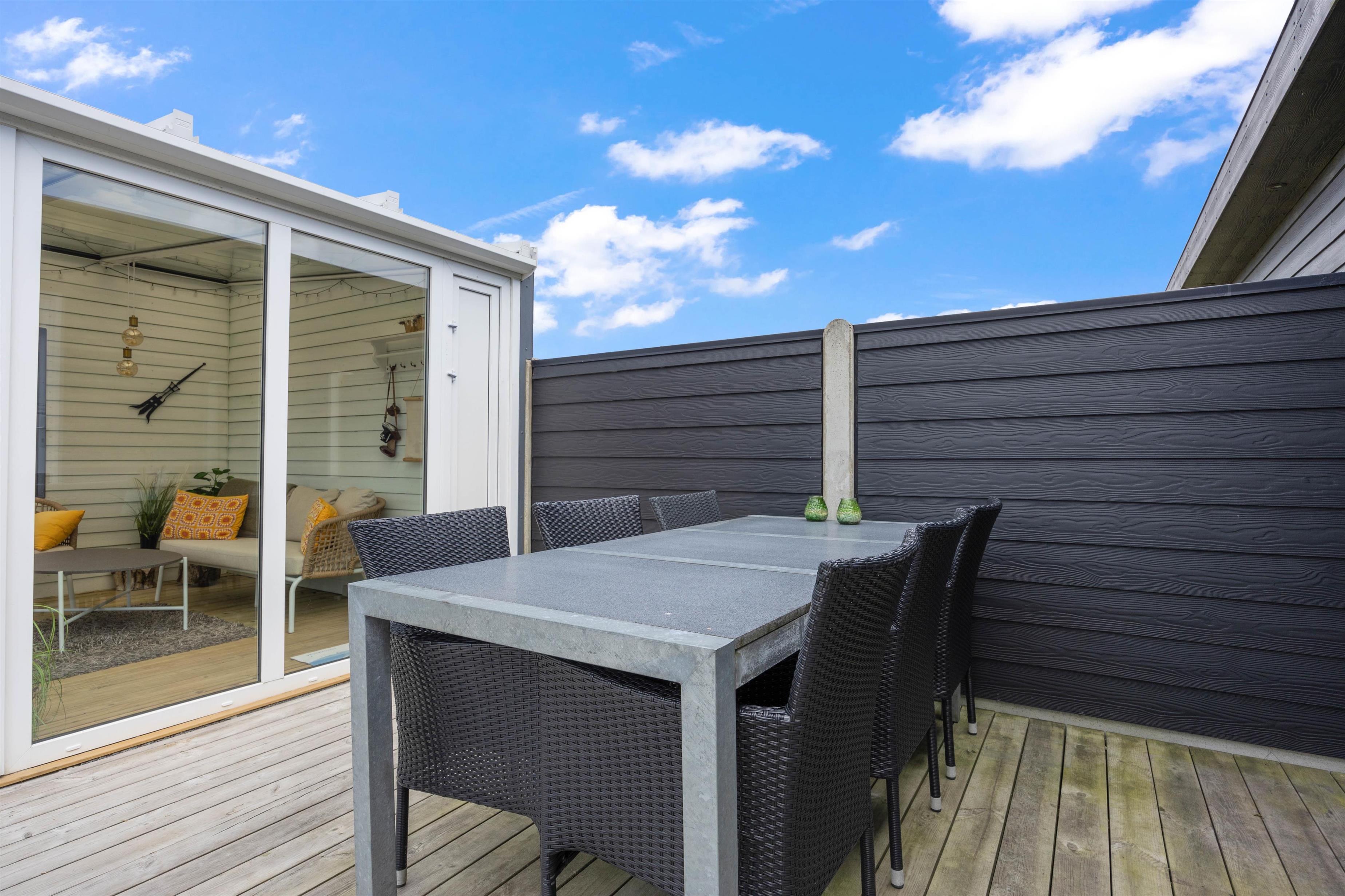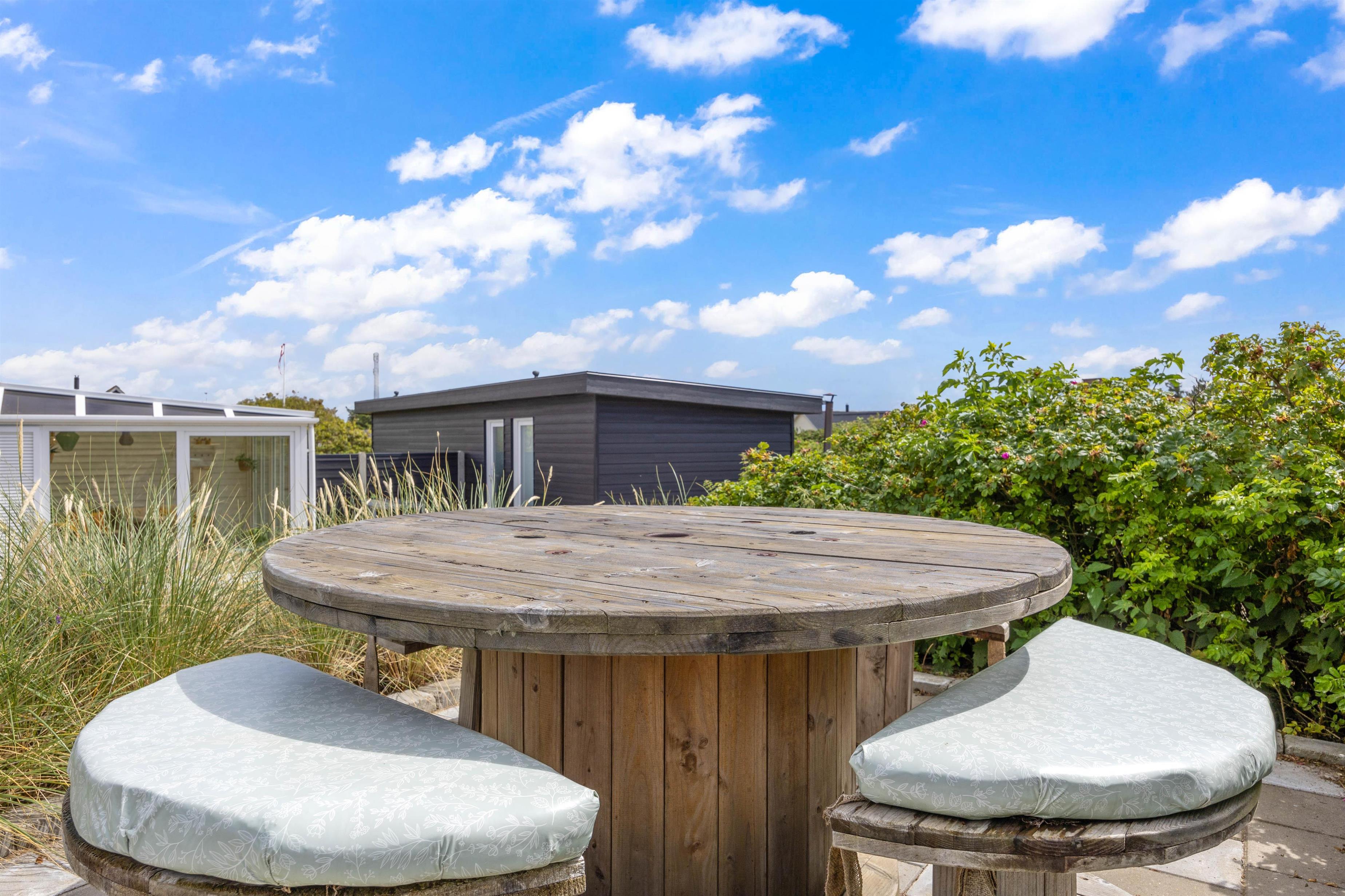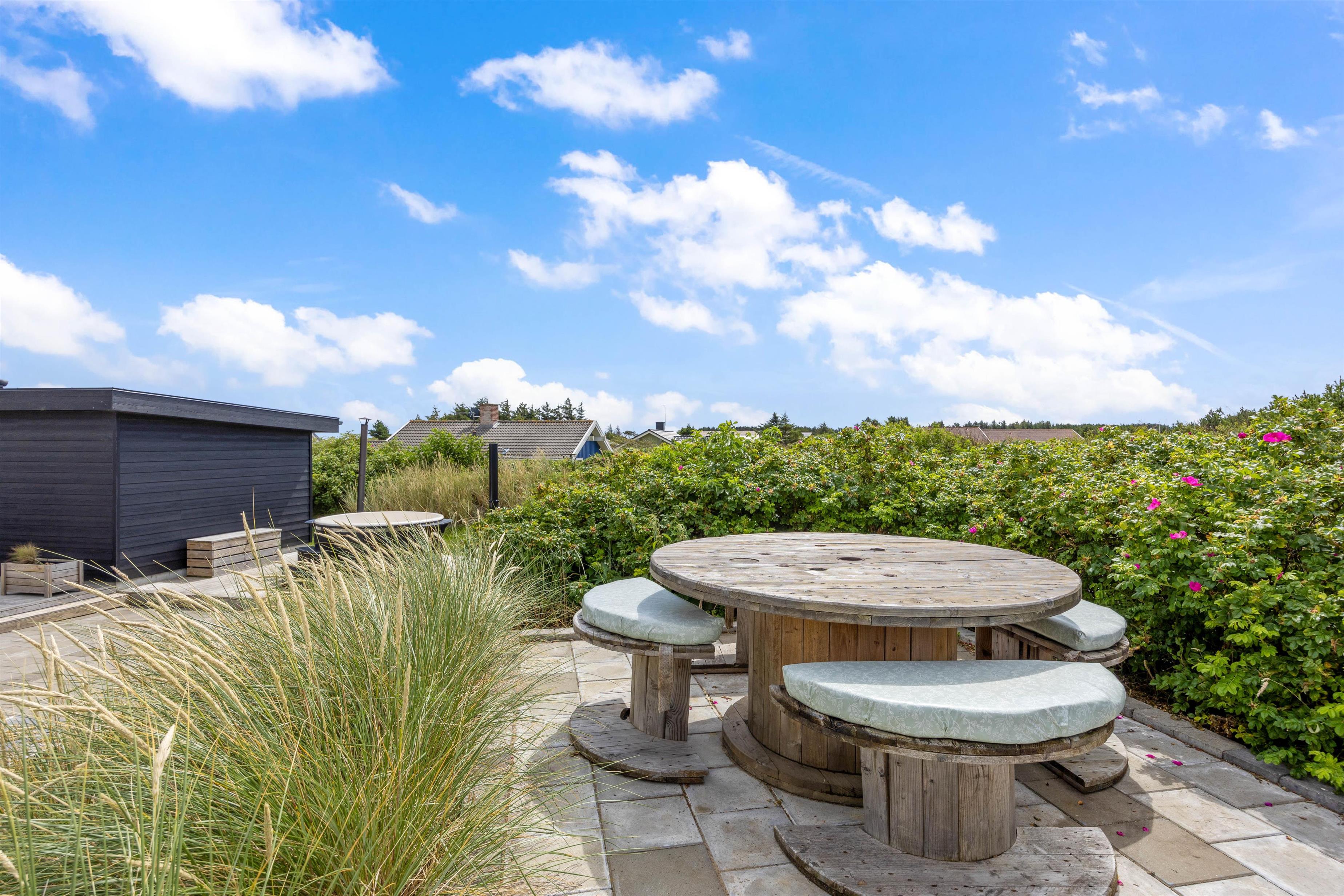 Sommerhusets højdepunkt er den lækre, afskærmede terrasse. Her er der ikke kun sørget for gode havemøbler, liggestole og grill. Der står også et stort vildmarksbad klar til at berige jeres ferie med de skønneste wellnessoplevelser under åben himmel. Efter en afslappende stund i vildmarksbadet kan I få en skyller under udendørsbruseren, som også er rigtig praktisk, når I kommer hjem fra en strandtur med fødderne sandet til. Udebruseren vil kunne tages i brug i perioden april til november.