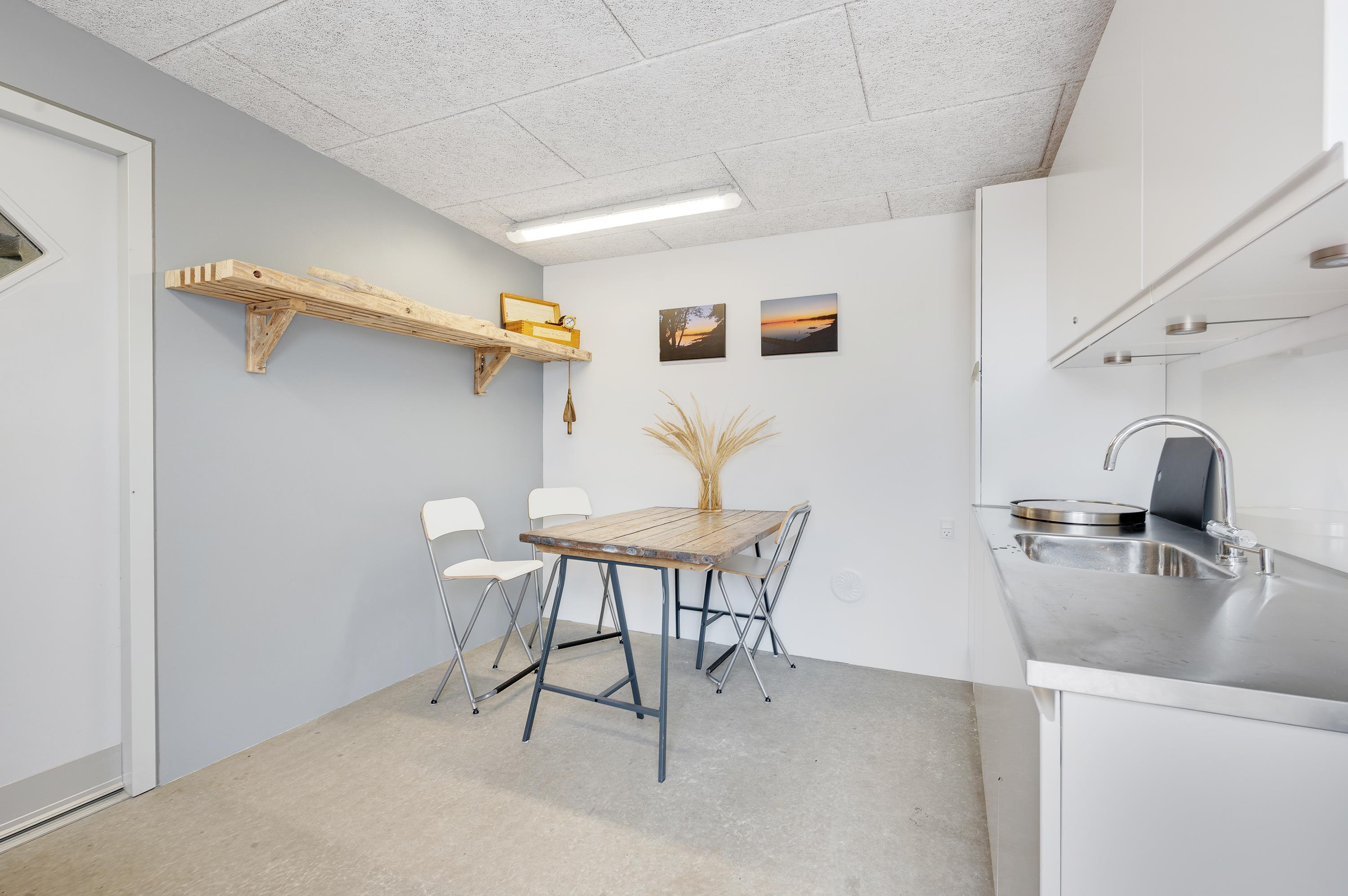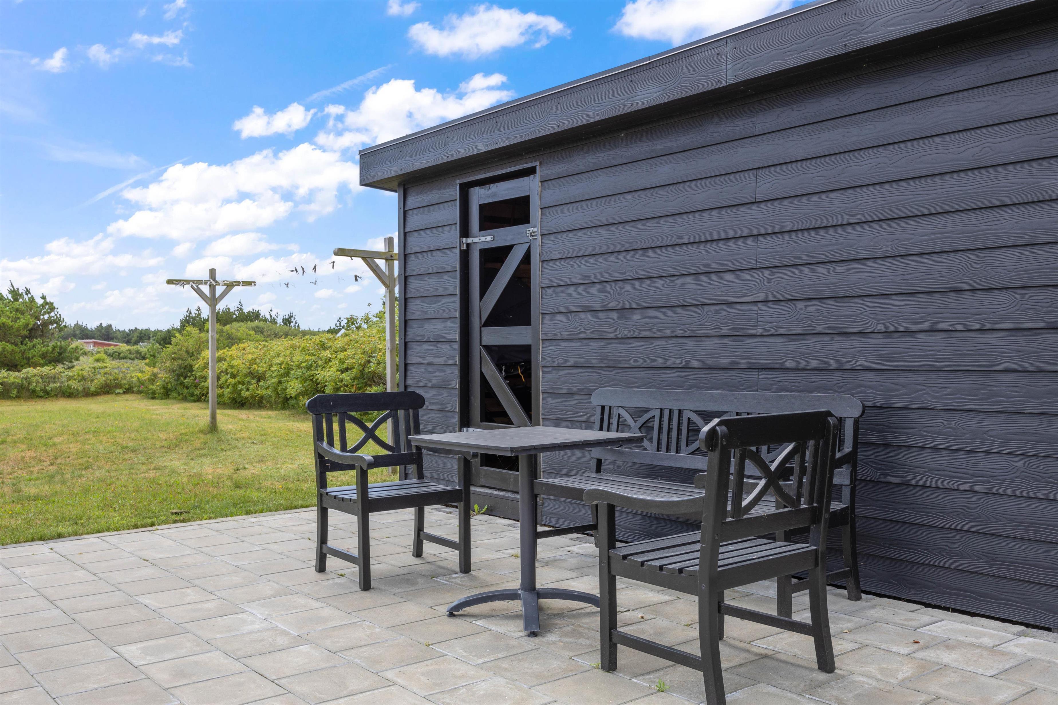 Fra terrassen er der adgang til et redskabsrum, hvor I kan gemme cyklerne væk, hvis I har dem med på ferie. Redskabsrummet er desuden indrettet med et lille grovkøkken, og det er også her, I finder feriehusets fryser.