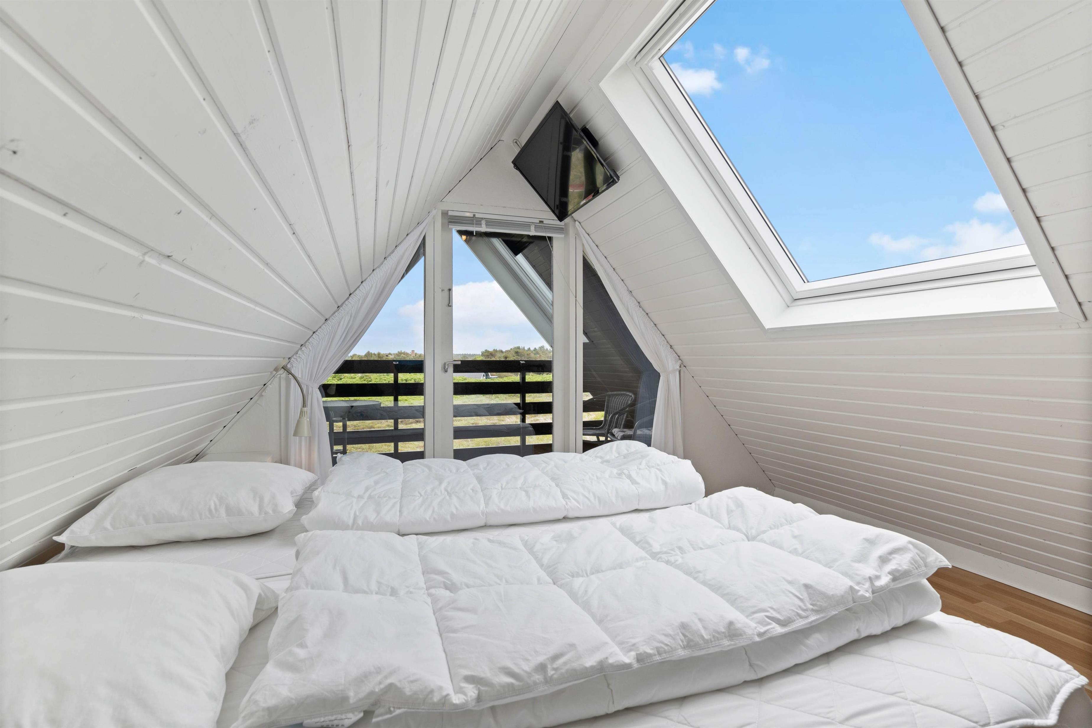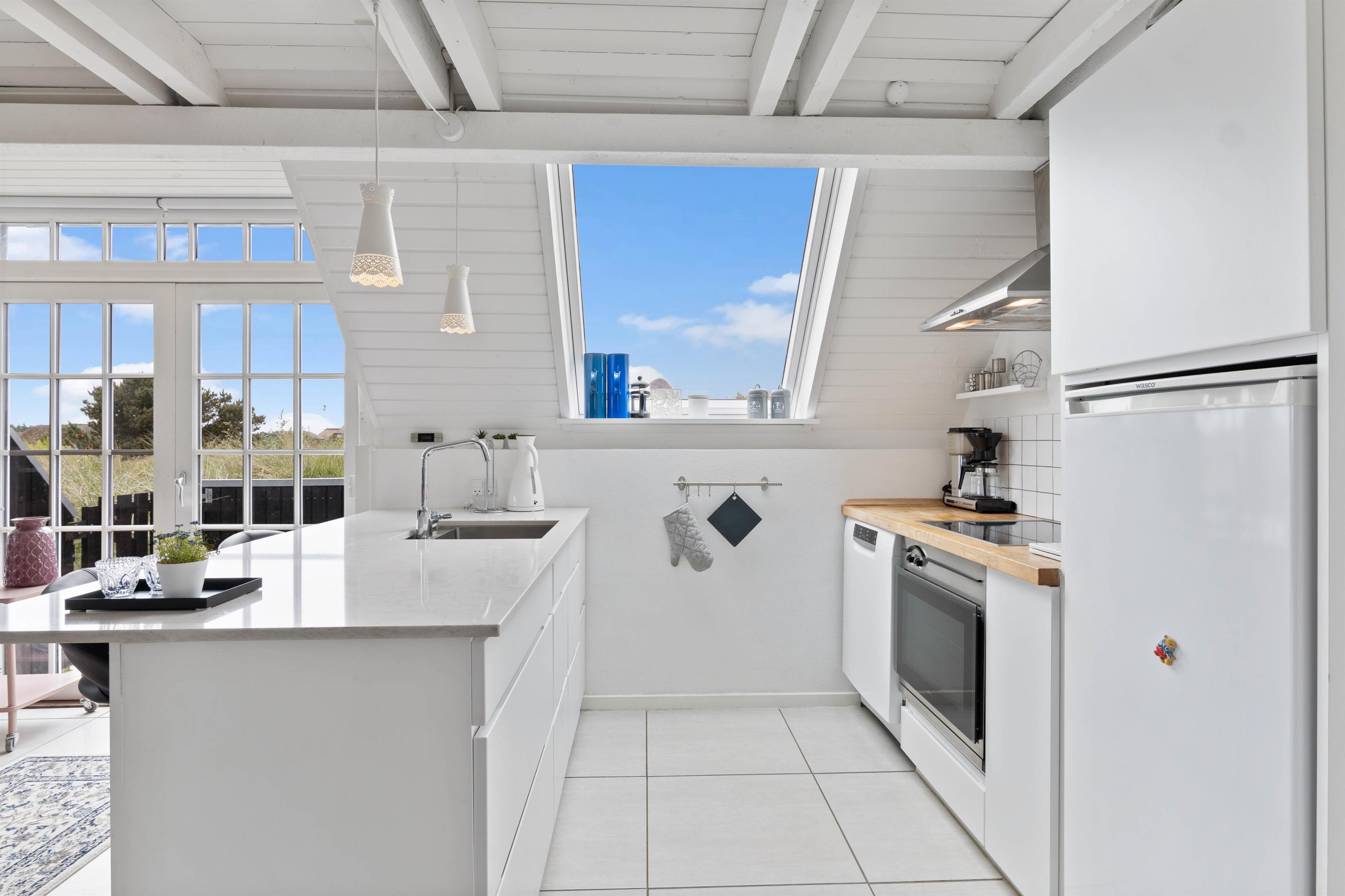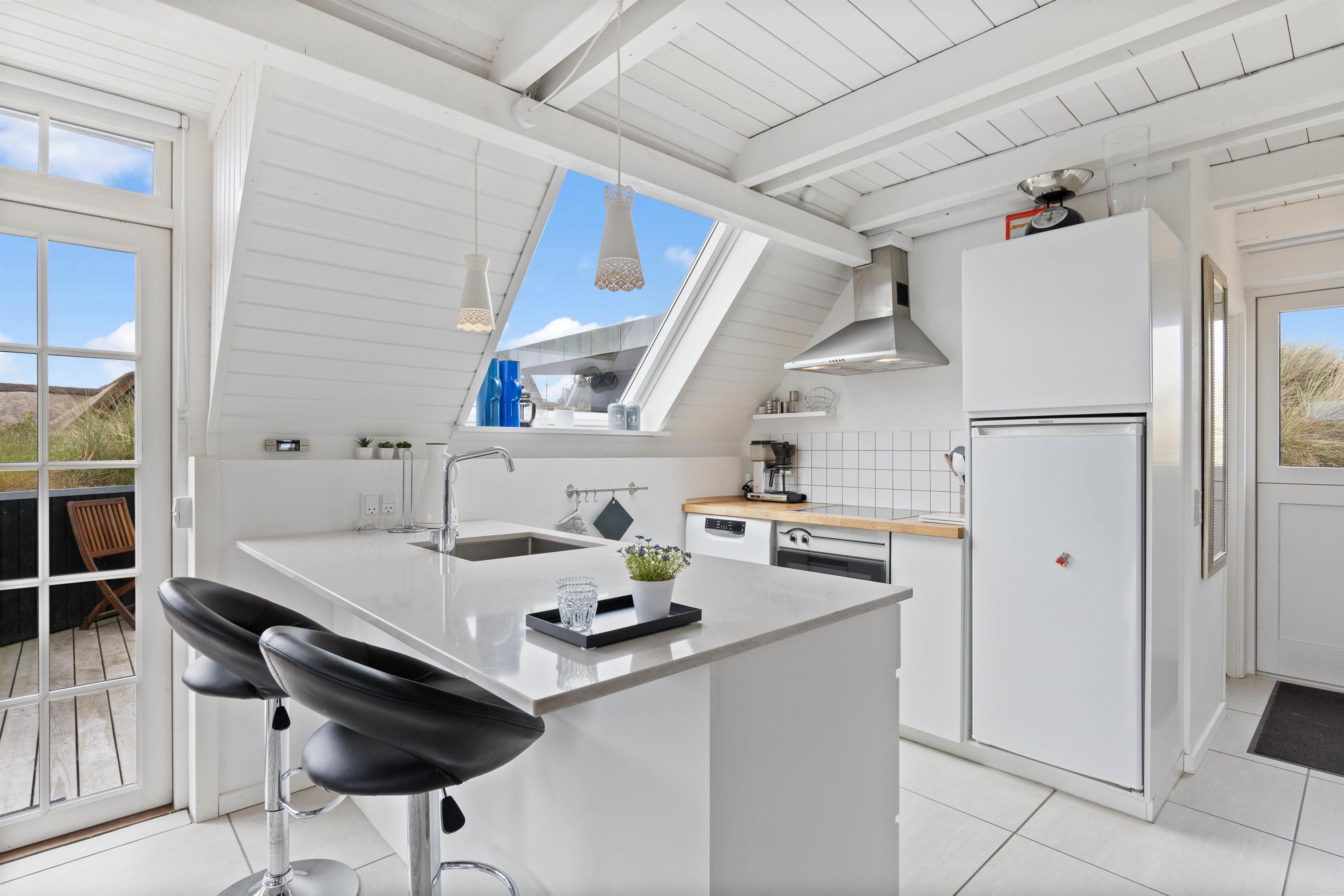 Det kombinerede køkkenal- og stuerum fungerer som husets hjerte, og brændeovnen i midten af rummet sørger for dejlig varme og en hyggelig ferieatmosfære med dens knitrende flammer hele året rundt. Hvis I dog ønsker en mere bæredygtig og økonomisk løsning til at varme huset op, så kan i også bruge husets varmepumpe, der kan sørge for et behagelig temperatur året rundt. De mange vinduer og de hvidmalede vægge- og lofter, sørger for et virkelig lyst og rart opholdsrum, hvor I virkelig kan have nogle hyggelige stunder.