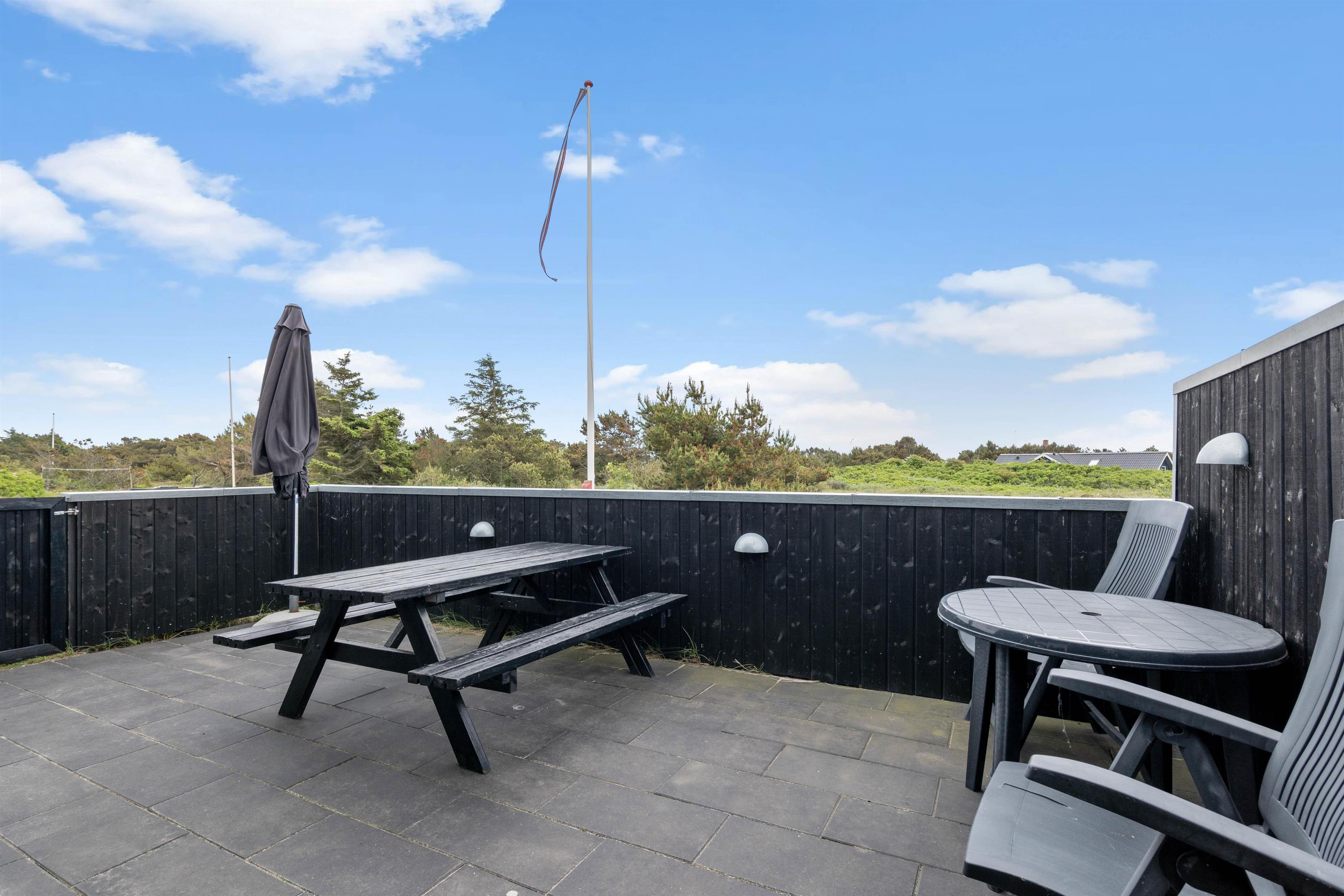 På de gode solskinsdage er det oplagt at rykke feriehyggen ud på terrassen, som er delvist overdækket og afskærmet. Her kan I rigtig slappe af i sommervarmen, mens I betragter den grønne natur og det stemningsfyldte ferieland.