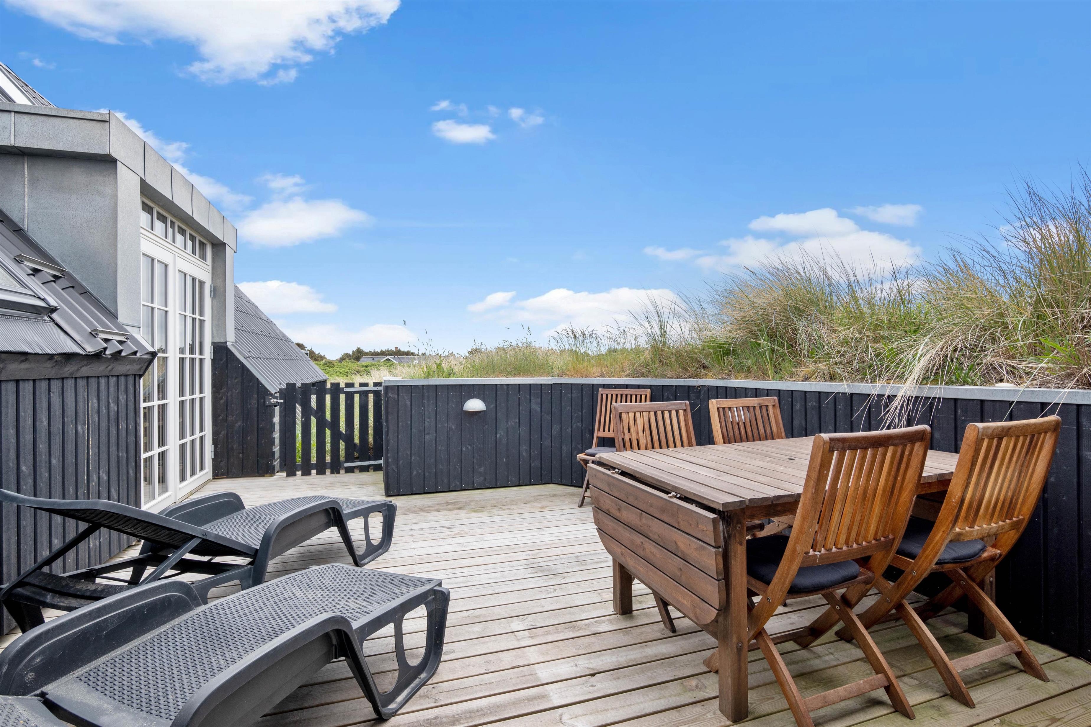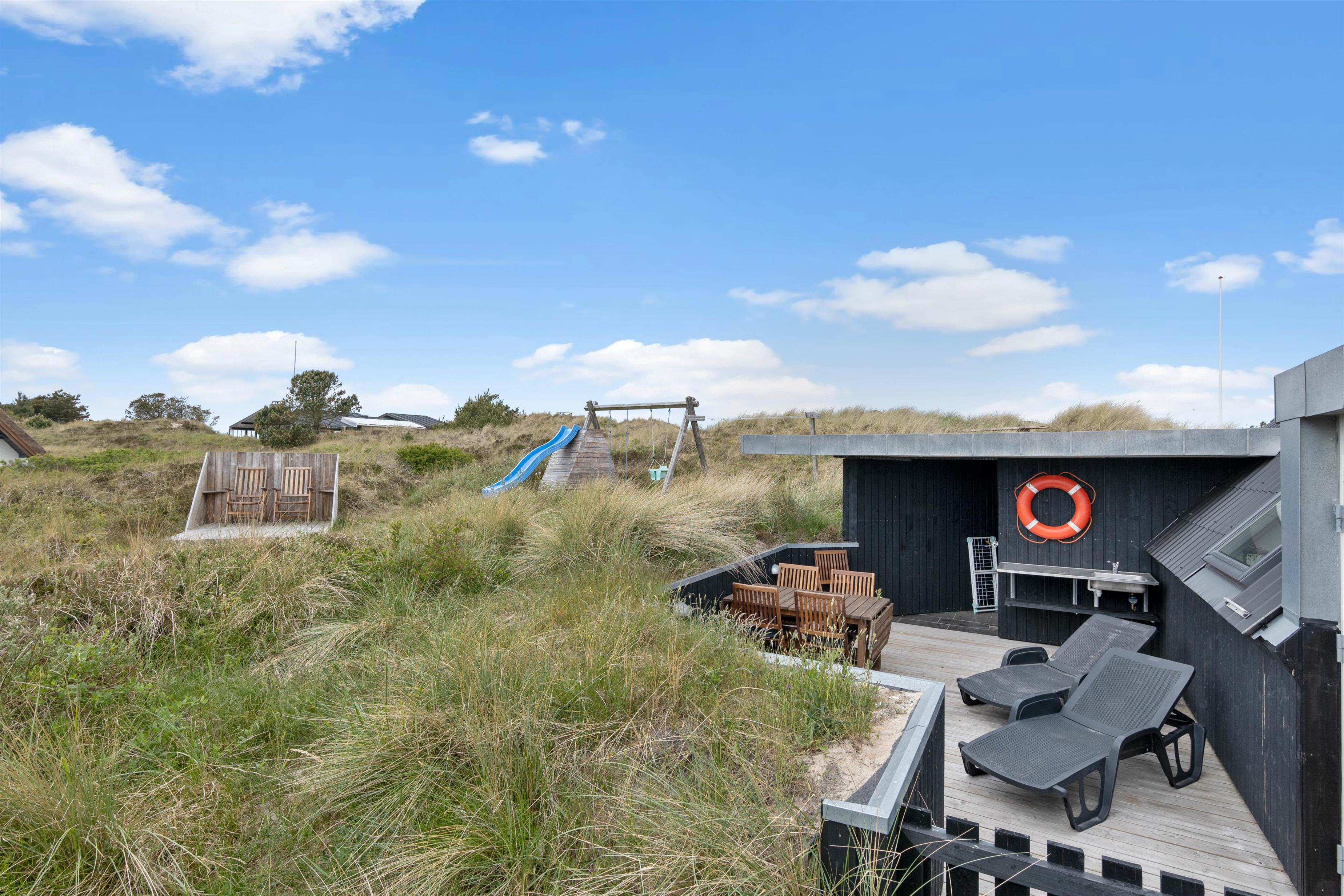 Det hyggelige sommerhus sætter rammerne for en enkel og afslappende ferie i smukke omgivelser, og fra balkonen på første etage kan I nyde udsigten ud over det unikke, klitbeklædte sommerhuslandskab.