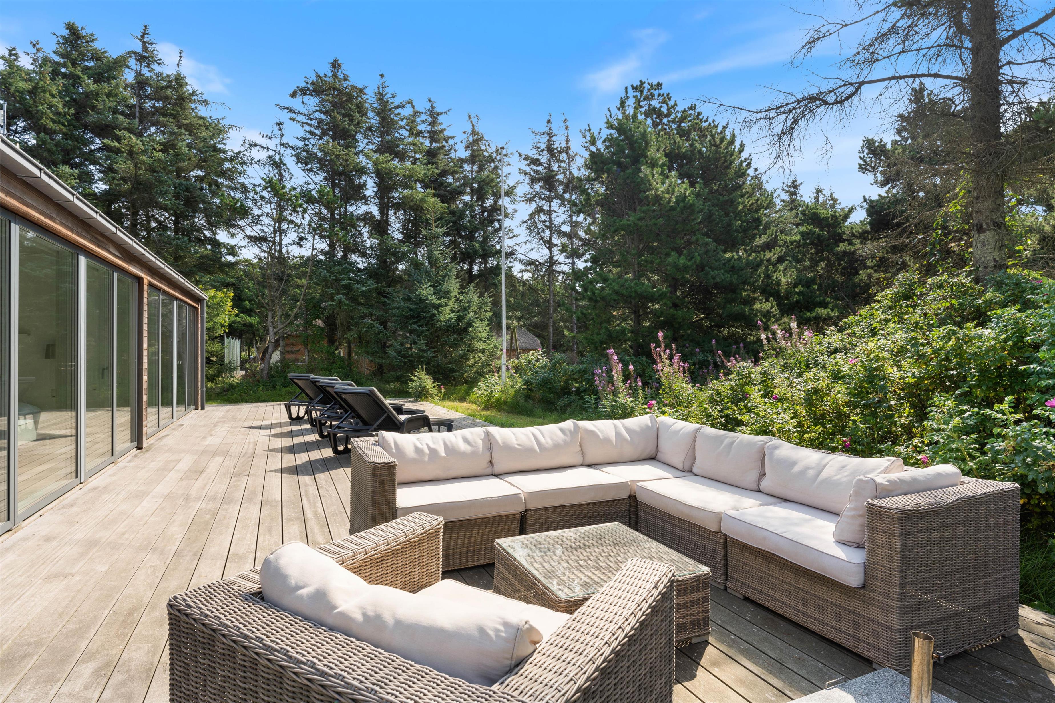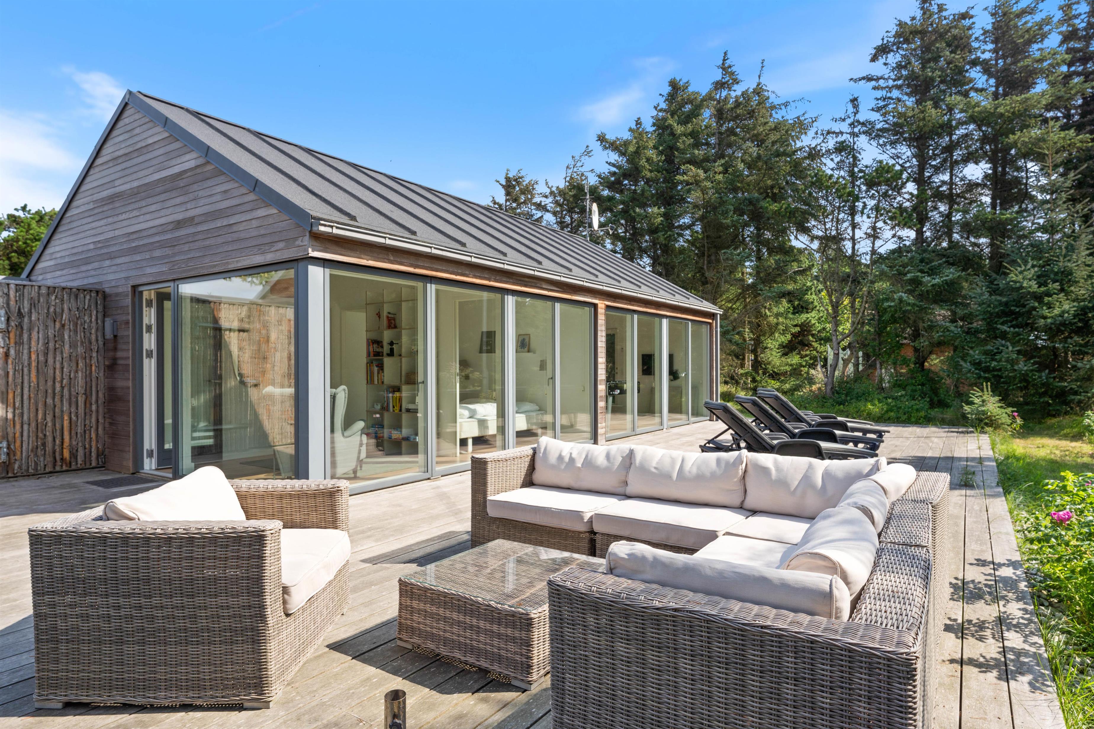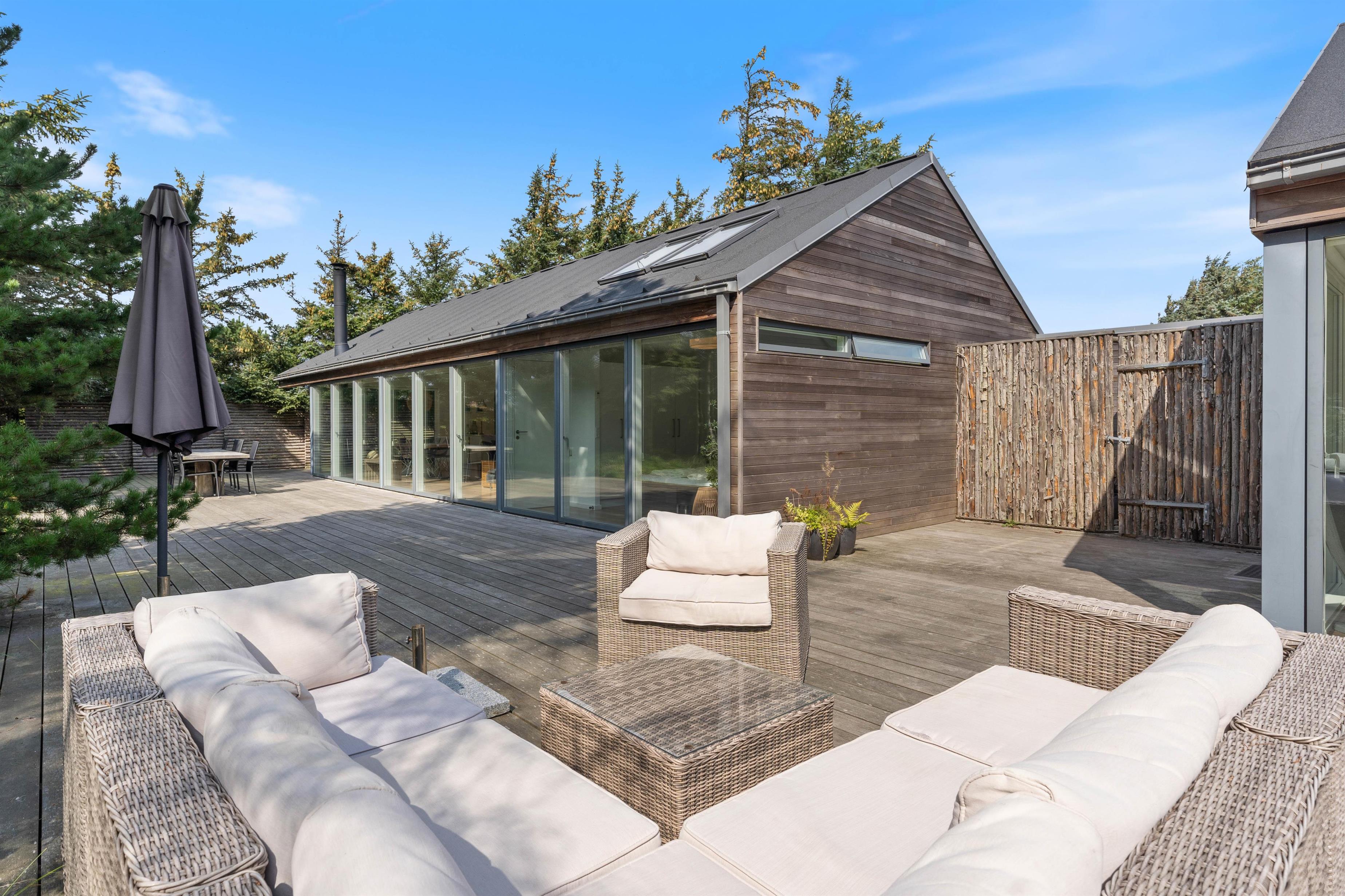 Der er naturligvis en stor og skøn terrasse, som er placeret langs hele husets sydlige del. Den er delvis afskærmet mod vest og delvist overdækket, helt perfekt til de lange og hyggelige grillaftener med frisk luft fra Vesterhavet i baggrunden. Ønsker man en travetur langs stranden med børn og hund, er der kun få minutters gang dertil. Derudover findes der en udendørs bruser til at skylle sand af.