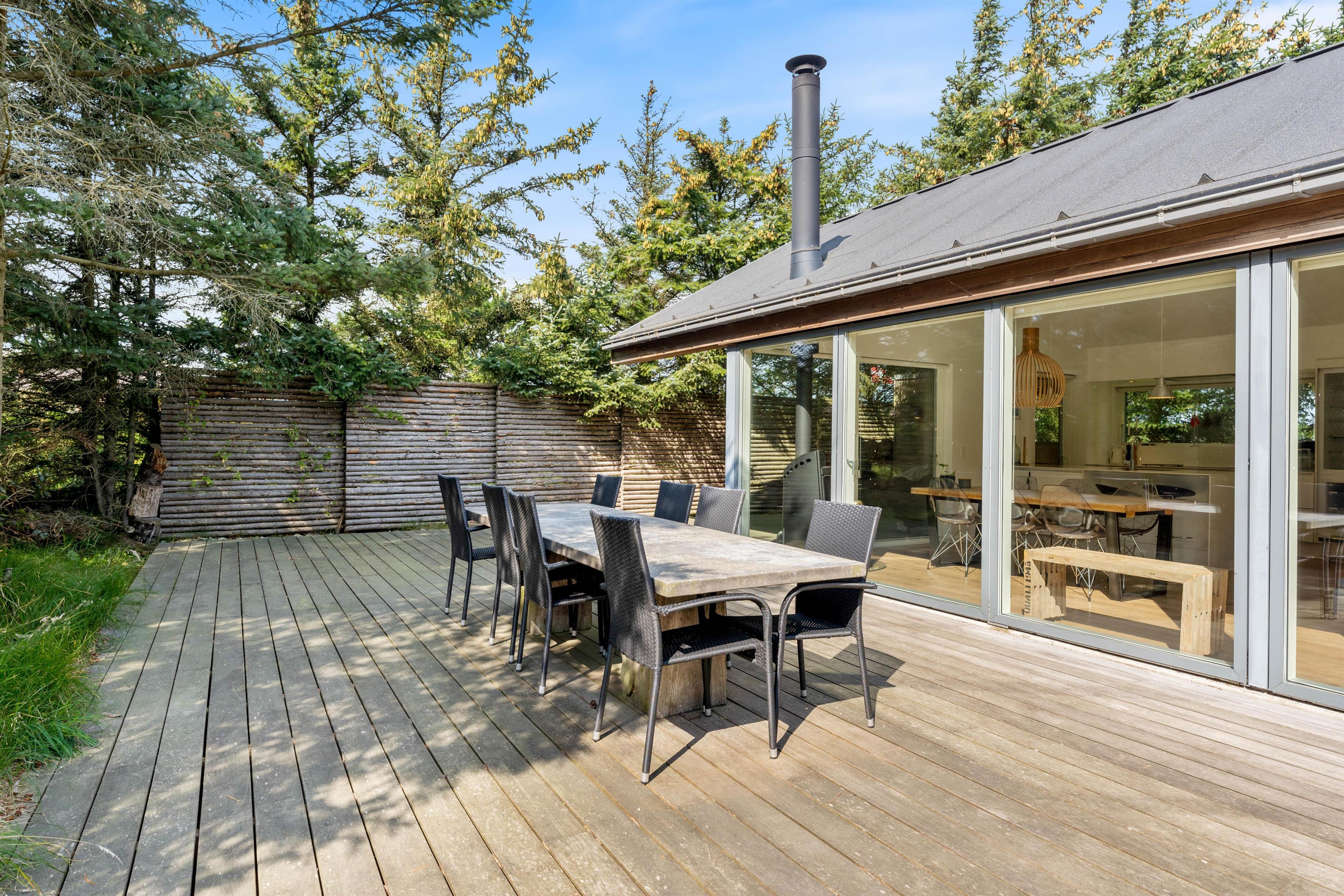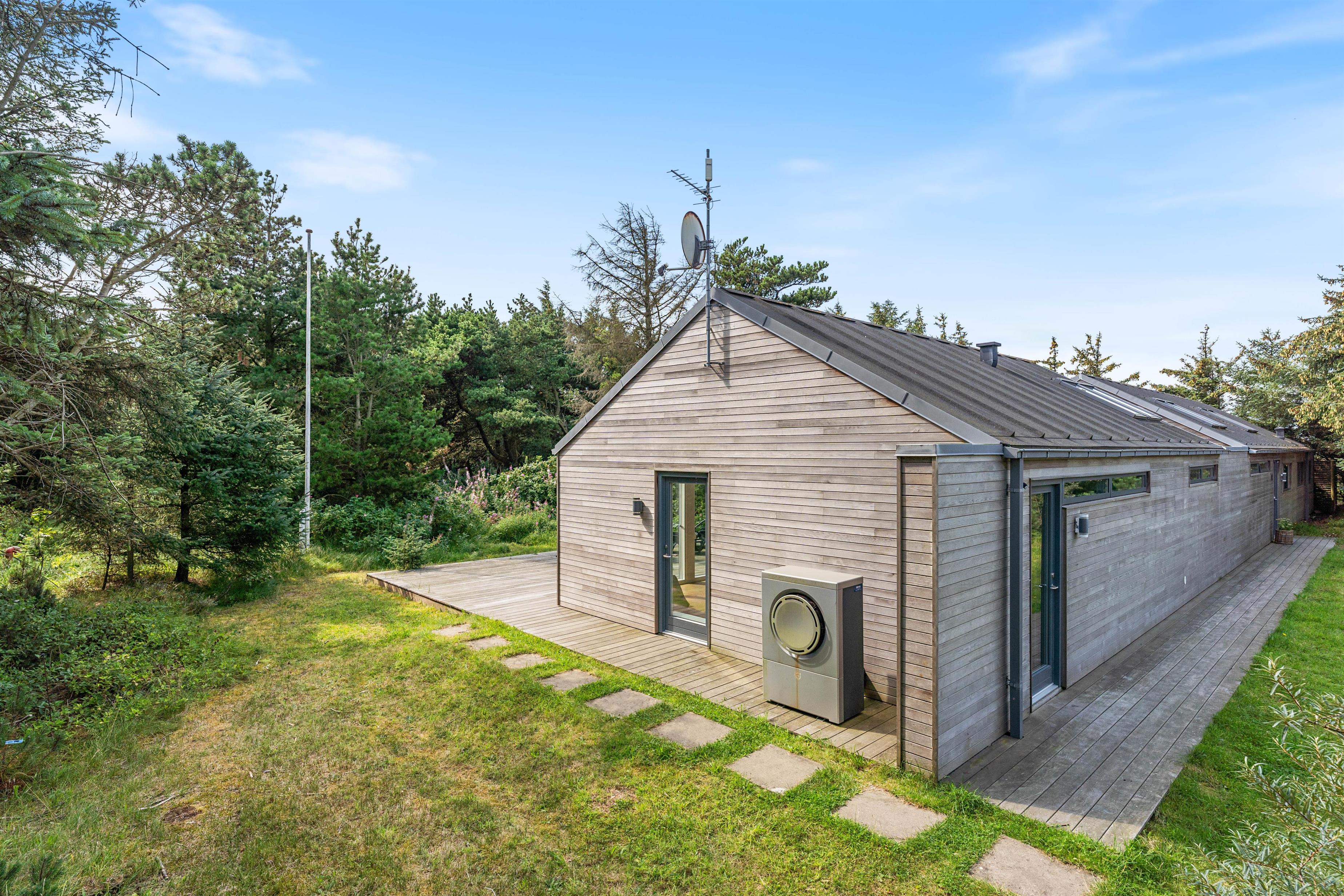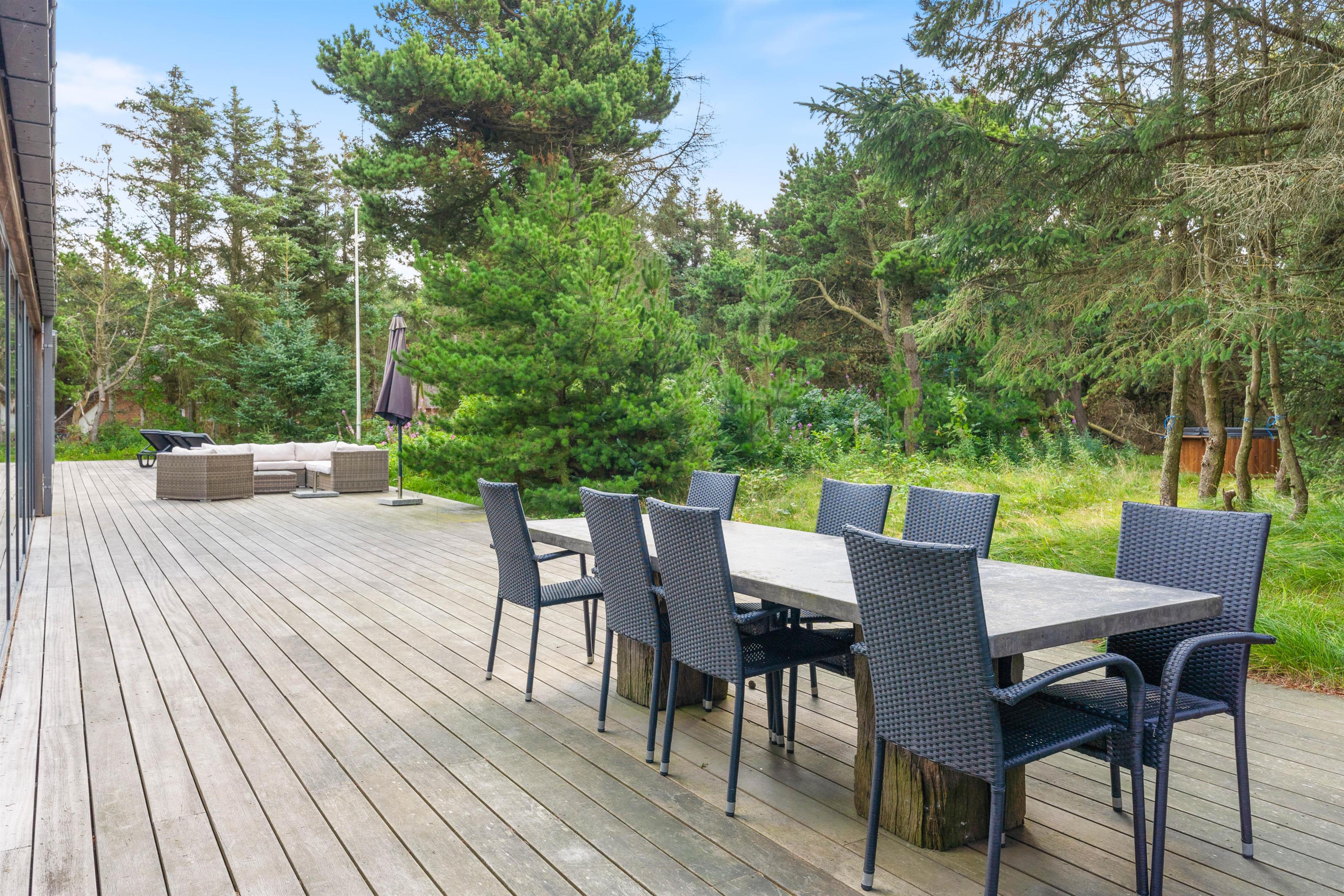 Der er naturligvis en stor og skøn terrasse, som er placeret langs hele husets sydlige del. Den er delvis afskærmet mod vest og delvist overdækket, helt perfekt til de lange og hyggelige grillaftener med frisk luft fra Vesterhavet i baggrunden. Ønsker man en travetur langs stranden med børn og hund, er der kun få minutters gang dertil. Derudover findes der en udendørs bruser til at skylle sand af.