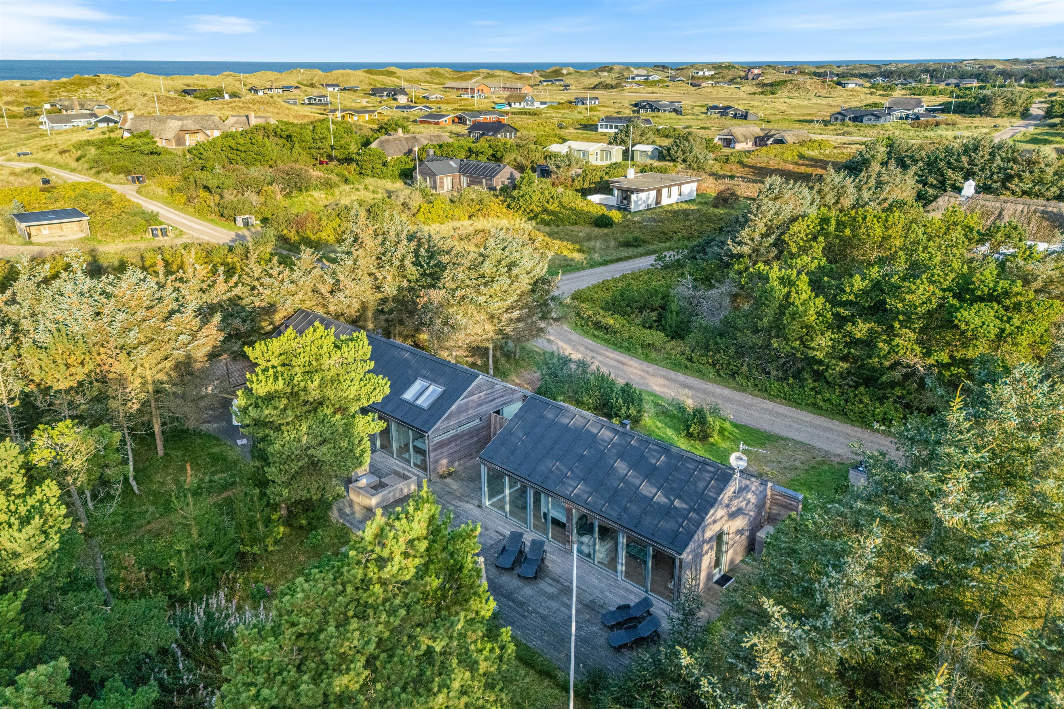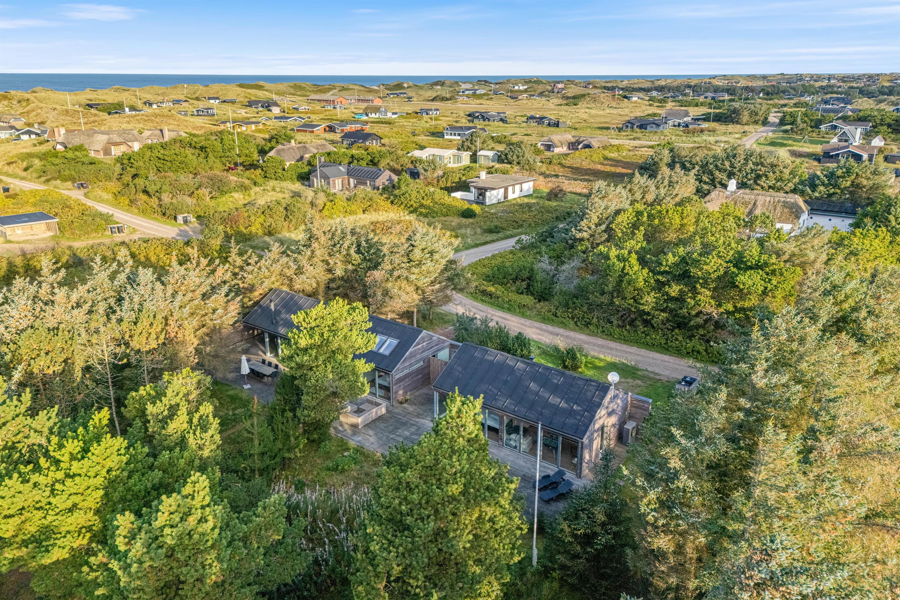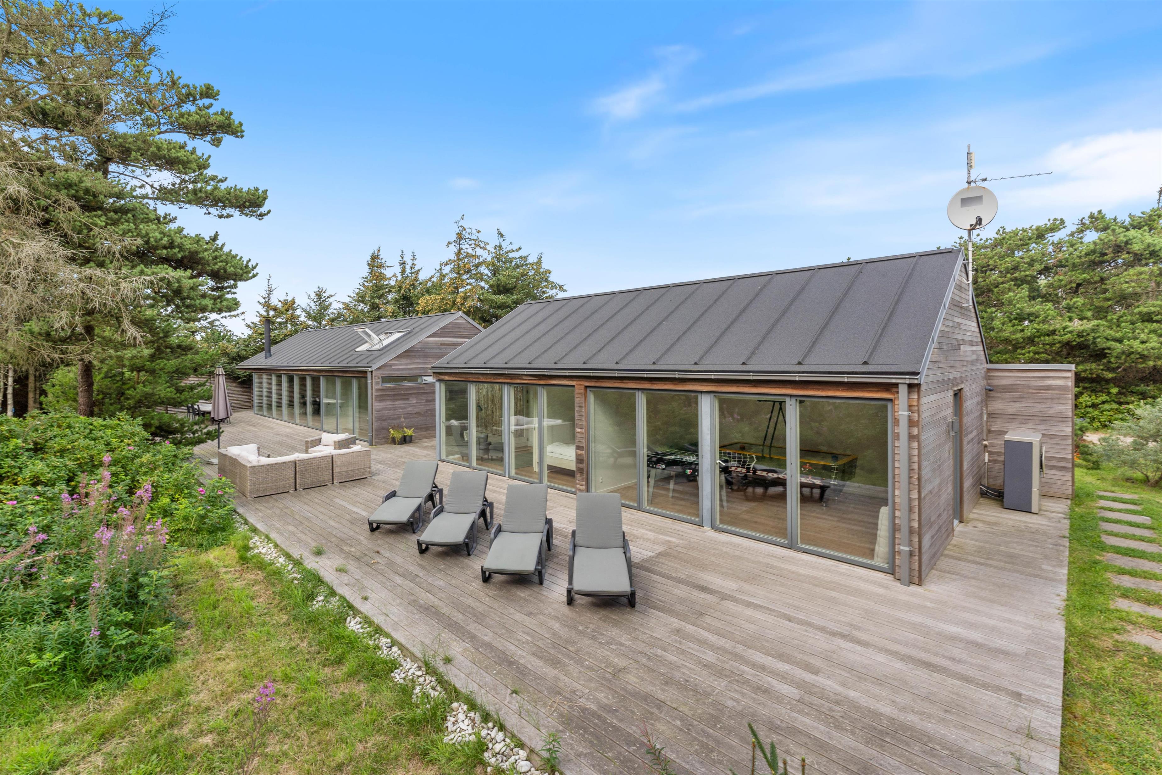 Lækkert kvalitetshus ikke langt fra Søndervig centrum. Det er bygget i 2 afdelinger, hvilket er ideelt, hvis man har store børn med eller man er 2 par. Det ligger på en fredelig naturgrund med masser af læ. Indretningen er smagfuld og indbydende, og huset er desuden udstyret med et aktivitetsrum.