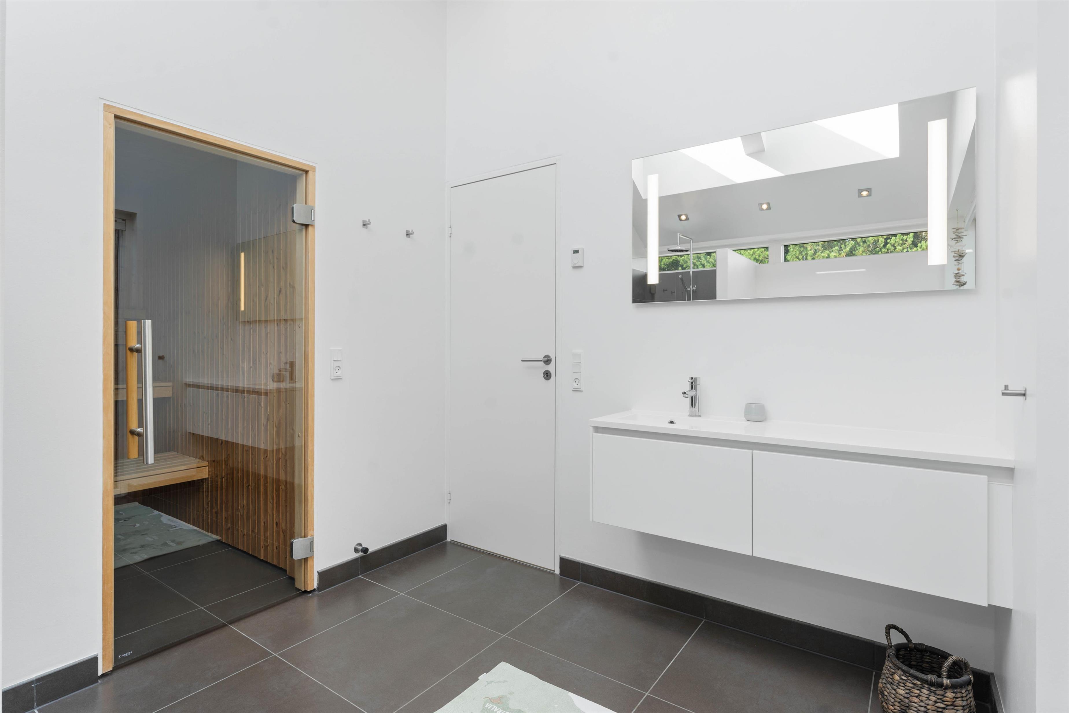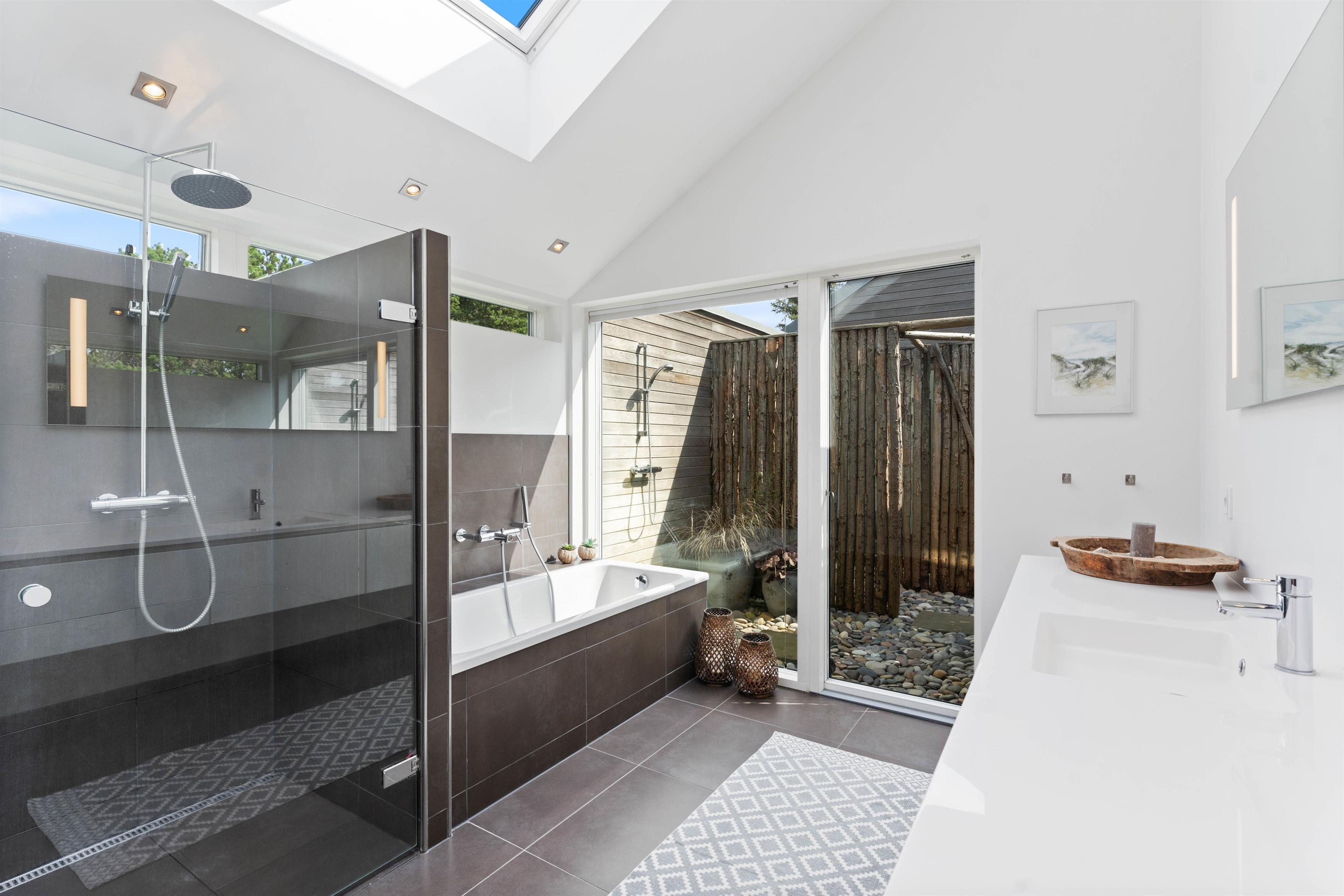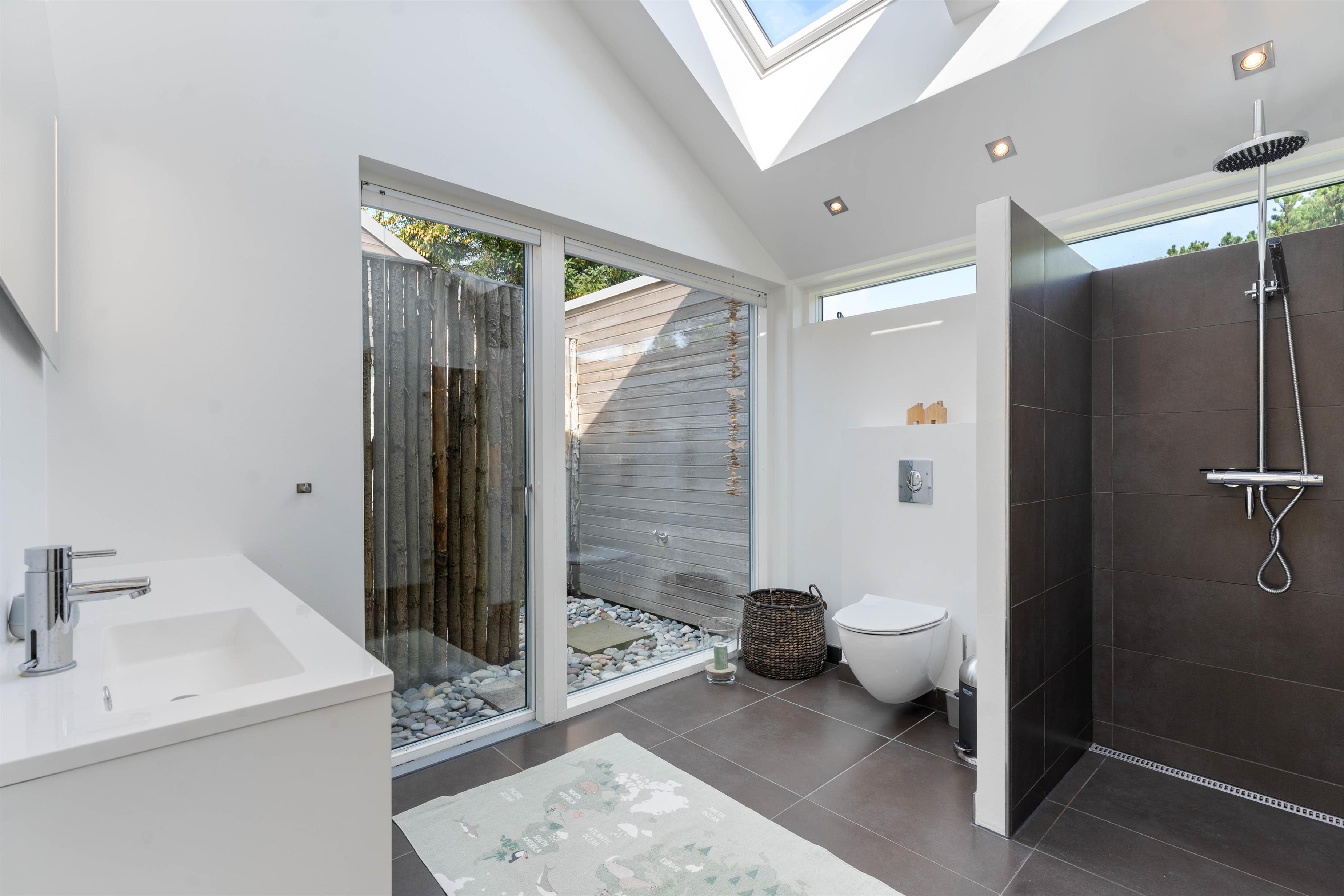 Køkkenet er velindrettet, og det er de 2 badeværelser også. På det ene badeværelse er der også en sauna. Det andet badeværelse kan også byde på lidt ekstra afslapning, i form at et lækkert badekar. Alle rum har gulvvarme, og alle overflader er nemme at holde pæne og rene. Mellem de to afdelinger er der en udendørsbruser og dette område forbinder også de to afsnit af huset. Udebruseren vil ikke kunne benyttes fra november til april.