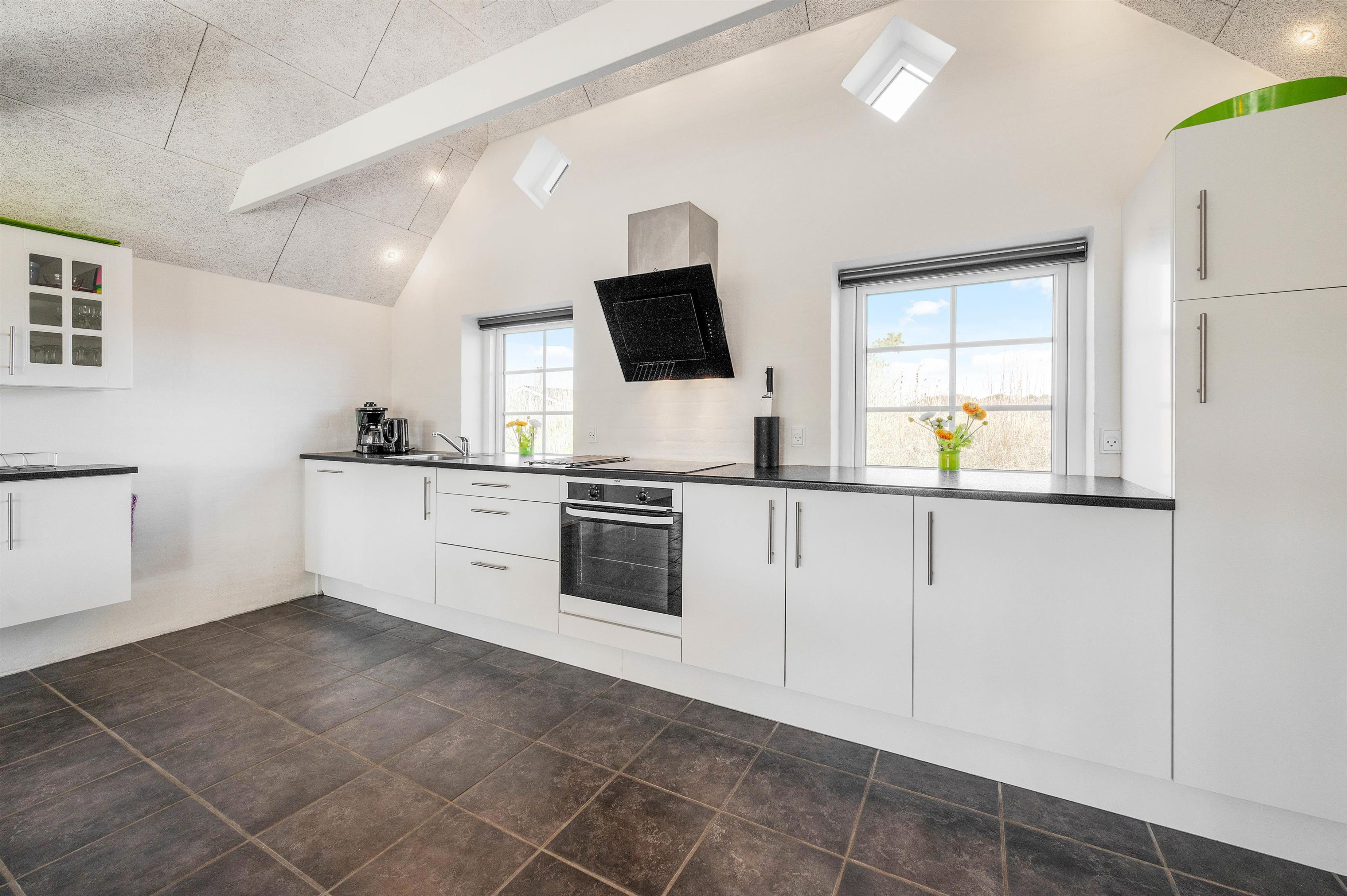 I den ene ende af opholdsrummet ligger det flotte køkken, der kalder på at blive indtaget. Her kan I tilberede jeres måltider, mens I vender og drejer dagens oplevelser. Køkkenet fremstår velholdt med flotte fronter og er godt udstyret med mikroovn, opvaskemaskine og køleskab. Ydermere finder I en stor 100 liter fryser i skuret.