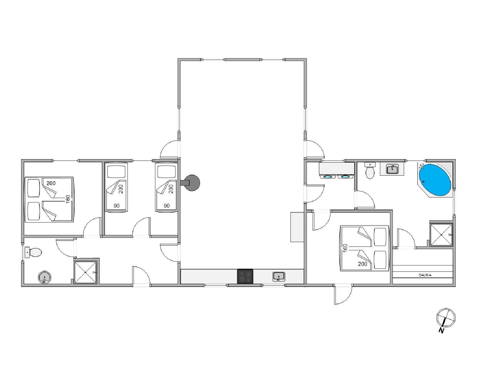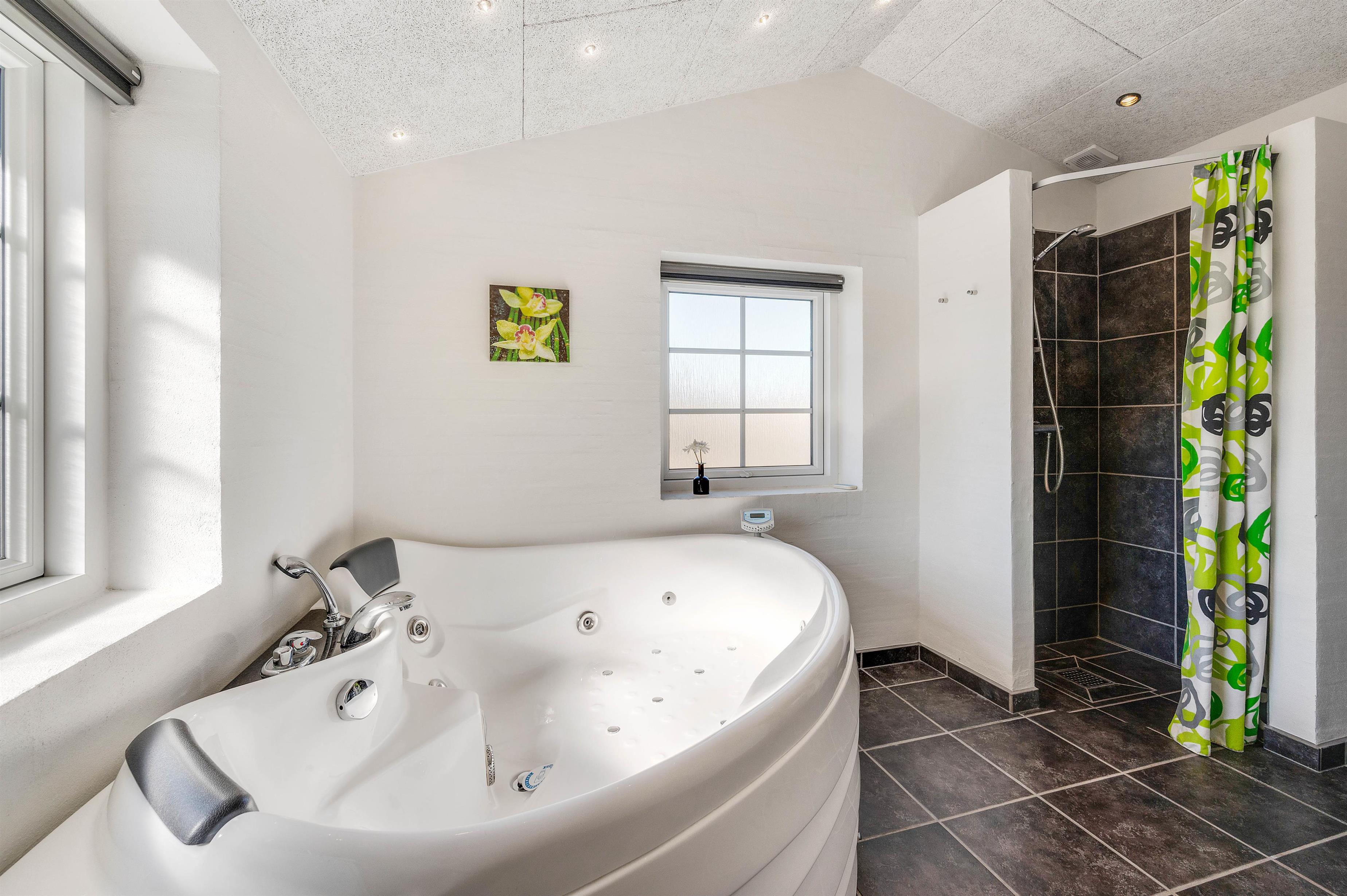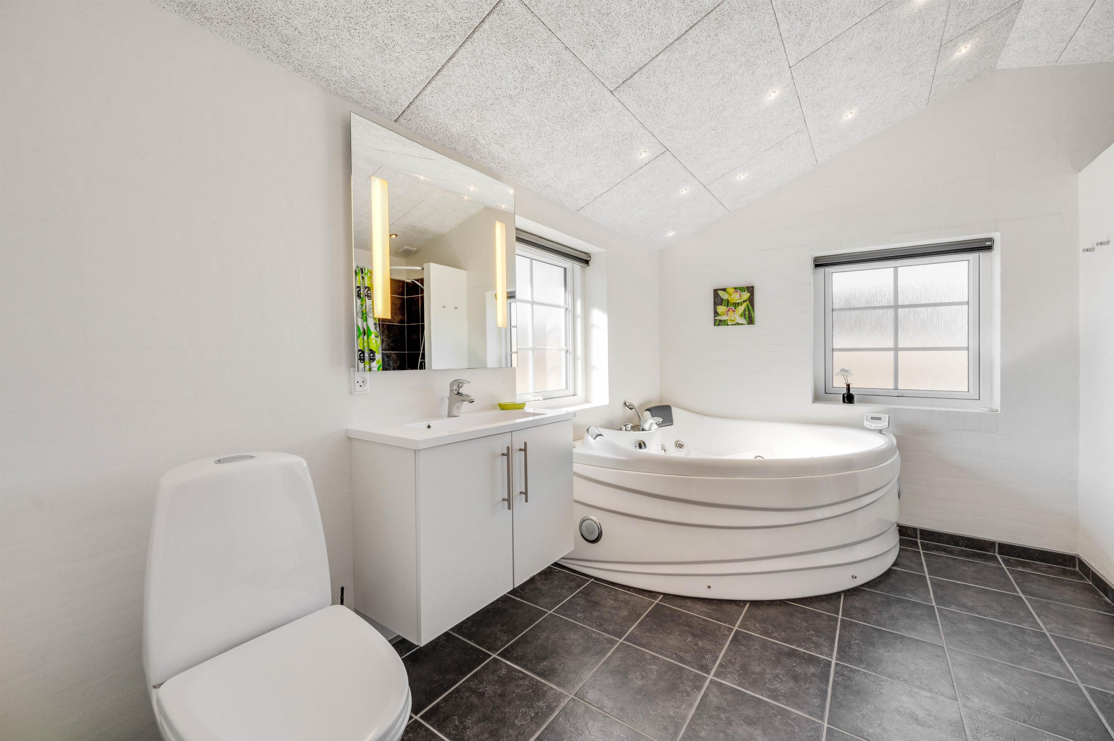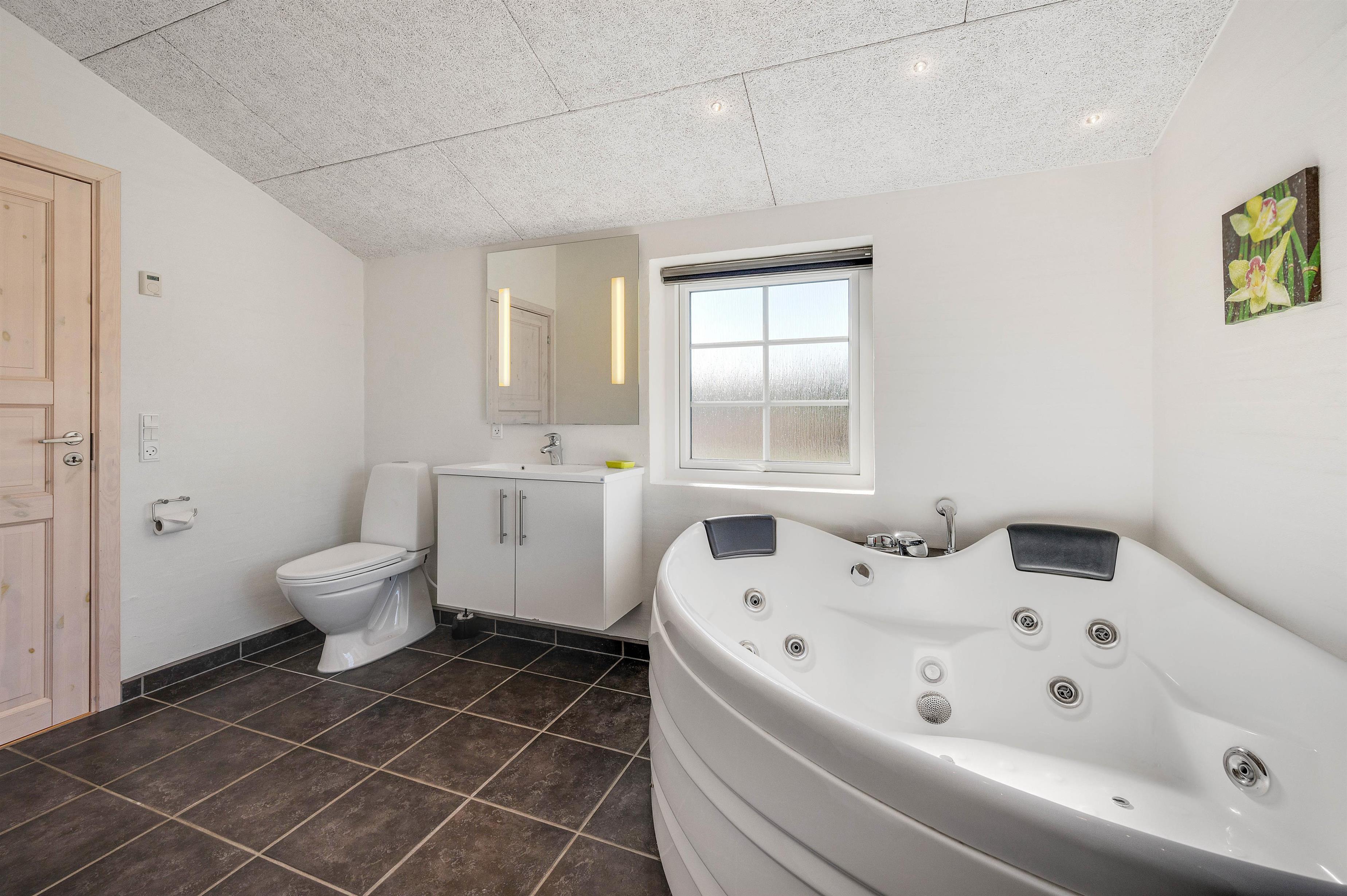 I husets største badeværelse er der nemlig et dejligt spabad, hvor I kan læne jer tilbage og nyde de varme bobler. Men ikke nok med det. Fra badeværelset er der også adgang til en dejlig sauna. En tur i saunaen er ekstra velgørende efter en lang dag ved havet, så I kan blive varmet igennem fra inderst til yderst. Derudover behøver I ikke bekymre jer om kolde fødder, da begge badeværelser er udstyret med gulvvarme.