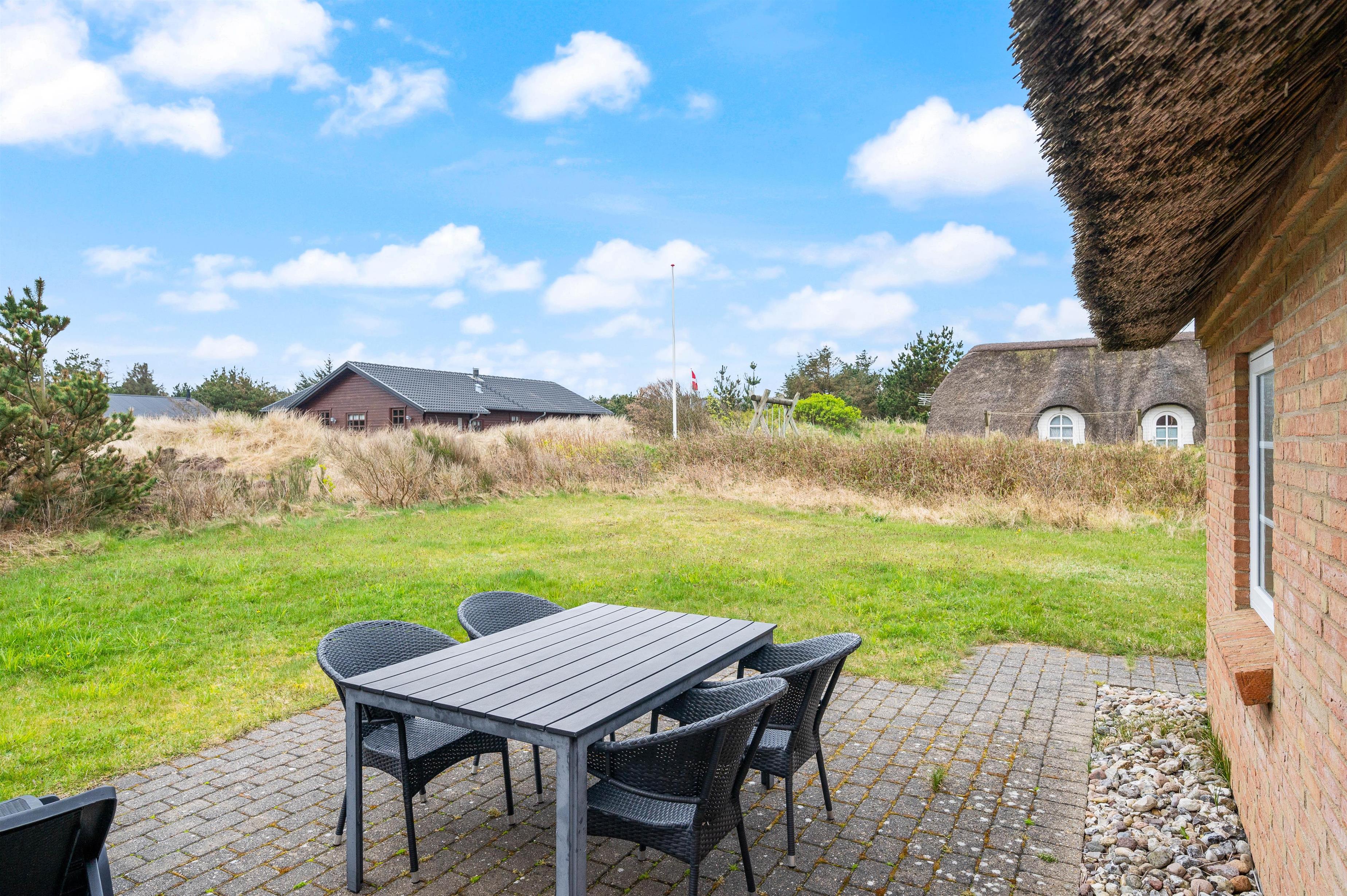 Huset er beliggende på en stille, blind sommerhusvej i et børnevenligt område. Udenfor huset er der en stor, grøn plæne, der er ideel til boldspil eller spontane picnicstunder.