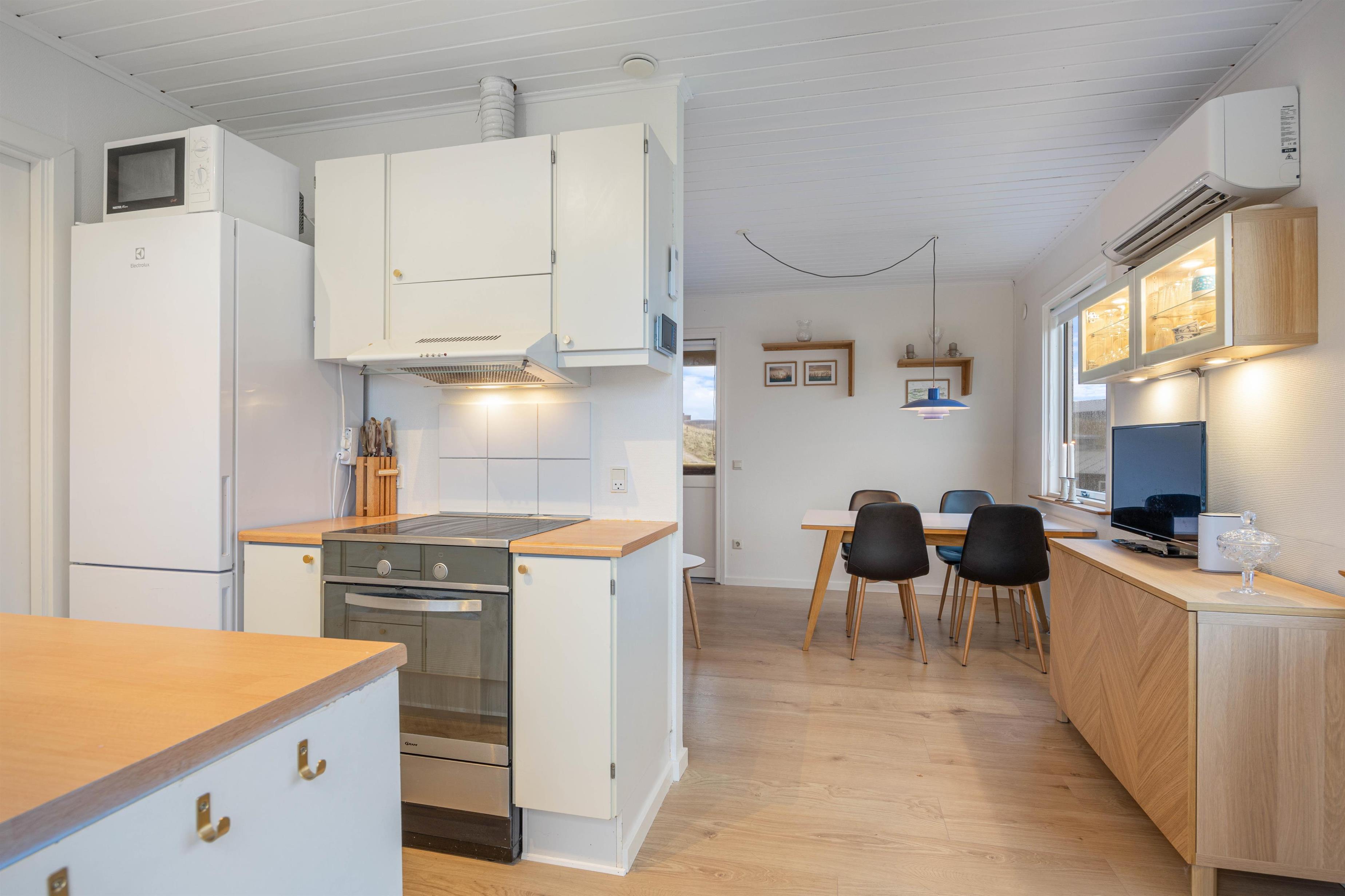 Sommerhuset i Søndervig er udstyret med alle moderne bekvemmeligheder, der kan gøre jeres ophold komfortabelt og bekvemt. En opvaskemaskine er også jeres rådighed, hvilket gør det nemmere for jer at holde alt rent, samtidig med at I ikke skal bruge en masse unødvendig tid på at vaske op i hånden. Opholdsrummet råder også over en effektiv luft-til-luft varmepumpe, der sørger for den rette temperatur hele året rundt.