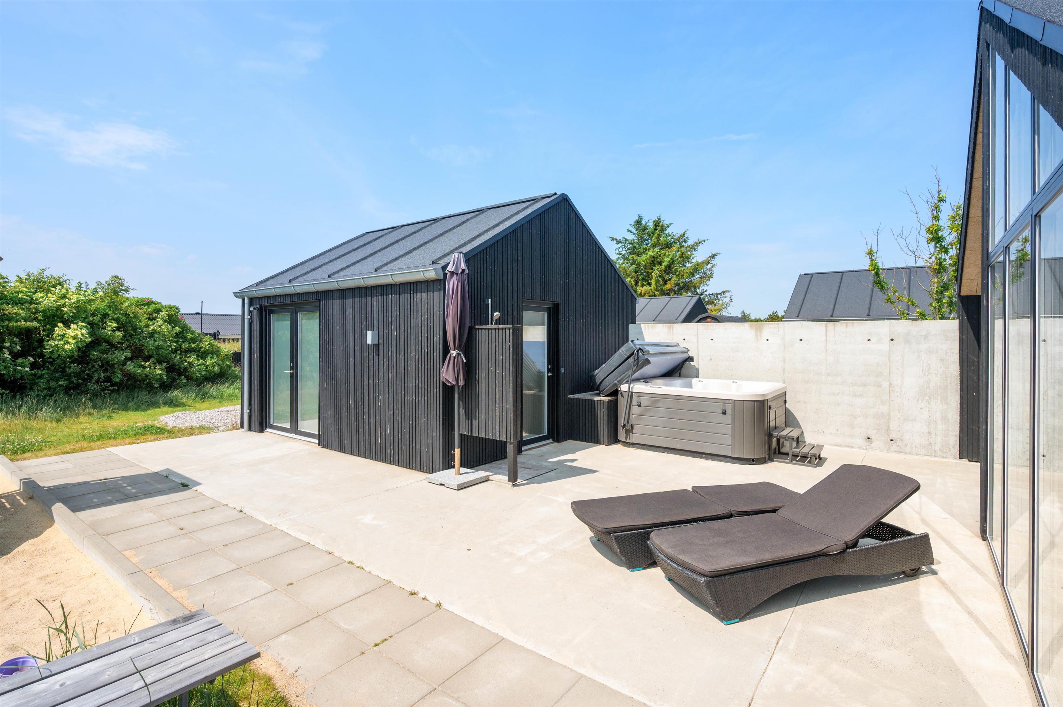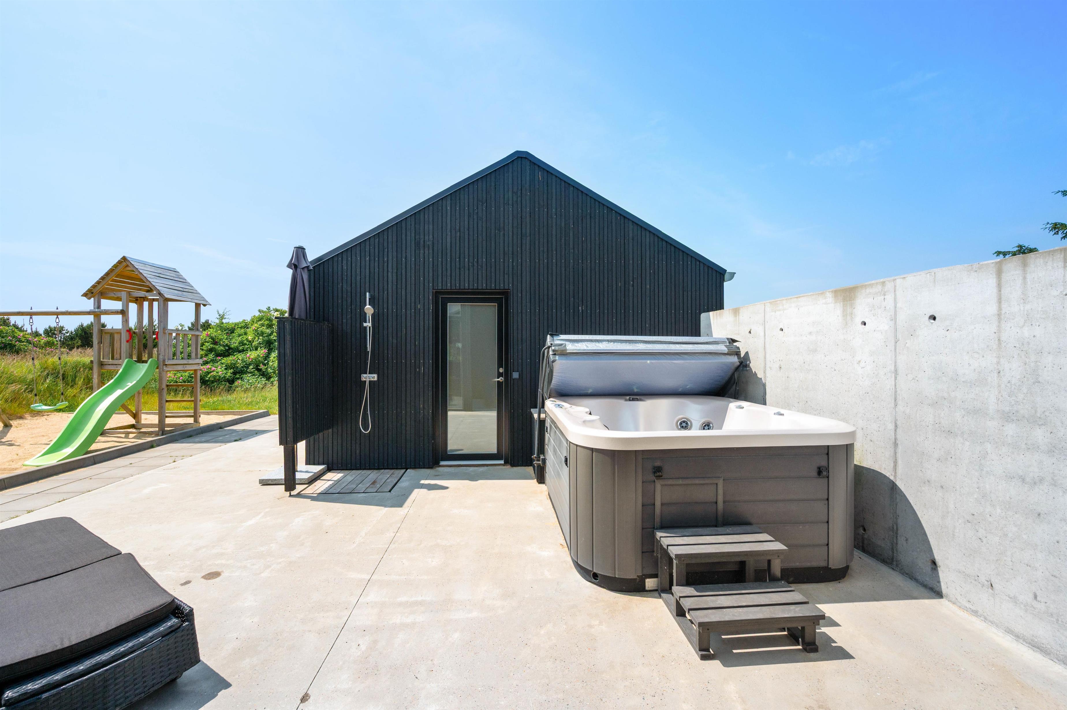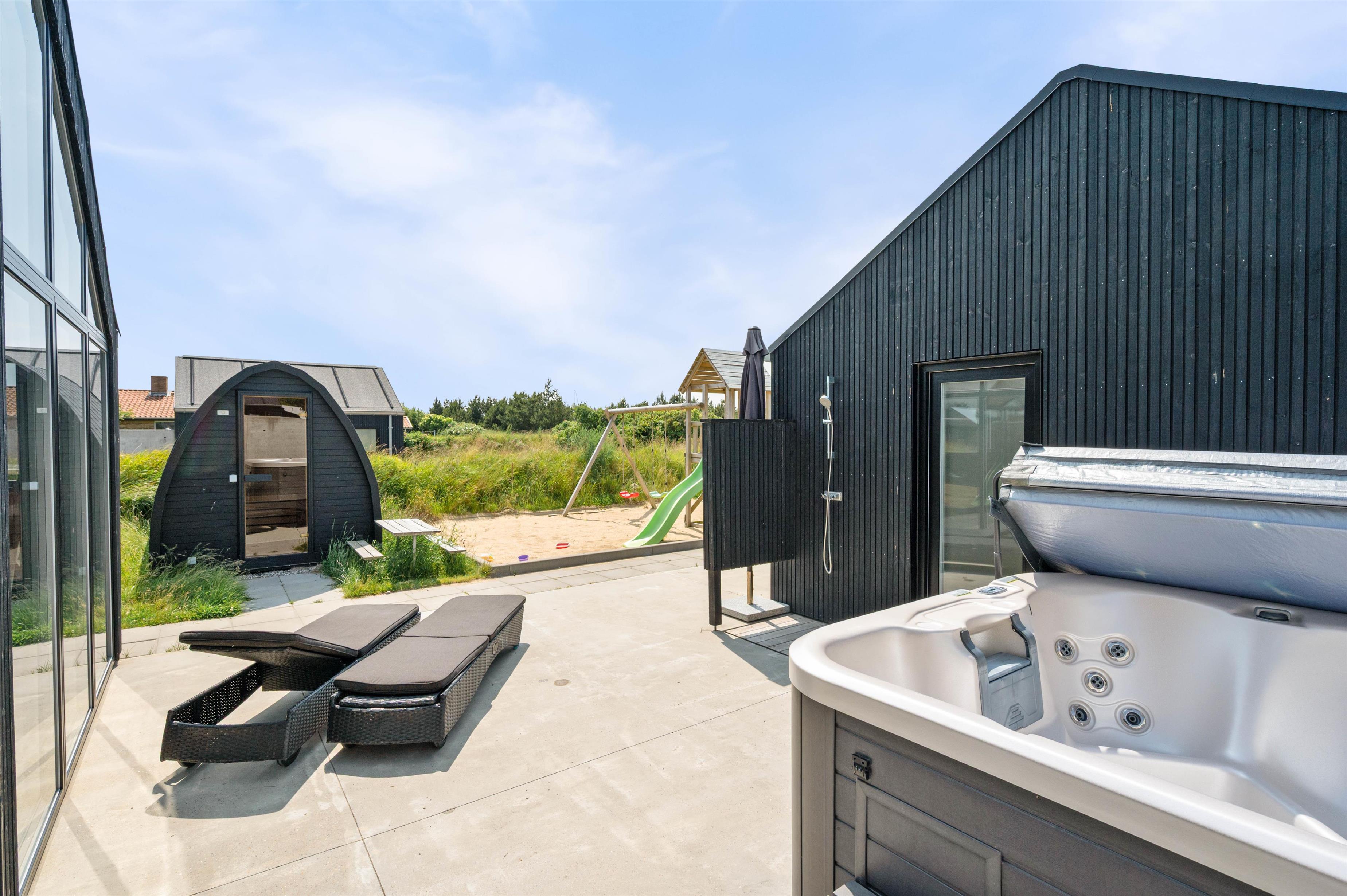 På terrassen venter jer også udespaen. I udespaen kan I nyde afslapning under åben himmel i det boblende vand. I bør desuden også prøve en tur i udespaen om aftenen, hvor I kan nyde masser af afslapning under stjernerne. Er I til ekstra afslapning, har I mulighed for at benytte jer af feriehusets udesauna.