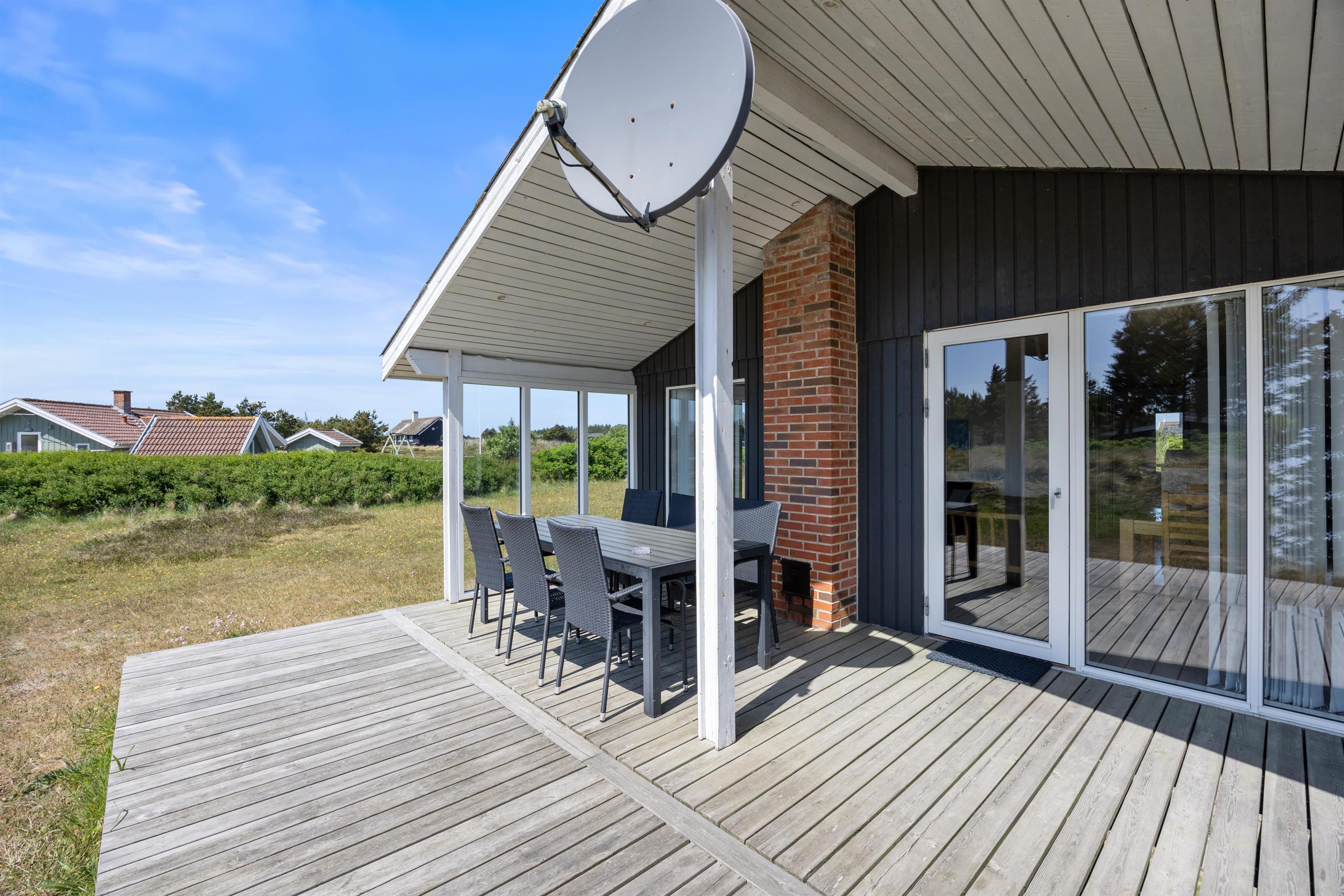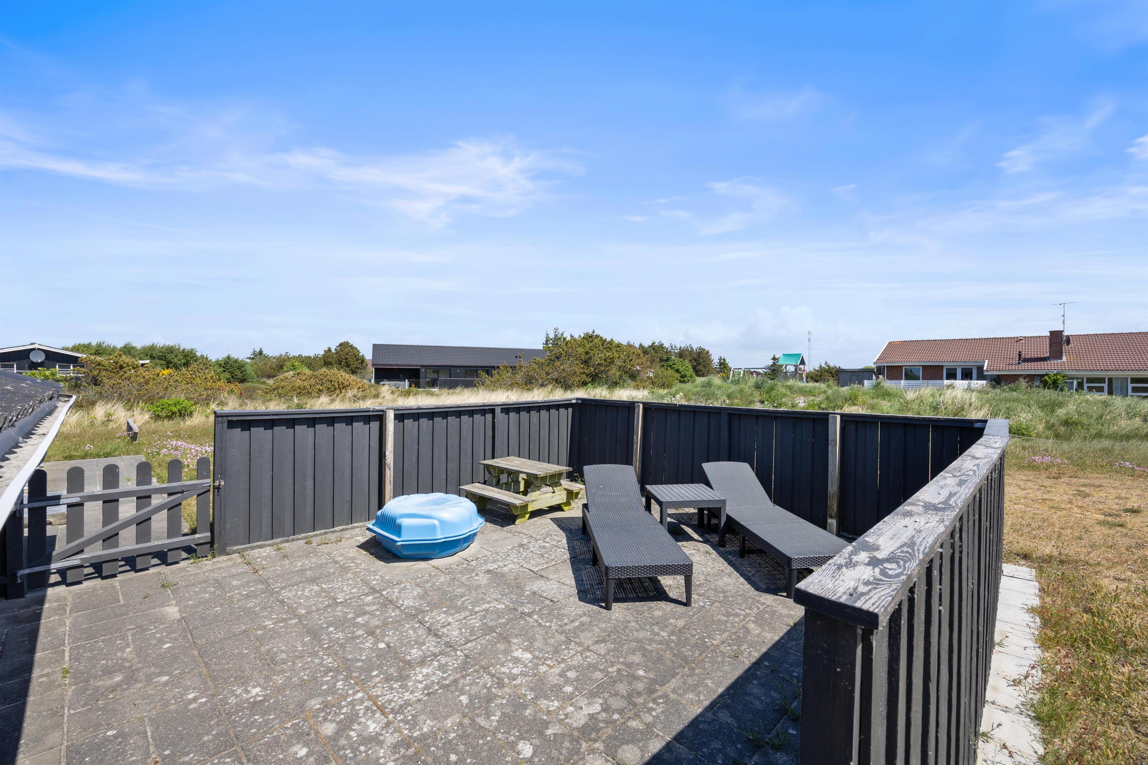 Et hit er husets terrasser. Her er mange hyggelige læ-kroge og et overdækket område, som kan forlænge udetiden på de lune sommeraftener. Grunden er åben med en stor græsplæne, og basketballkurven og fodboldmålene står klar til mange timers sjov for både store og små feriegæster.