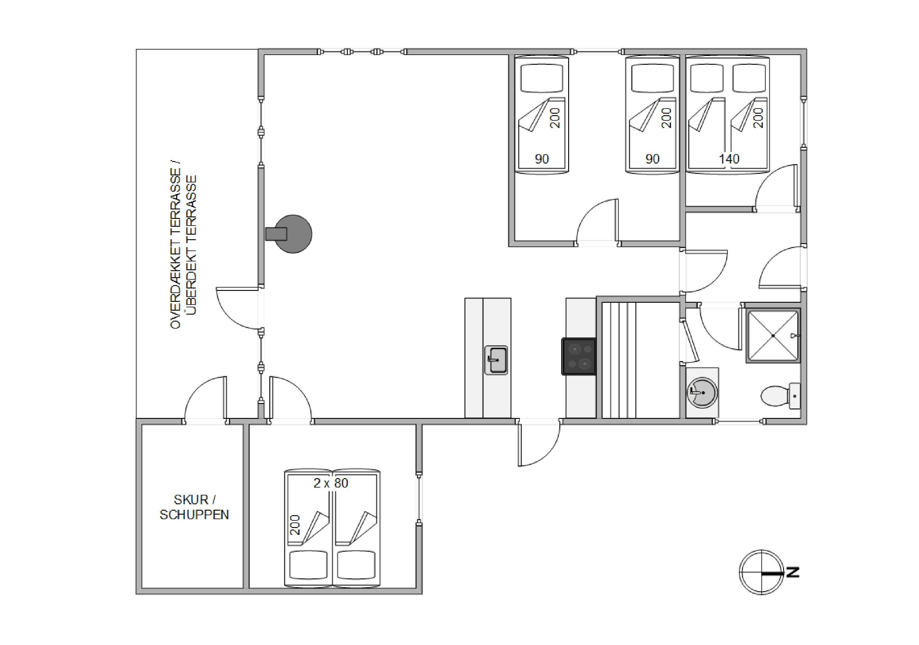 Så snart I ankommer til feriehuset, vil I mærke feriestemningen. Det fine sorte træhus ligger dejligt på en stor lys grund, hvor det dufter af hav, lyng og fyrretræer. Feriehuset er blevet renoveret i 2019, og det fremstår rigtig hyggelig og lyst med et flot nyt køkken, hvor der er alt hvad man kan forvente med bl.a. opvaskemaskine og induktionskogeplade. Køkkenet er i åben forbindelse til stuen, som har brændeovnen til at skabe den helt rigtige feriestemning. Her er også to dejlige sofaer, hvor I kan nyde fredagsslikket, imens I streamer jeres yndlingsfilm via Chromecasten.