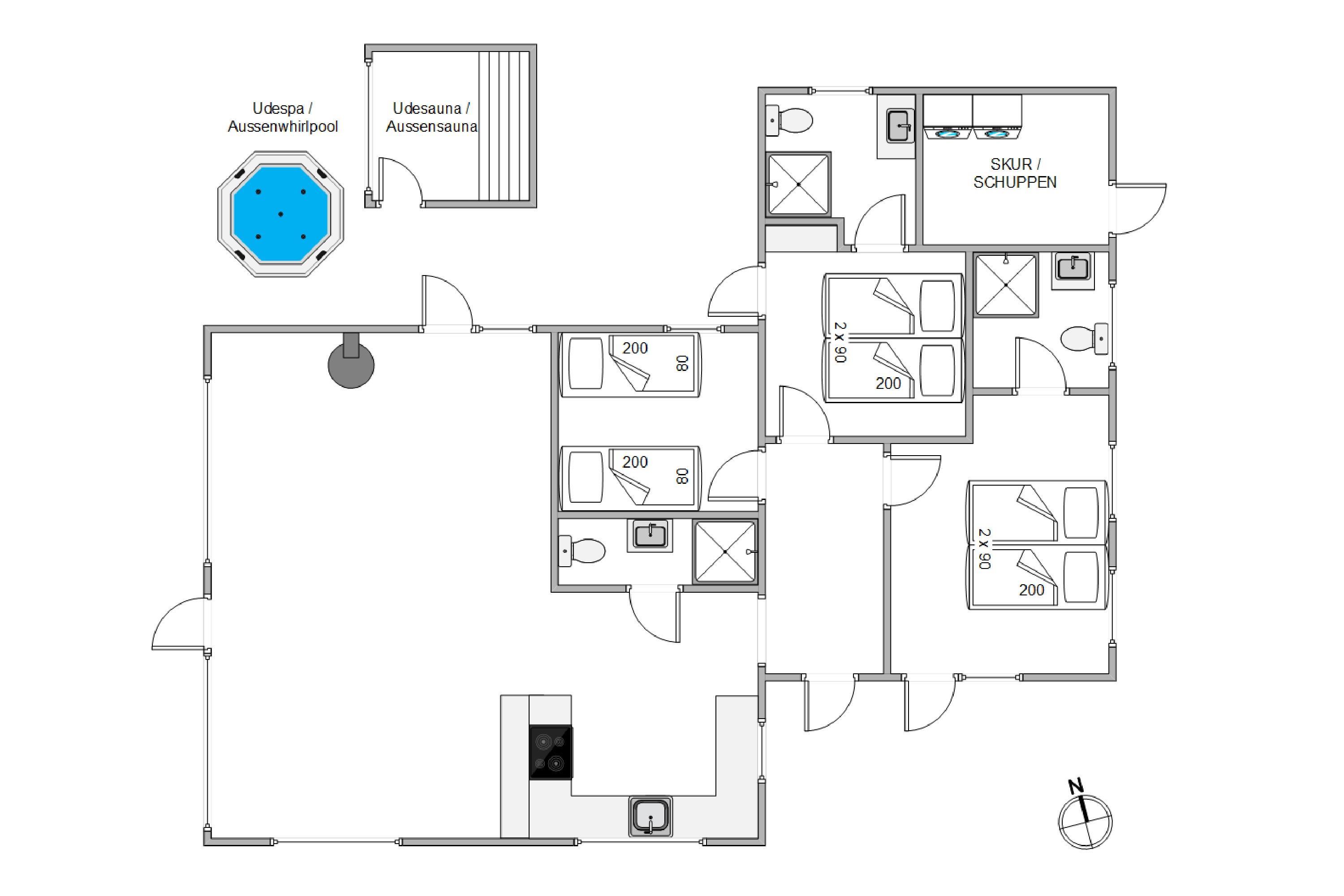 Med til feriehuset hører flere lækre terrasser til også en lukket terasse, så I trygt kan slappe af imens børnene leger rundt. Både havemøbler, liggestole og grill står klar til at give jer de skønneste feriestunder i den varme sommersol. Også i den kolde årstid er der grund til at søge ud og tilbringe tid på terrassen: Her har I nemligt jeres helt egen wellness-oase med både udendørs spa og et super lækkert saunahus!