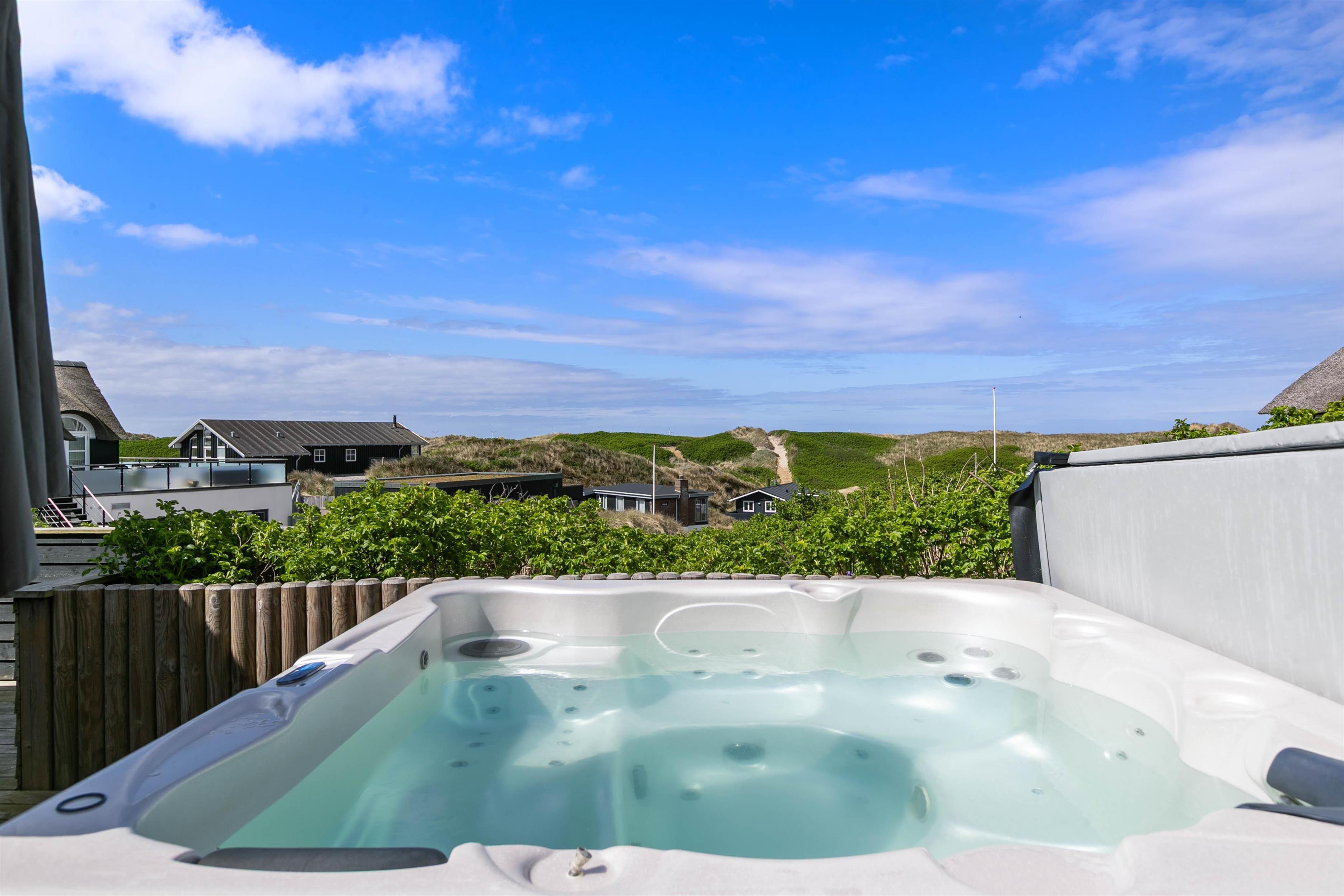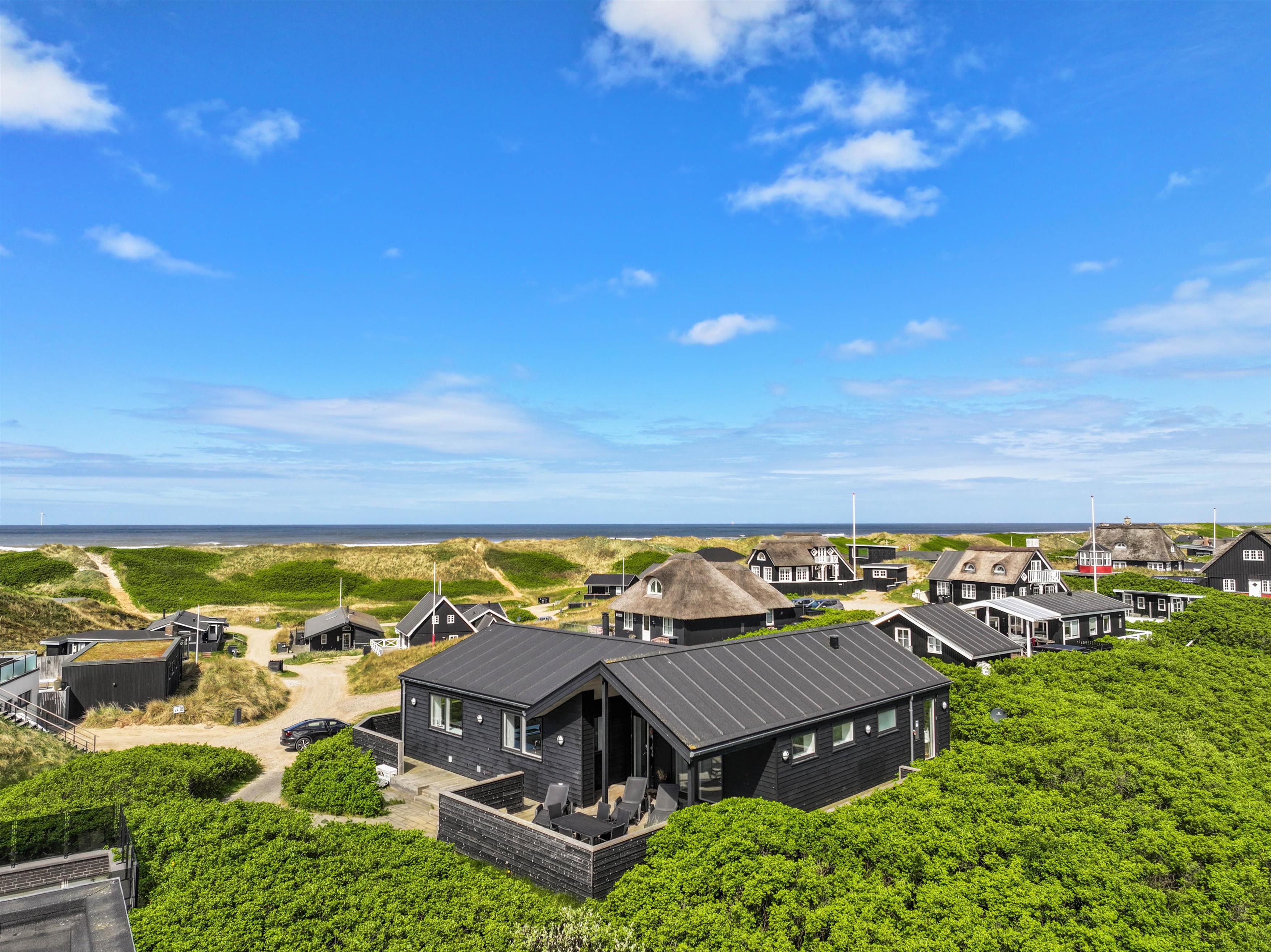 Kun 150 meter fra Vesterhavet ligger denne perle af et feriehus og venter på jer. Det femstjernede feriehus har i 2019 fået en totalrenovering, og indretningen byder på lyse og lækre materialer, flere terrasser med wellness - nyd en tur i den udendørs spa og i saunahuset. Beliggenheden er desuden helt fantastisk; ugenert og med både havkig og udsigt over Ringkøbing Fjord og Søndervig.