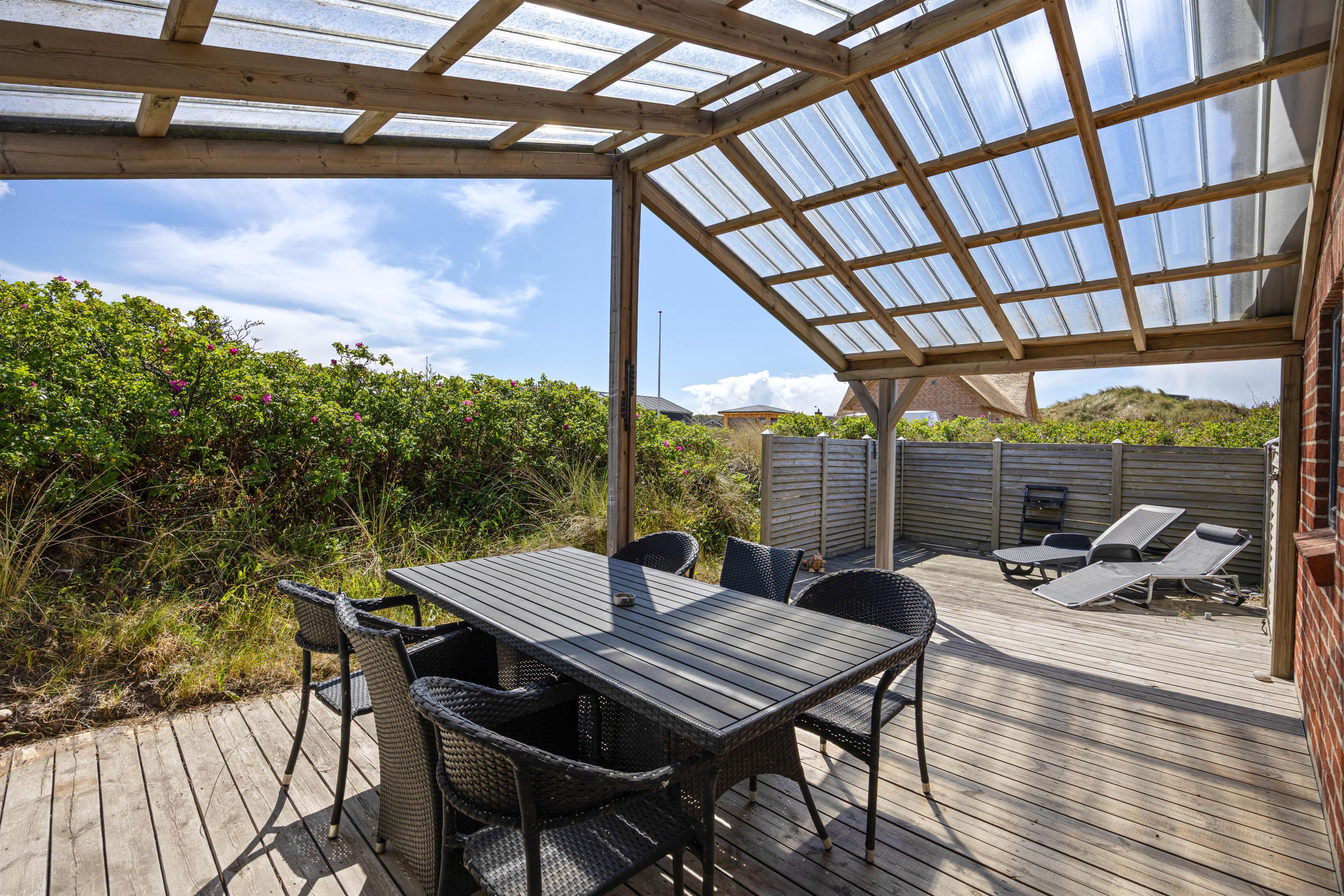 Fra stuen kommer I ud på terrassen, hvor I kan nyde den friske havluft i stort set al slags vejr. Den overdækkede del af terrassen gør, at I kan sidde i ly for regnen, og når vejret melder fuld sommersol, kan I helt uforstyrret dase på solsengene takket være den gode afskærmning.