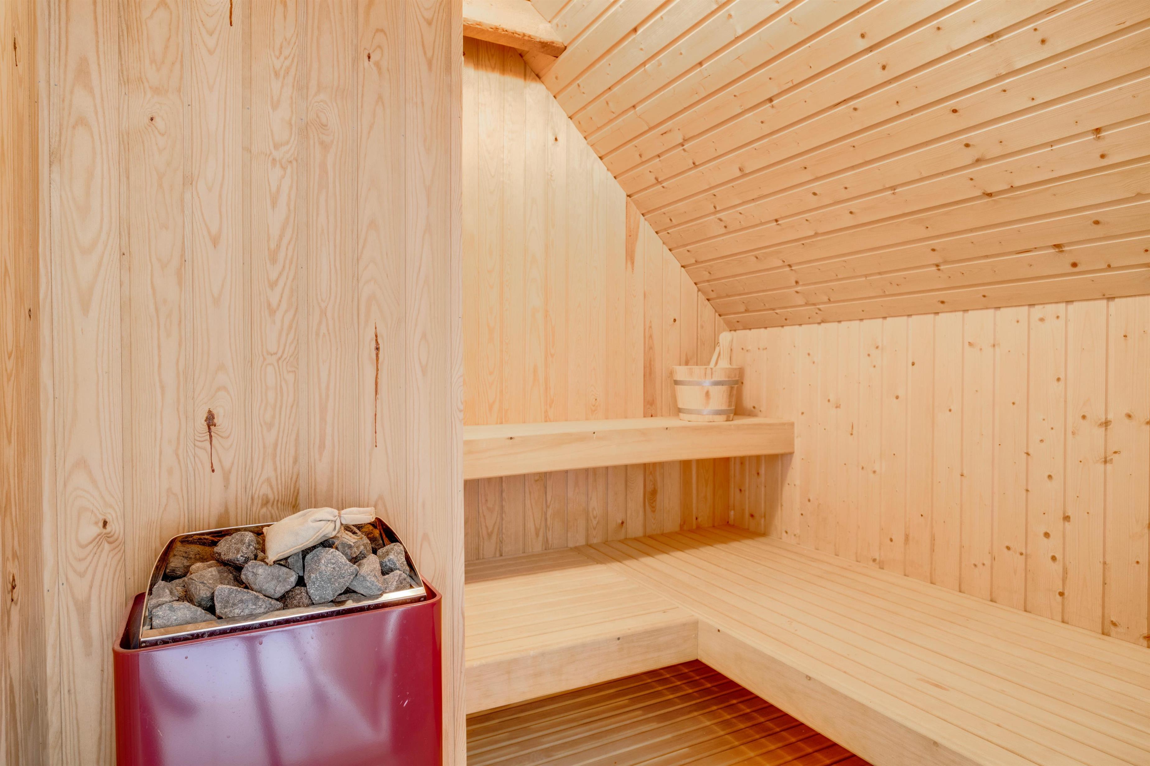 Højdepunktet i sommerhuset på Plantagevej 44 i Søndervig er den dejlige sauna, som I har adgang til fra badeværelset. I saunaen kan I sætte jer godt til rette og bare slappe fuldstændig af i varmen. I kan også sætte jer ind i saunaen efter en gåtur eller en dukkert i havet for at blive varmet igennem igen.