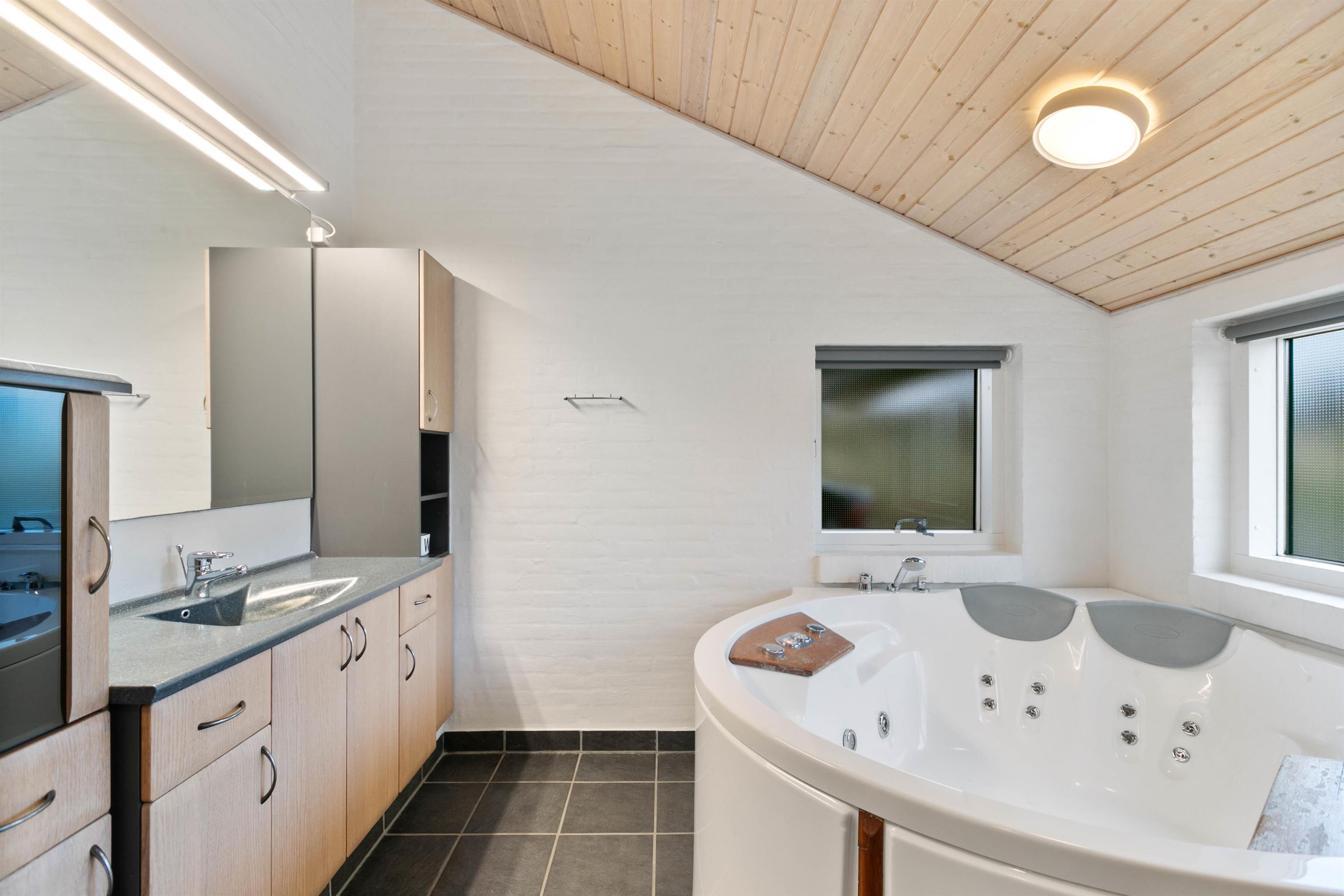 Sommerhuset er klar til at imødekomme alle jeres ønsker. Køkkenet er yderst praktisk med både opvaskemaskine og en separat fryser på 60 liter, hvilket altid er skønt og bidrager til at gøre madlavningen nemmere og mere bekvem. På badeværelserne, hvoraf det ene er udstyret med gulvvarme, kan I slappe af med en skøn tømmespa og saunaoplevelse.