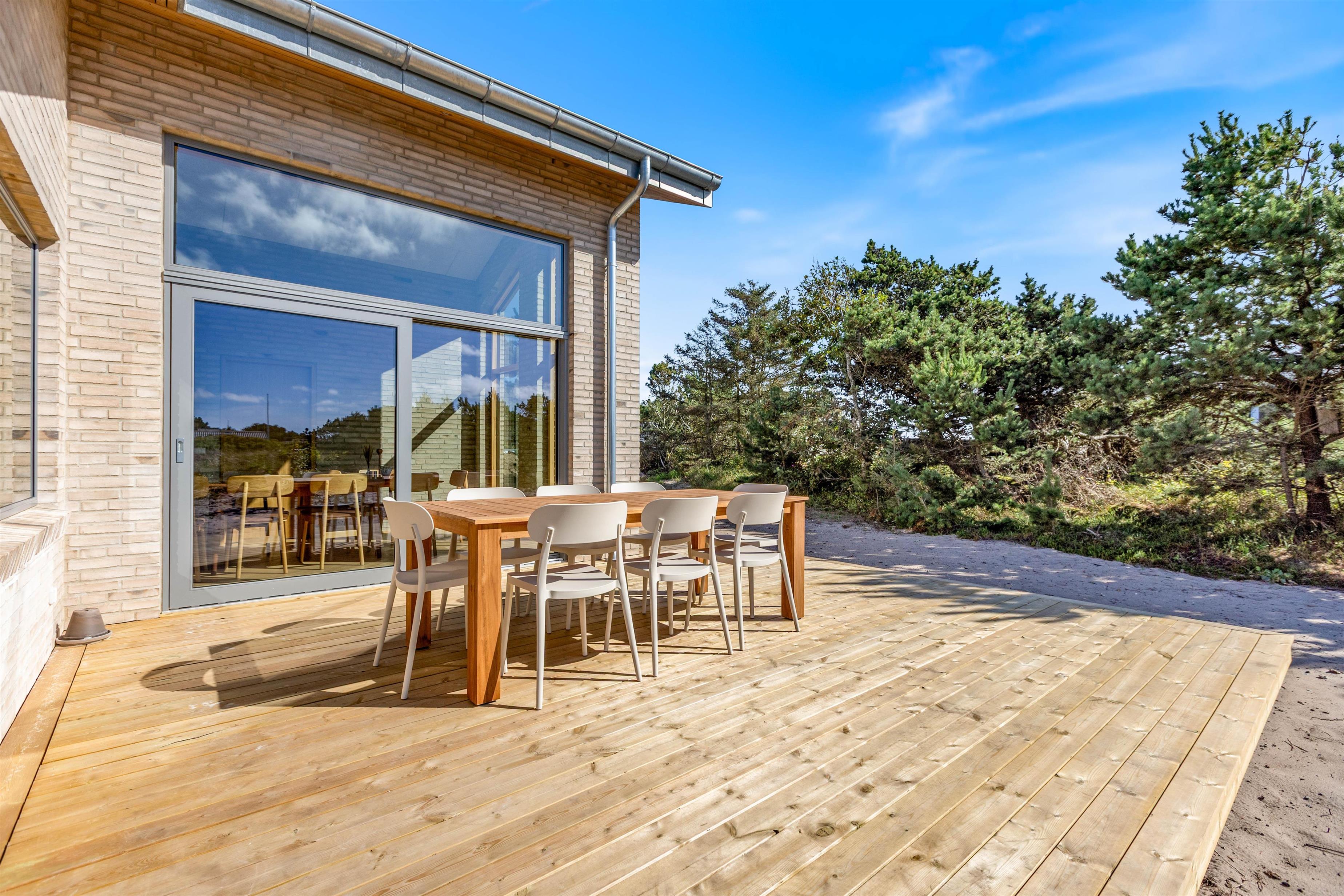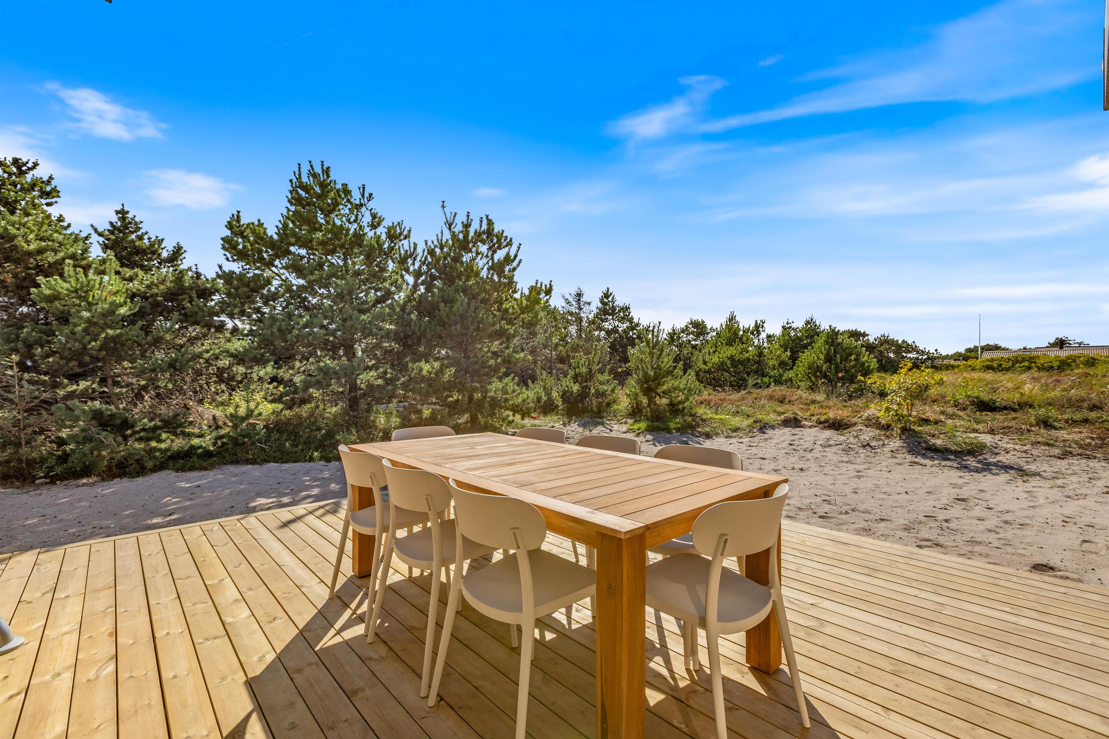 Rundt om feriehuset finder I en dejlig stor terrasse, der består af en lukket, en åben og en afskærmet del, så I kan vælge plads efter sol, skygge eller læ for vinden. Terrassen er møbleret med komfortable havemøbler og solsenge og indbyder til lange, afslappende timer udendørs på varme sommerdage.