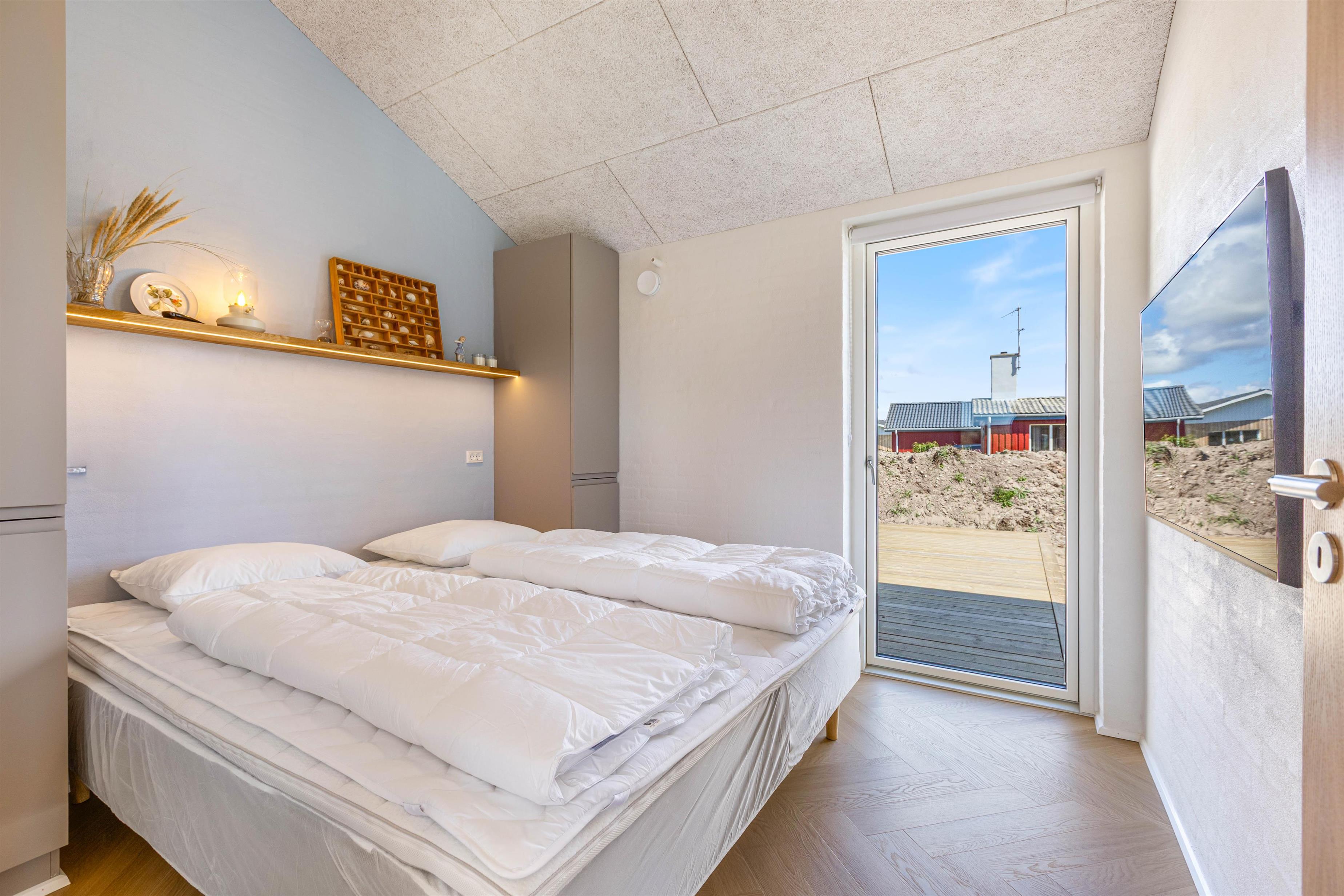 Sommerhuset byder på 4 rummelige soveværelser, alle indrettet med komfortable dobbeltsenge, så både afslapning og nattesøvn er i top. Hvert værelse har direkte adgang til terrassen gennem store terrassedøre, hvilket giver mulighed for at nyde den friske luft, morgensolen eller blot lade dagslyset strømme ind. Hertil kommer 3 moderne badeværelser, så alle nemt kan komme til om morgenen uden lange køer.