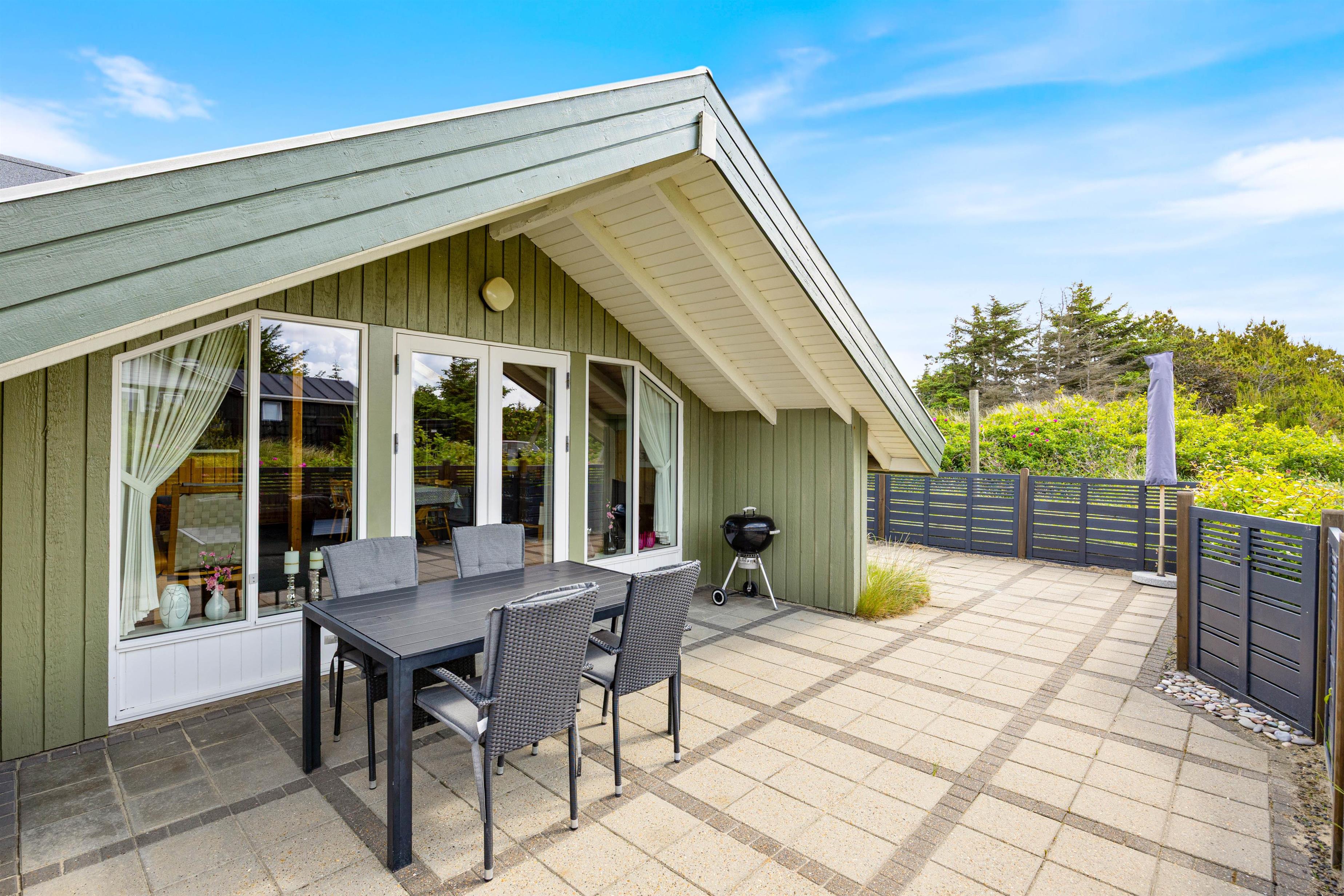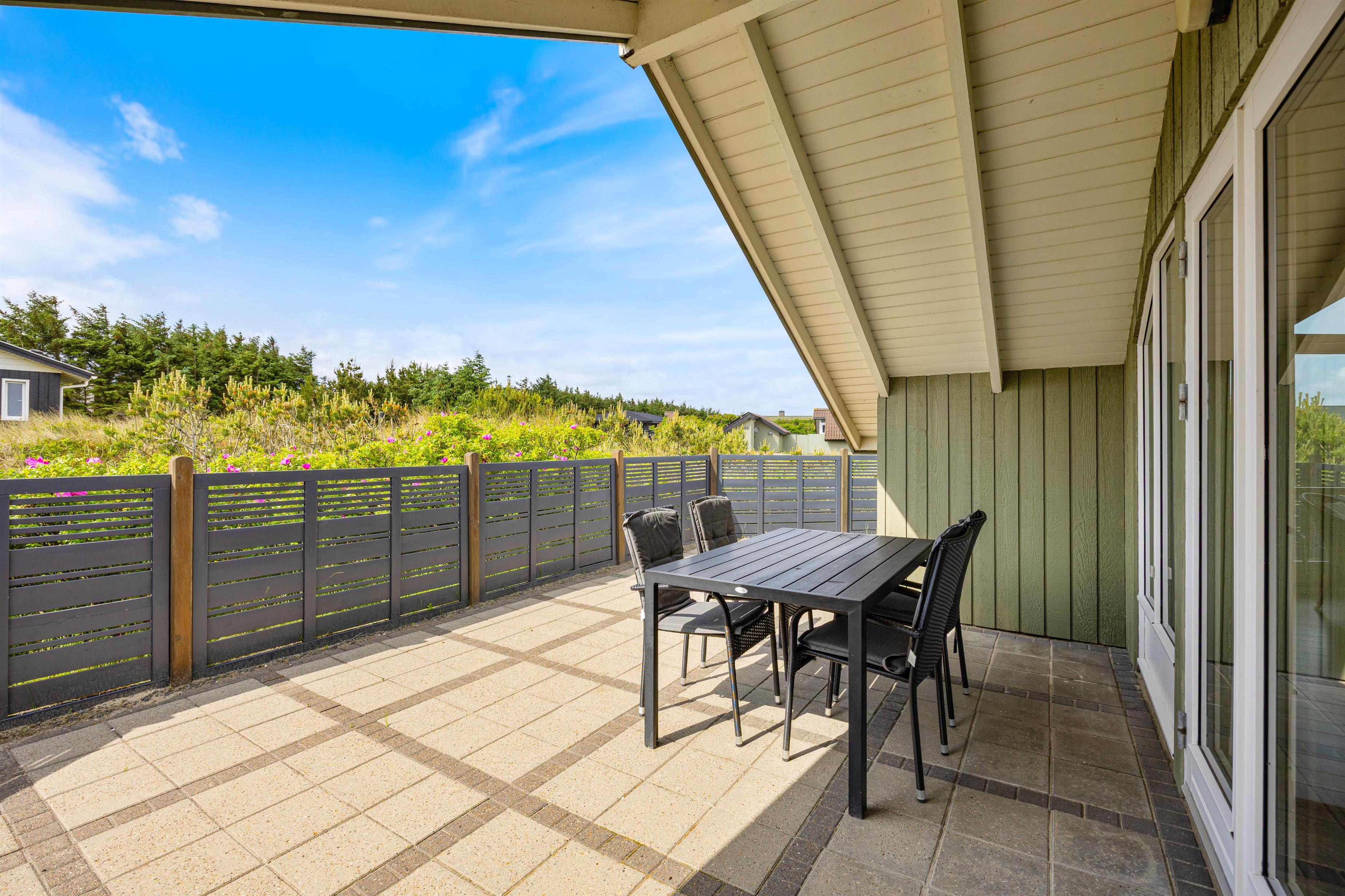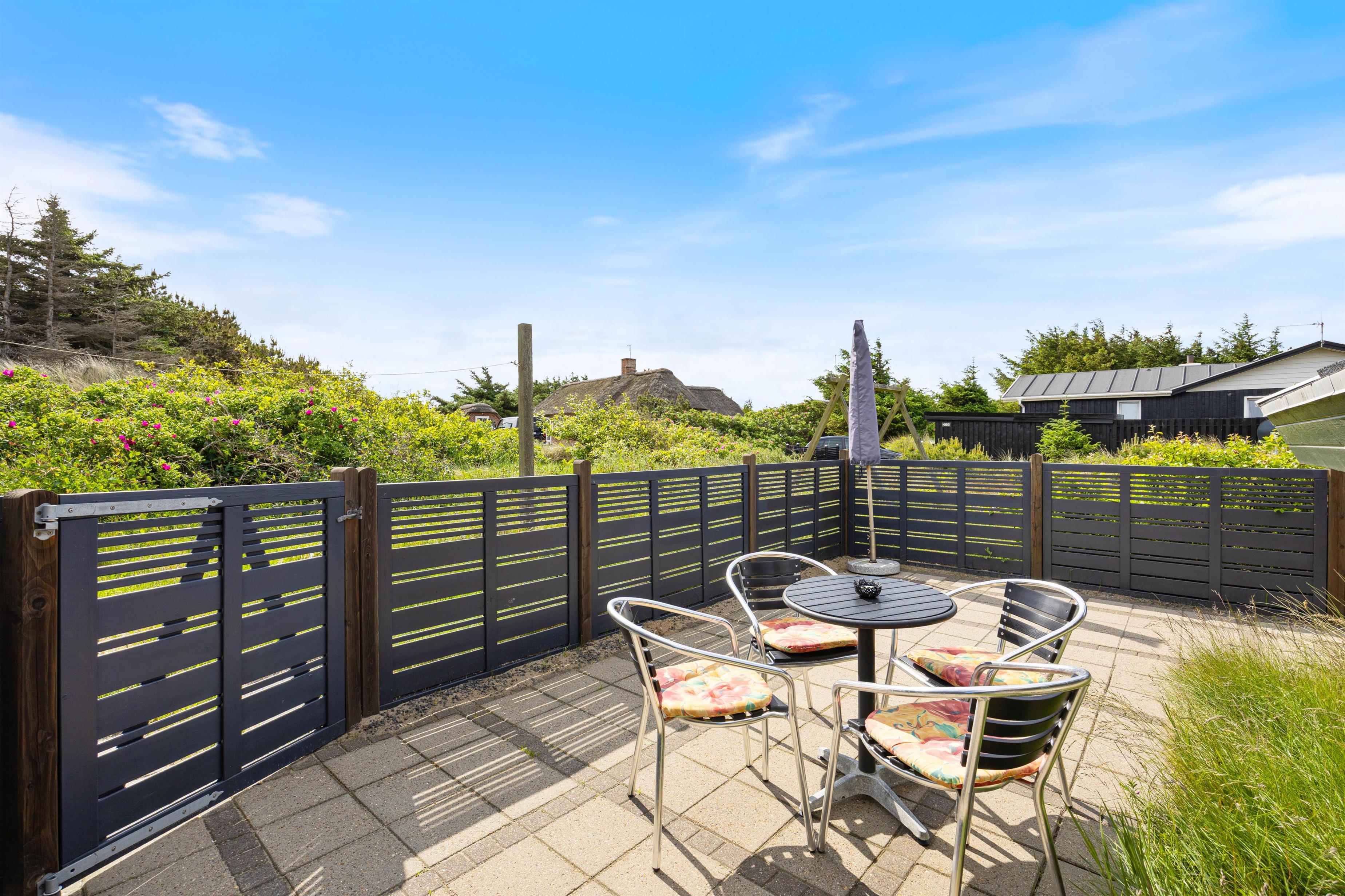 På den dejlige, lukkede terrasse finder I naturligvis havemøbler, liggestole og grill. Herfra kan ferielivets glæder og den skønne natur nydes i fulde drag. Imens I hygger og slapper af på terrassen, er der god beskæftigelse til de mindste feriegæster - der er nemlig opsat gynge og sandkasse på grunden.