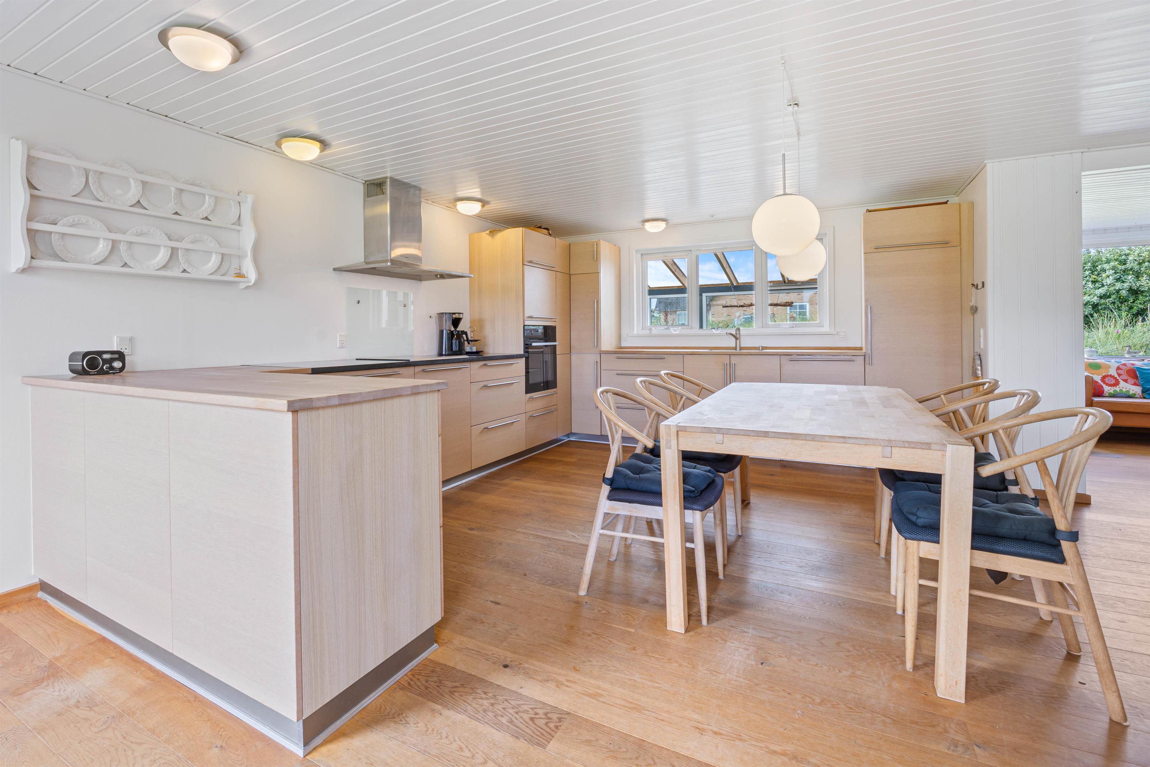 Feriehusets hjerterum er helt klart det åbne opholds- og spiseområde, som også omfatter et veludstyret køkken. Her kan man tilbringe masser af tid sammen, hvad enten man afprøver lækre opskrifter, hygger sig med spil eller ligger og hygger sig på sofaen med en god bog og lytter til brændeovnens knitren. Feriehuset indbyder til en afslappende ferie på alle tider af året, og her er masser af forskellige hyggekroge.
